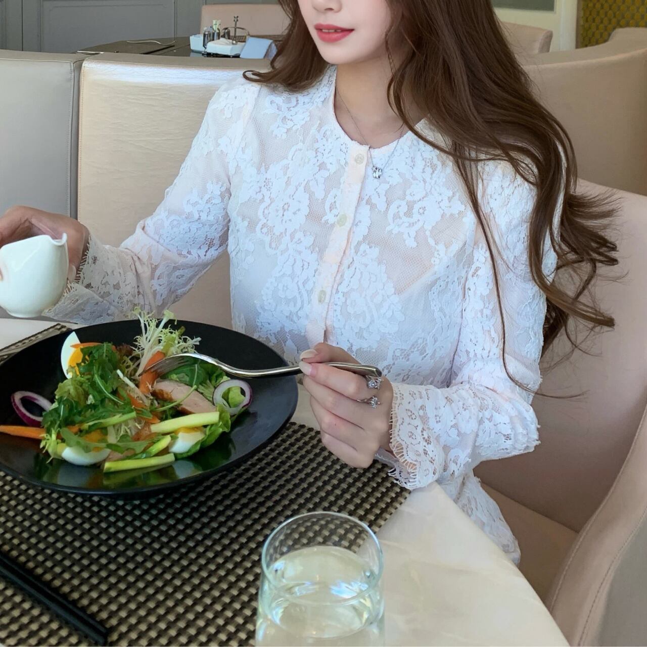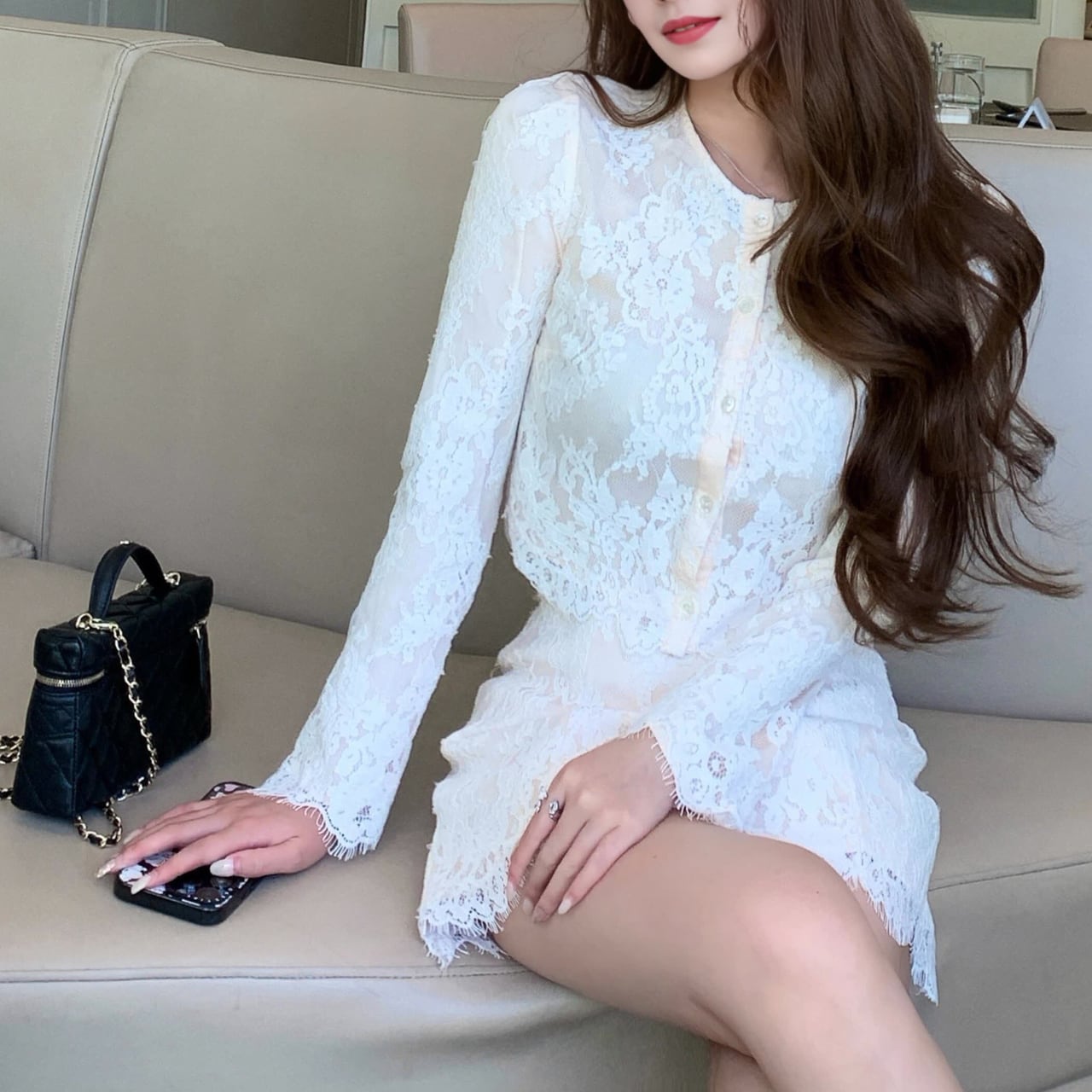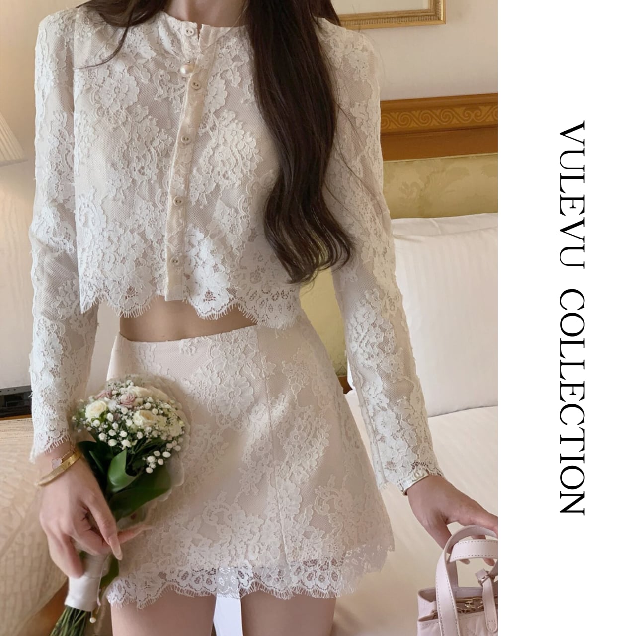 繊細なレースが華やかに映えるセットアップ。