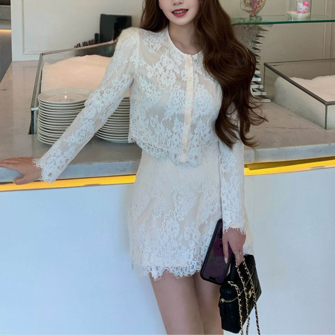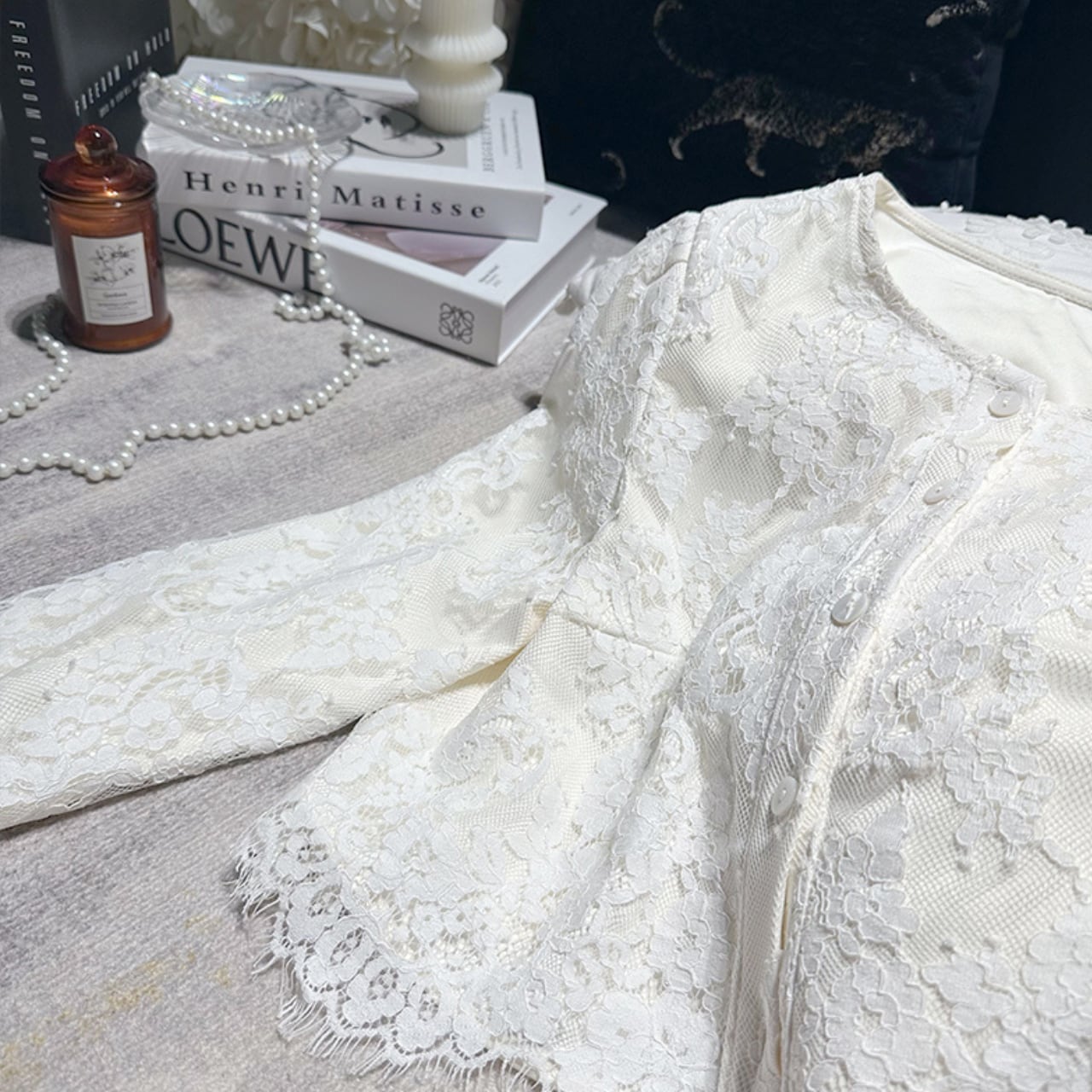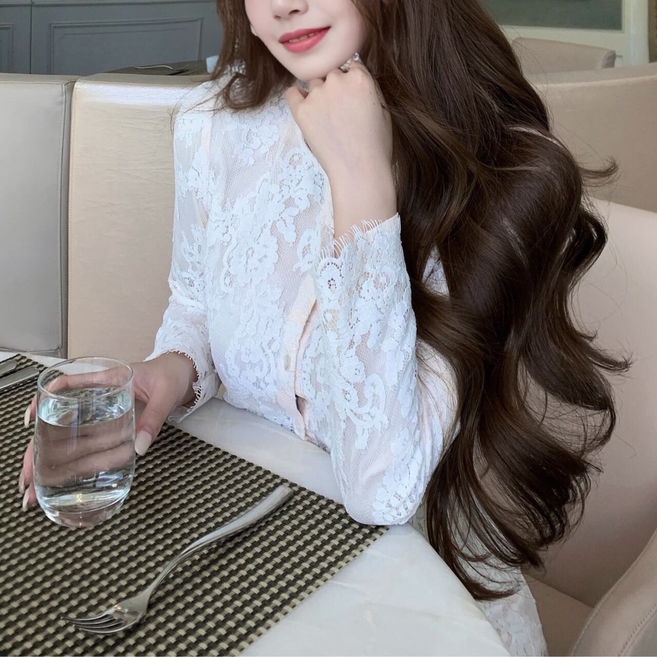 繊細なレースが華やかに映えるセットアップ。