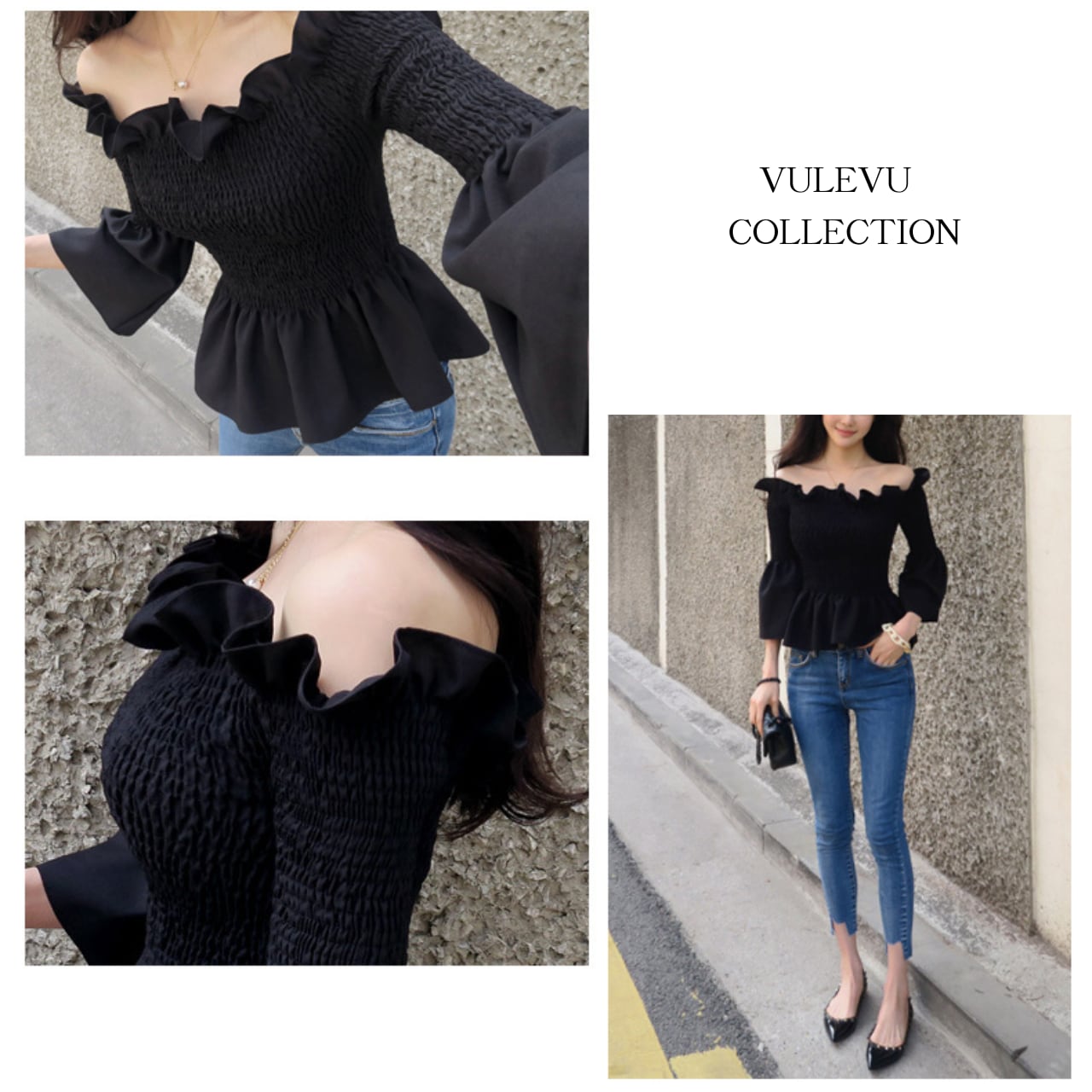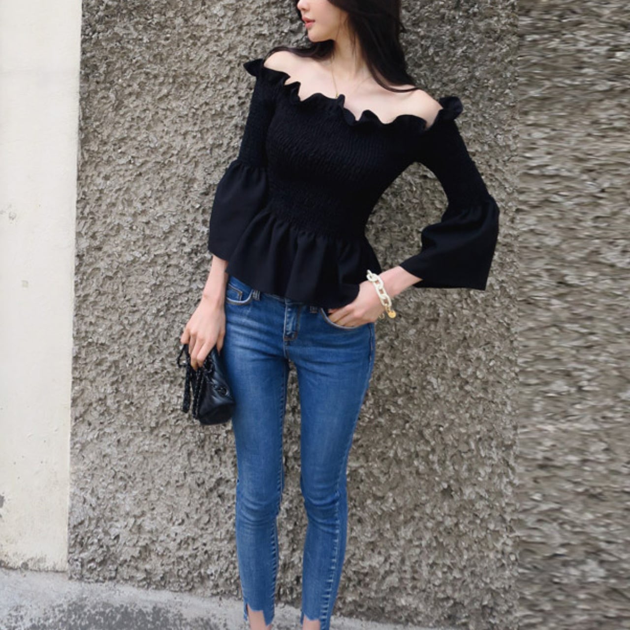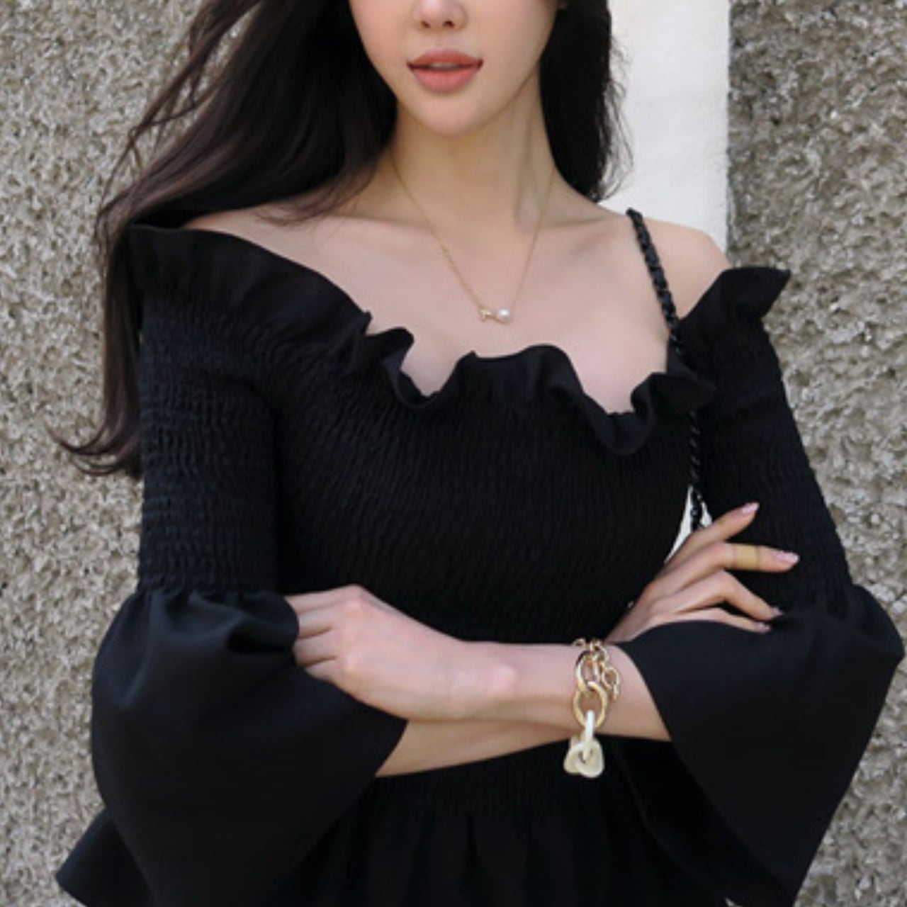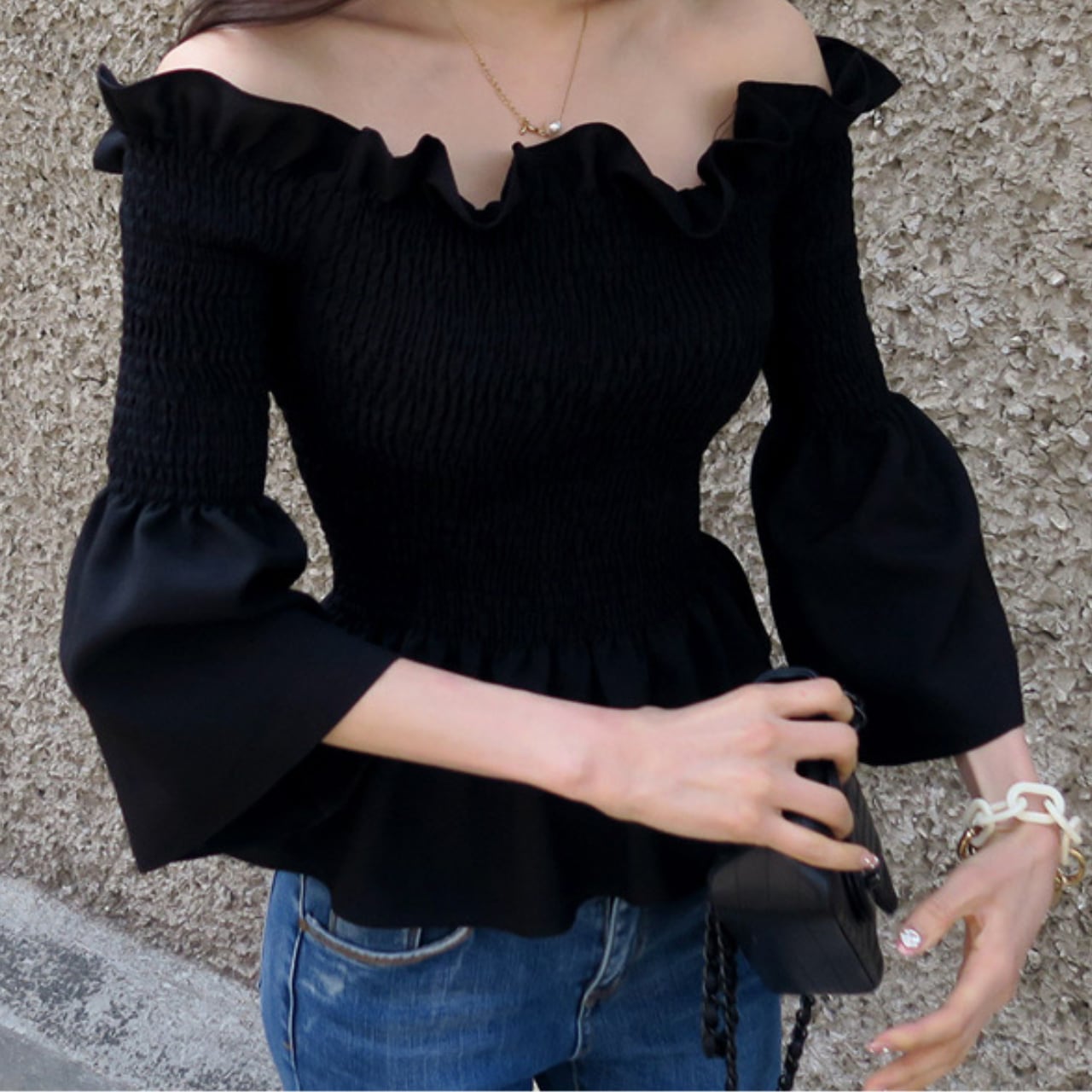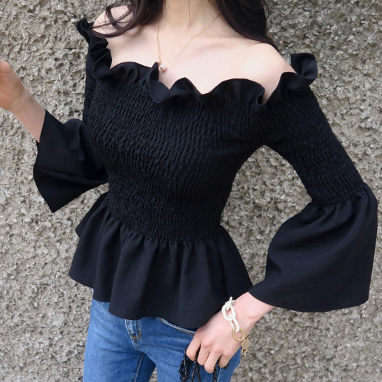 フリルオフショルダー スモッキングトップス T173