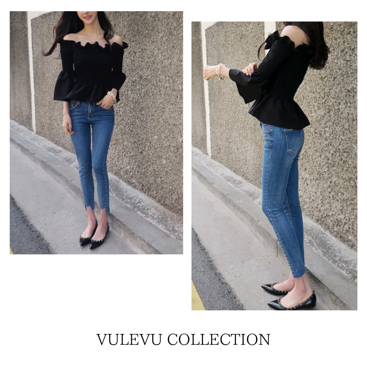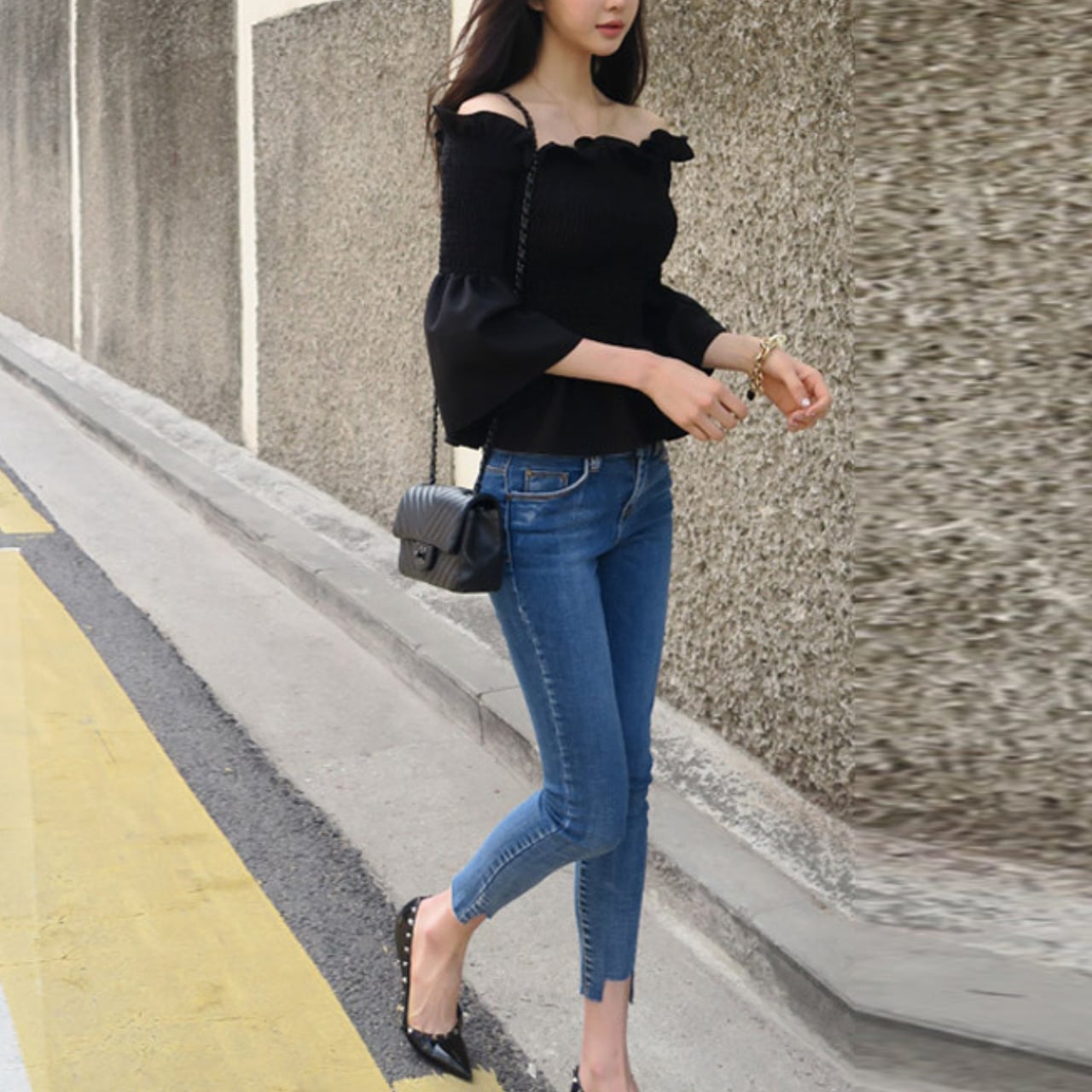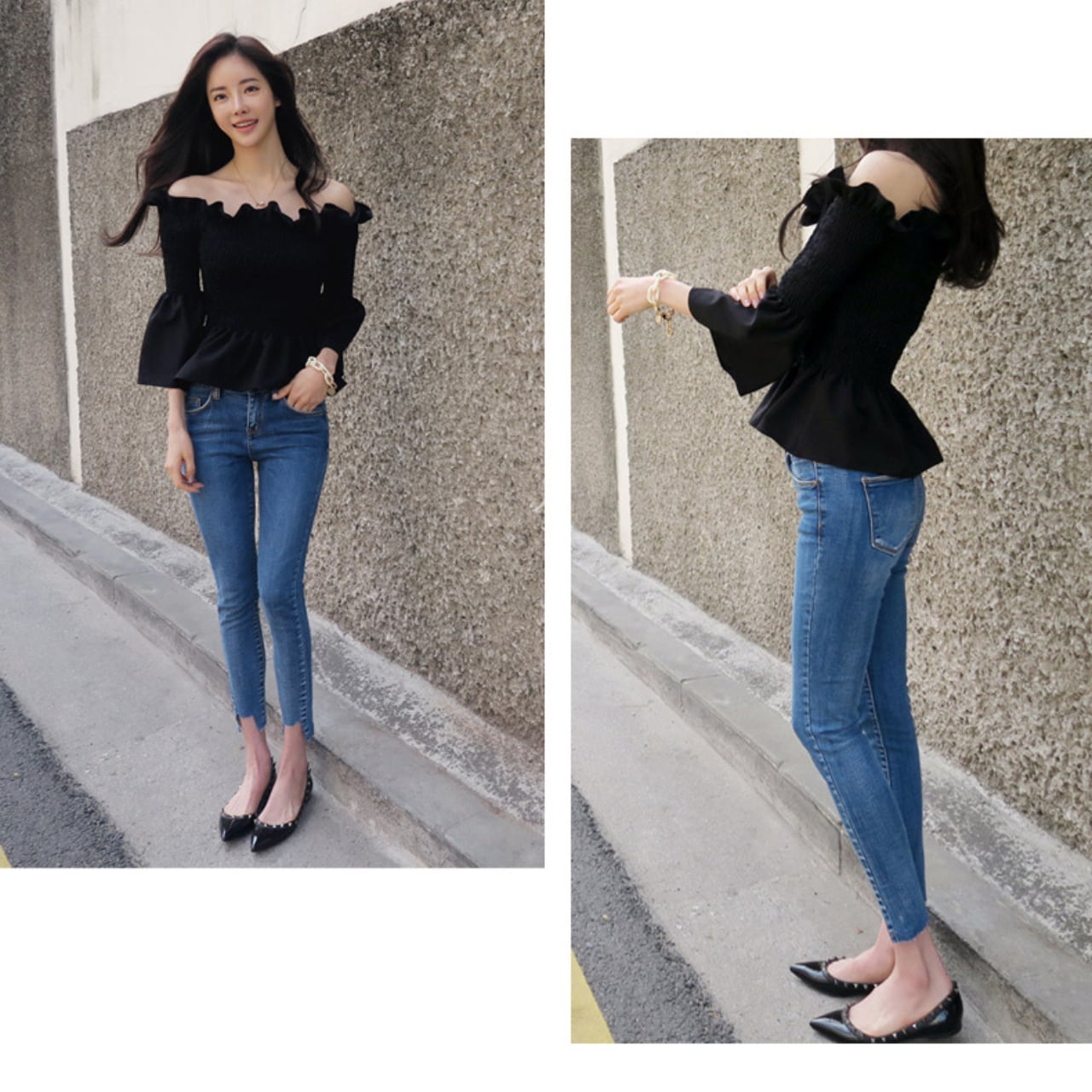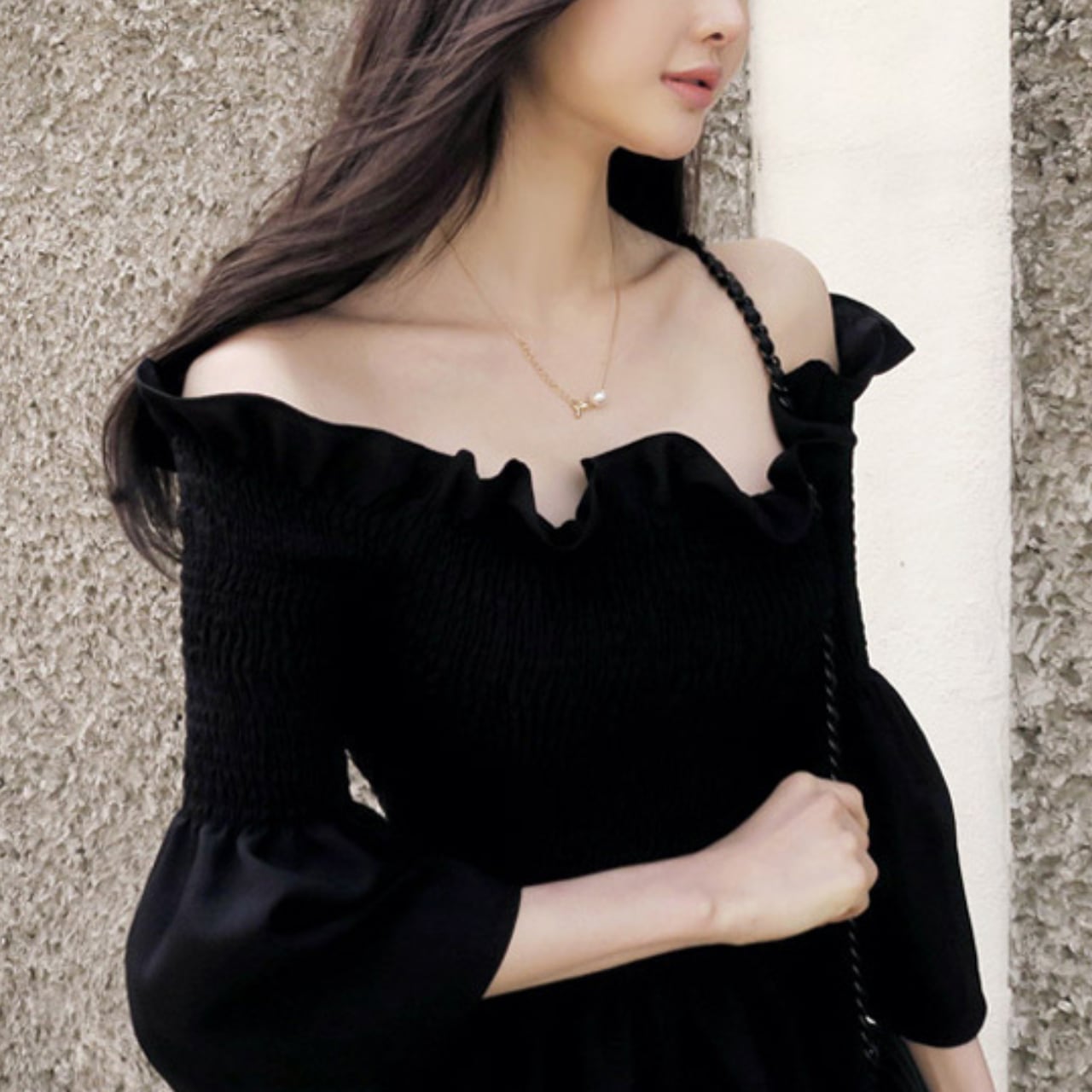 デコルテを美しく魅せるオフショルダーに、フリルをあしらったフェミニントップス。