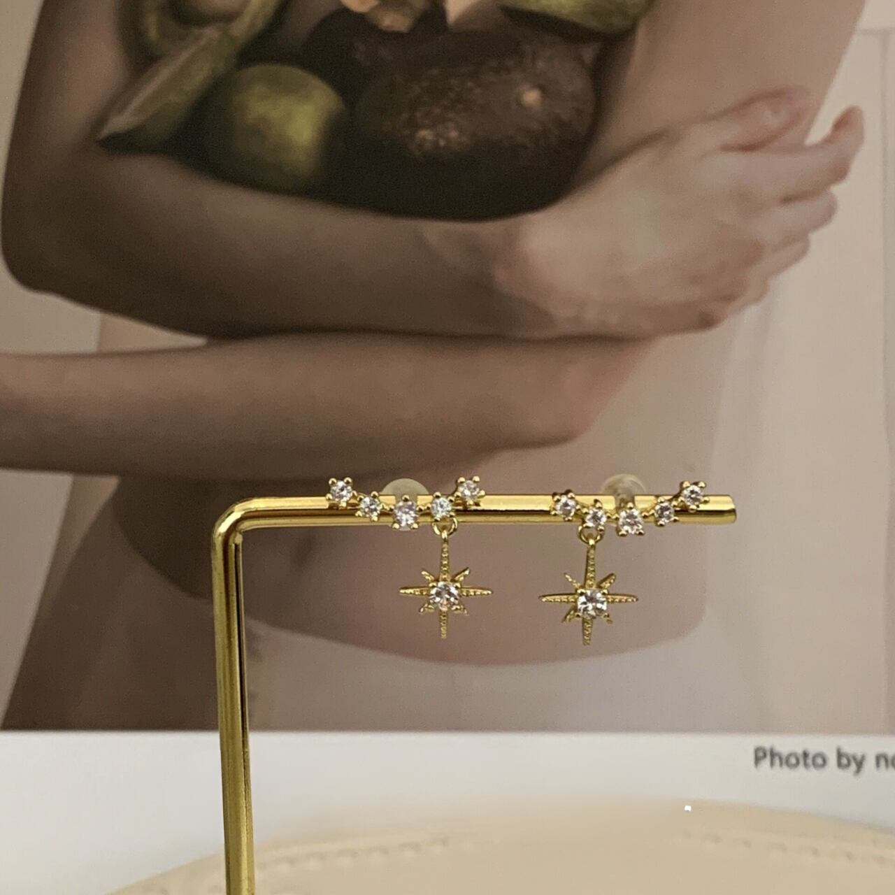 繊細なチェーンにきらめくラインストーンが並び、動くたびに揺れる星モチーフが女性らしいエレガントさを演出します。