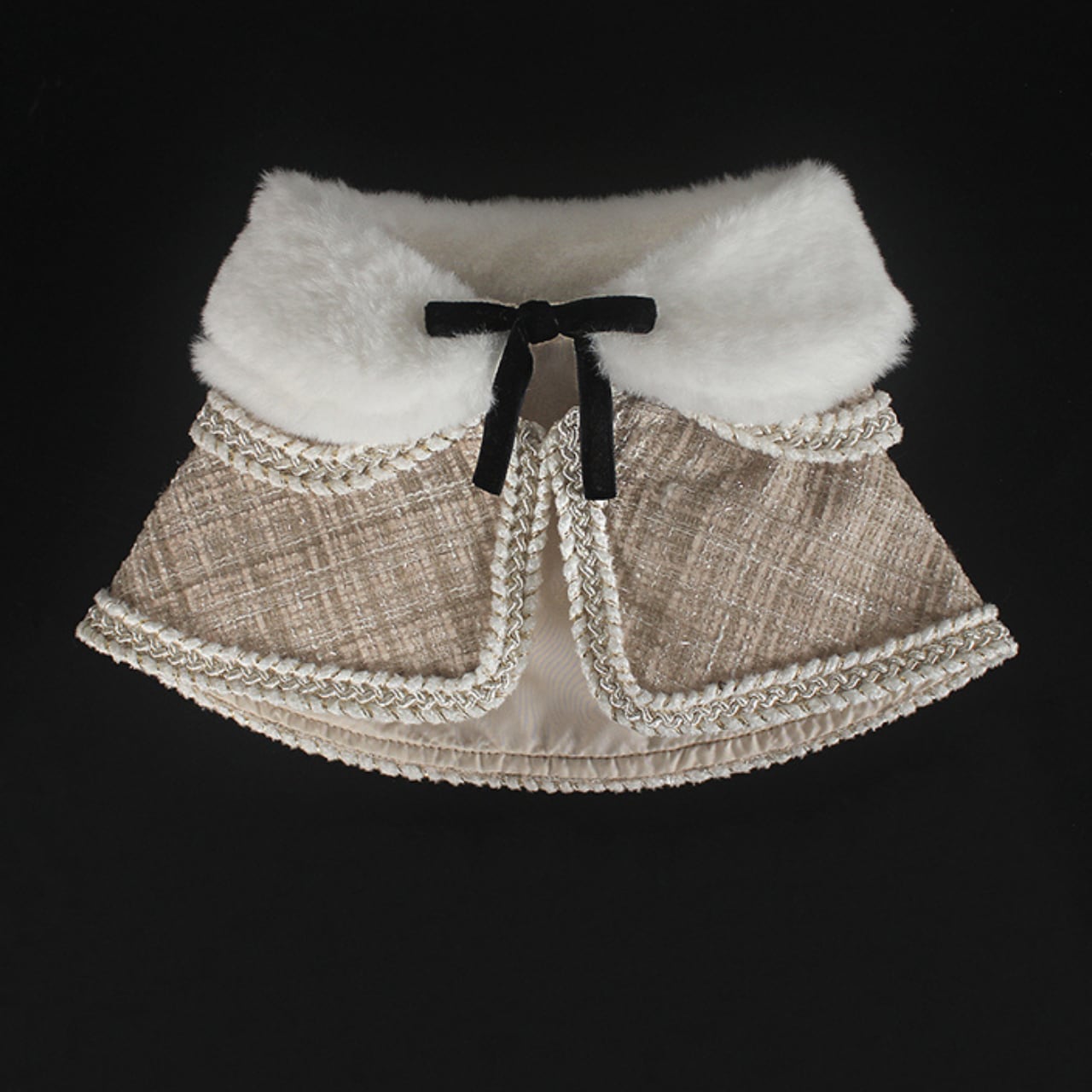 ふんわりとしたファーカラーに、クラシカルなツイード調生地を合わせた上品なマント。