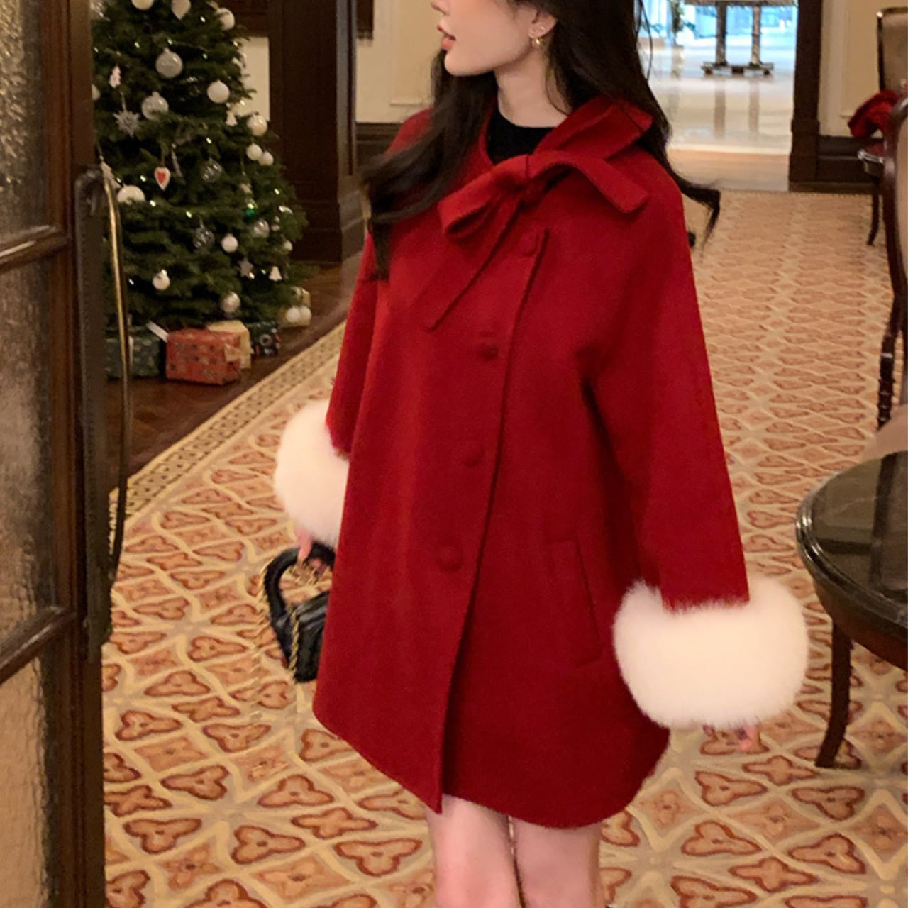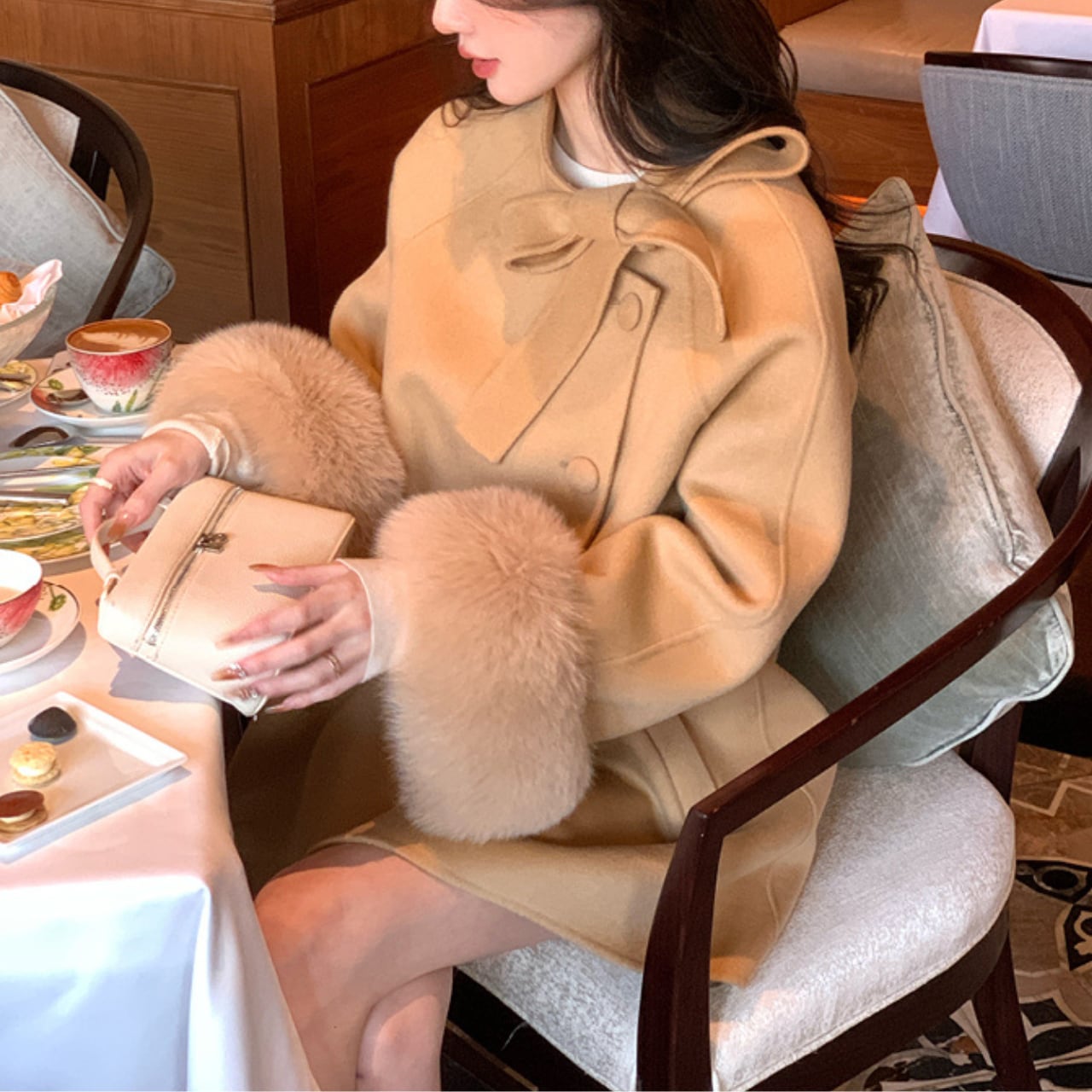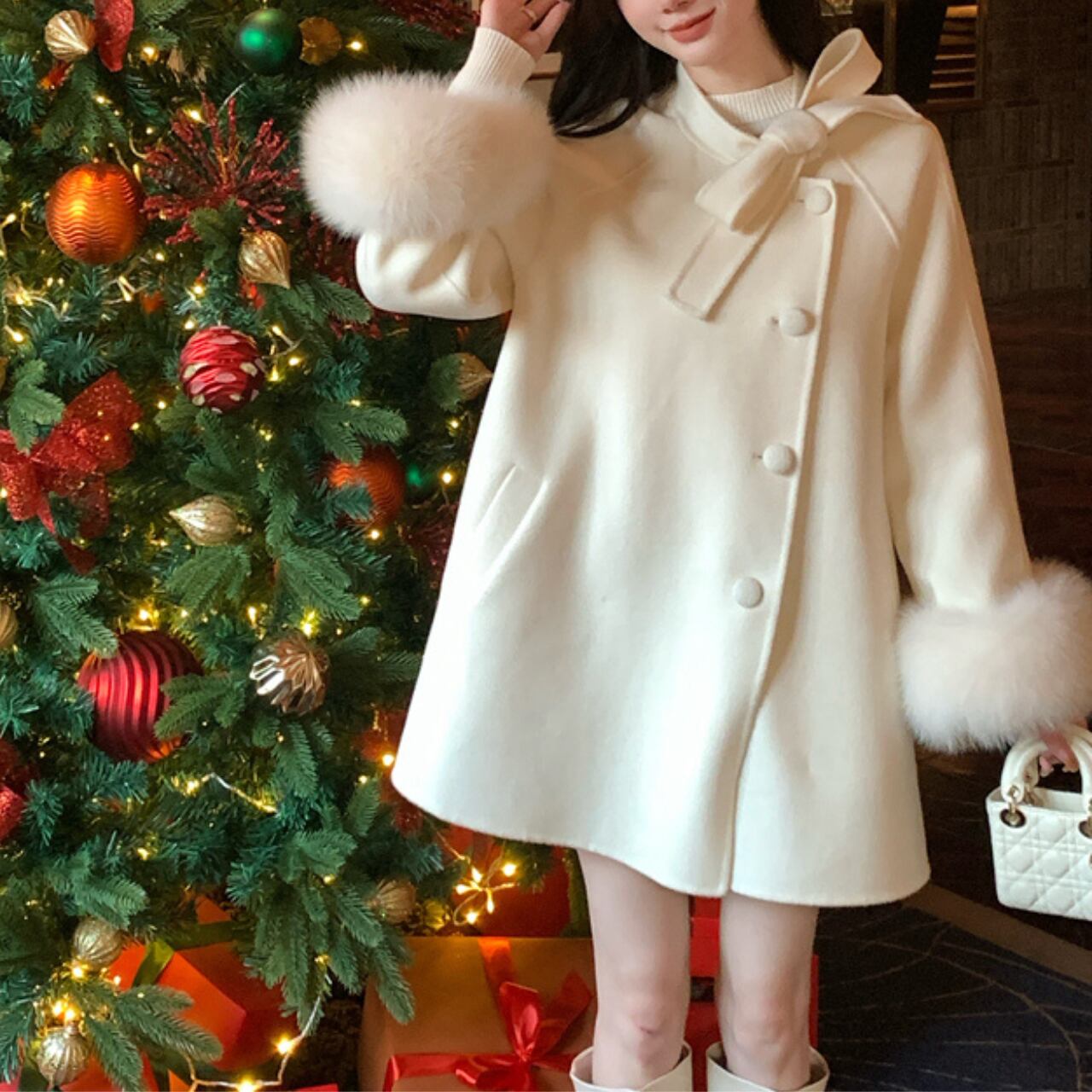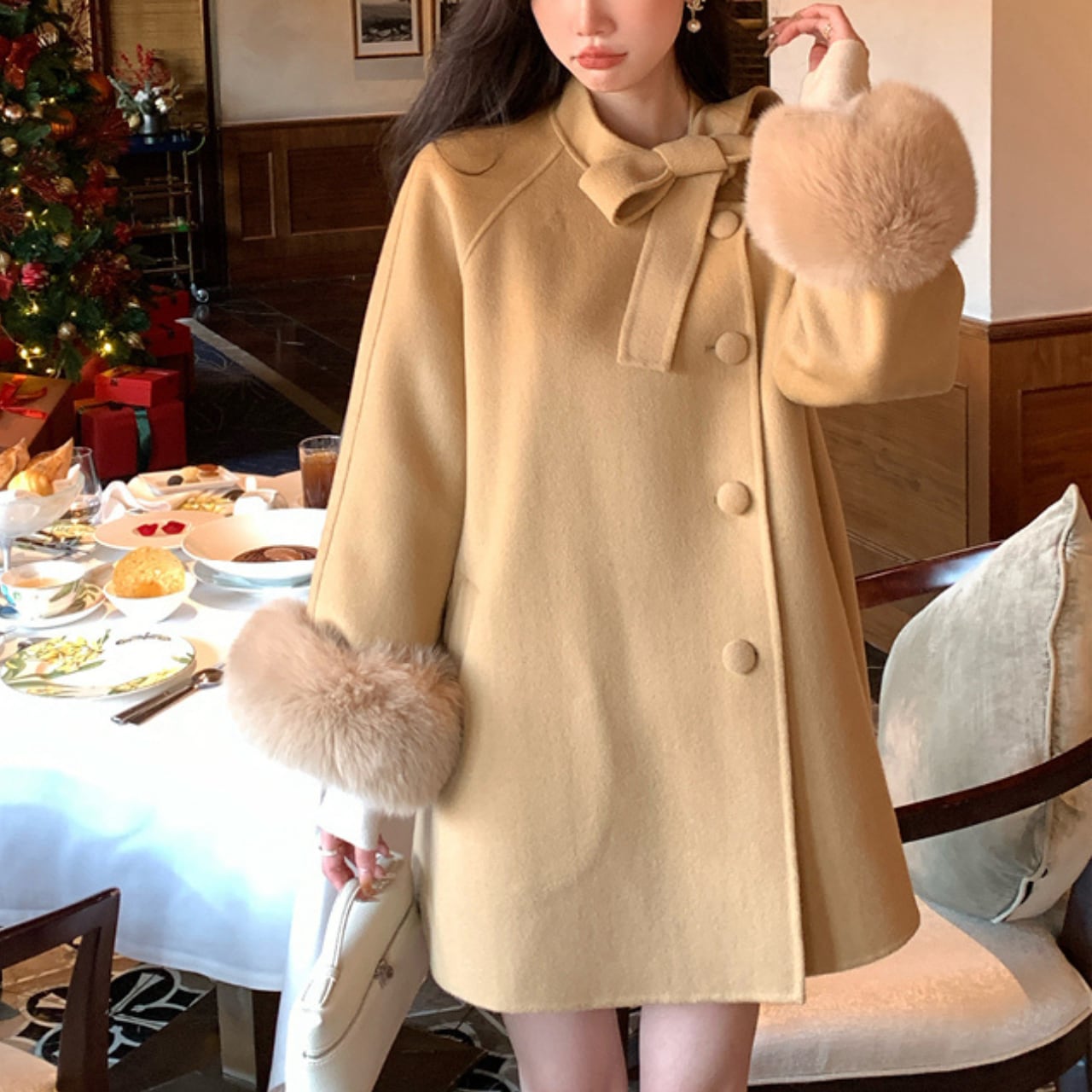 ふんわりとしたフォックスファーをあしらった、VULEVU LUXE COLLECTIONの上質ウールコート。柔らかなウール100%素材で仕立てられ、羽織るだけで洗練された気品を纏えます。 大きめのリボンとスタンドカラーがクラシカルな印象を与え、袖口のフォックスファーが冬の装いに華やぎを添えるエレガントなデザイン。 特別な日のお出かけにも、上質を感じたい日常にも寄り添う、 LUXEラインらしい洗練された一枚です。 【サイズ】 S:着丈 77cm、胸囲 99cm、袖丈 65cm M:着丈 78cm、胸囲 103cm、袖丈 66cm L:着丈 79cm、胸囲 107cm、袖丈 67cm ※採寸方法により1〜3cmの誤差がある場合がございます。 【カラー】 キャメルベージュ スノーホワイト ルージュレッド 【素材】 表地:ウール100% 袖口ファー:フォックスファー100% 【お手入れ方法】 ・ドライクリーニング推奨 ・水洗い不可 ・漂白不可 ・直射日光を避け、風通しの良い場所で陰干ししてください :::::::::::::::::::::::: 【お届けについて】 当ショップの商品は海外より取り寄せ・発送となる為 ご入金から5日〜15日前後でお届けいたします。 :::::::::::::::::::::::: ¨¨¨¨¨¨¨¨¨¨¨¨¨¨¨¨¨¨¨¨¨¨¨¨¨¨¨¨¨¨¨¨¨¨¨¨¨¨¨¨¨¨¨¨¨ 【注意事項】 ・商品到着までに2〜3週間程頂いております。 ・海外在庫のため在庫情報に時差が生じますため 在庫切れや生産中止、生産に遅れがある場合は、受注後でも キャンセルさせていただく恐れがございます。 予めご了承ください。 ・イメージ違い・サイズ違いによる交換はいたしかねます。 ・スマートフォンやパソコンの液晶の違いにより、 商品の色味に若干の差が発生する場合がございます。 ・発送時期によりデザイン仕様(素材や細部)の変更が ある場合がございます。 ¨¨¨¨¨¨¨¨¨¨¨¨¨¨¨¨¨¨¨¨¨¨¨¨¨¨¨¨¨¨¨¨¨¨¨¨¨¨¨¨¨¨¨¨¨ 【お支払い方法】 以下の各種お支払い方法をお選びいただけます。 ・BASEかんたん決済 ・クレジットカード決済(VISA/Master/JCB/AMERICAN EXPRESS) ・キャリア決済 ・コンビニ決済・Pay-easy ———————————— ご購入前にこちらをお読みください →https://vulevu.official.ec/about ————————————