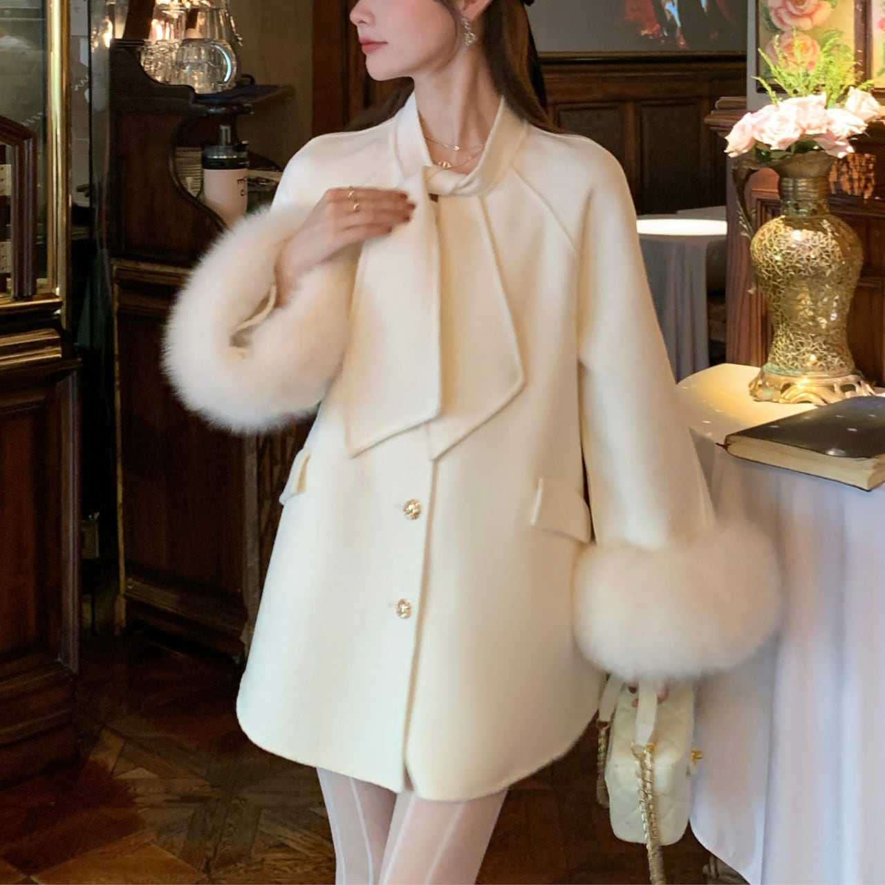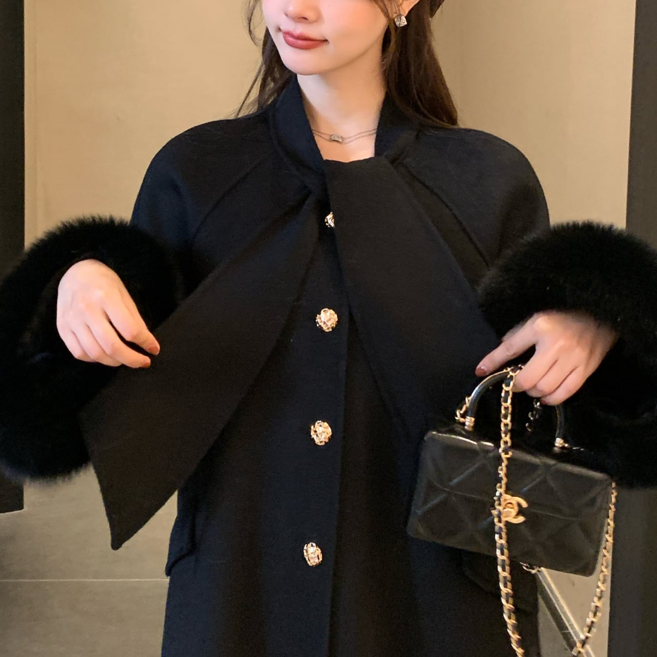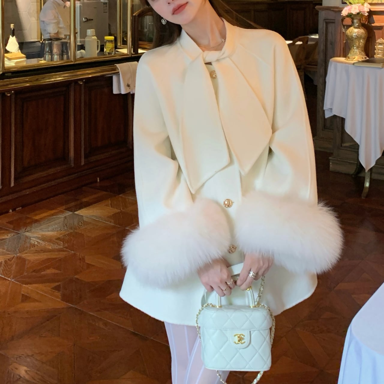 上質なウール素材を贅沢に使用した、エレガントなショートコート。 袖口のフォックスファーとフロントのリボンデザインが、クラシカルな印象を引き立てます。 ふんわりと広がるシルエットが美しく、ワンピースにもパンツスタイルにも相性抜群。 特別な日にも、日常の装いにも華やぎを添える一着です。 【サイズ】 XS:胸囲 104cm、袖丈 66cm、着丈 76cm S :胸囲 108cm、袖丈 67cm、着丈 77cm M :胸囲 112cm、袖丈 68cm、着丈 78cm ※採寸方法により1〜3cmの誤差がある場合がございます。 【カラー】 クリーミーホワイト ブラック ワインレッド 【素材】 表地:ウール100% 袖口ファー:フォックスファー100% 【お手入れ方法】 ・水洗い不可 ・専門業者によるドライクリーニング推奨 ・漂白不可 ・直射日光を避け、陰干ししてください ・ハンガーにかけて保管してください :::::::::::::::::::::::: 【お届けについて】 当ショップの商品は海外より取り寄せ・発送となる為 ご入金から5日〜15日前後でお届けいたします。 :::::::::::::::::::::::: ¨¨¨¨¨¨¨¨¨¨¨¨¨¨¨¨¨¨¨¨¨¨¨¨¨¨¨¨¨¨¨¨¨¨¨¨¨¨¨¨¨¨¨¨¨ 【注意事項】 ・商品到着までに2〜3週間程頂いております。 ・海外在庫のため在庫情報に時差が生じますため 在庫切れや生産中止、生産に遅れがある場合は、受注後でも キャンセルさせていただく恐れがございます。 予めご了承ください。 ・イメージ違い・サイズ違いによる交換はいたしかねます。 ・スマートフォンやパソコンの液晶の違いにより、 商品の色味に若干の差が発生する場合がございます。 ・発送時期によりデザイン仕様(素材や細部)の変更が ある場合がございます。 ¨¨¨¨¨¨¨¨¨¨¨¨¨¨¨¨¨¨¨¨¨¨¨¨¨¨¨¨¨¨¨¨¨¨¨¨¨¨¨¨¨¨¨¨¨ 【お支払い方法】 以下の各種お支払い方法をお選びいただけます。 ・BASEかんたん決済 ・クレジットカード決済(VISA/Master/JCB/AMERICAN EXPRESS) ・キャリア決済 ・コンビニ決済・Pay-easy ———————————— ご購入前にこちらをお読みください →https://vulevu.official.ec/about ————————————