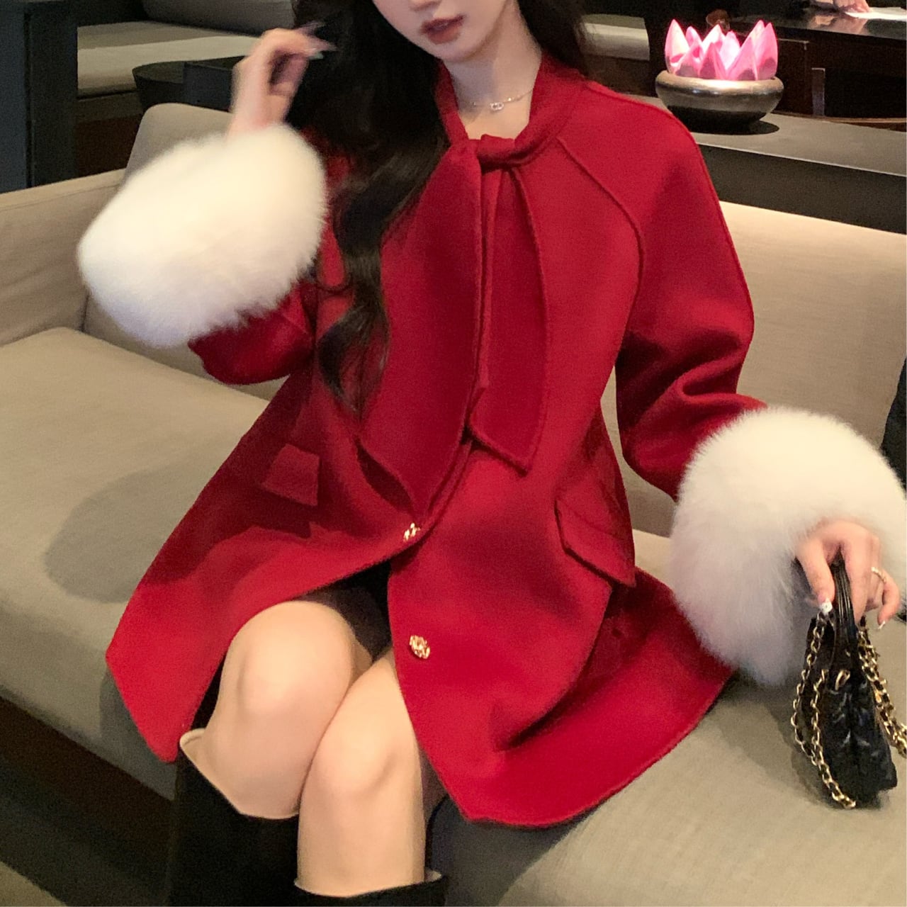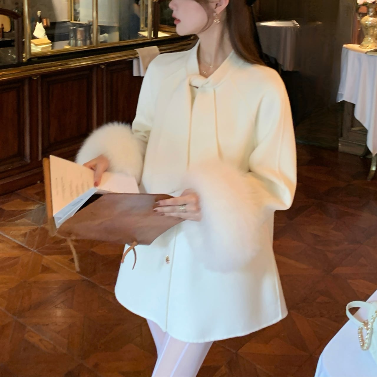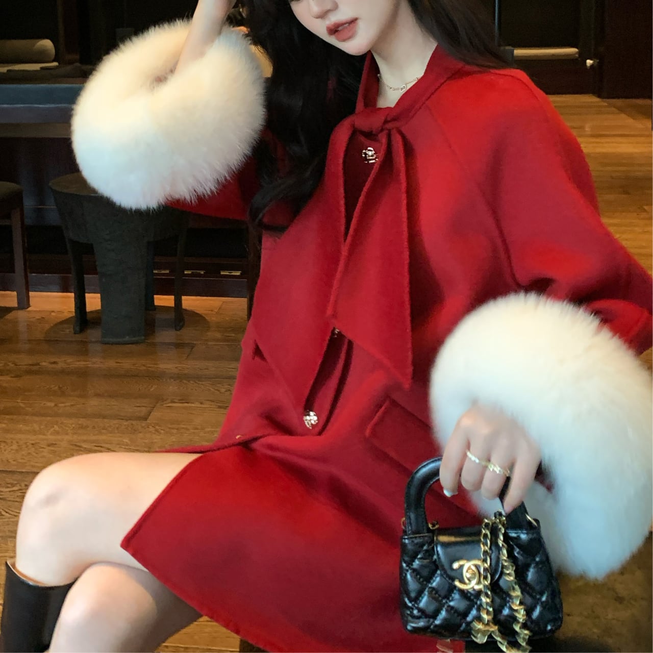 上質なウール素材を贅沢に使用した、エレガントなショートコート。 袖口のフォックスファーとフロントのリボンデザインが、クラシカルな印象を引き立てます。 ふんわりと広がるシルエットが美しく、ワンピースにもパンツスタイルにも相性抜群。 特別な日にも、日常の装いにも華やぎを添える一着です。 【サイズ】 XS:胸囲 104cm、袖丈 66cm、着丈 76cm S :胸囲 108cm、袖丈 67cm、着丈 77cm M :胸囲 112cm、袖丈 68cm、着丈 78cm ※採寸方法により1〜3cmの誤差がある場合がございます。 【カラー】 クリーミーホワイト ブラック ワインレッド 【素材】 表地:ウール100% 袖口ファー:フォックスファー100% 【お手入れ方法】 ・水洗い不可 ・専門業者によるドライクリーニング推奨 ・漂白不可 ・直射日光を避け、陰干ししてください ・ハンガーにかけて保管してください :::::::::::::::::::::::: 【お届けについて】 当ショップの商品は海外より取り寄せ・発送となる為 ご入金から5日〜15日前後でお届けいたします。 :::::::::::::::::::::::: ¨¨¨¨¨¨¨¨¨¨¨¨¨¨¨¨¨¨¨¨¨¨¨¨¨¨¨¨¨¨¨¨¨¨¨¨¨¨¨¨¨¨¨¨¨ 【注意事項】 ・商品到着までに2〜3週間程頂いております。 ・海外在庫のため在庫情報に時差が生じますため 在庫切れや生産中止、生産に遅れがある場合は、受注後でも キャンセルさせていただく恐れがございます。 予めご了承ください。 ・イメージ違い・サイズ違いによる交換はいたしかねます。 ・スマートフォンやパソコンの液晶の違いにより、 商品の色味に若干の差が発生する場合がございます。 ・発送時期によりデザイン仕様(素材や細部)の変更が ある場合がございます。 ¨¨¨¨¨¨¨¨¨¨¨¨¨¨¨¨¨¨¨¨¨¨¨¨¨¨¨¨¨¨¨¨¨¨¨¨¨¨¨¨¨¨¨¨¨ 【お支払い方法】 以下の各種お支払い方法をお選びいただけます。 ・BASEかんたん決済 ・クレジットカード決済(VISA/Master/JCB/AMERICAN EXPRESS) ・キャリア決済 ・コンビニ決済・Pay-easy ———————————— ご購入前にこちらをお読みください →https://vulevu.official.ec/about ————————————