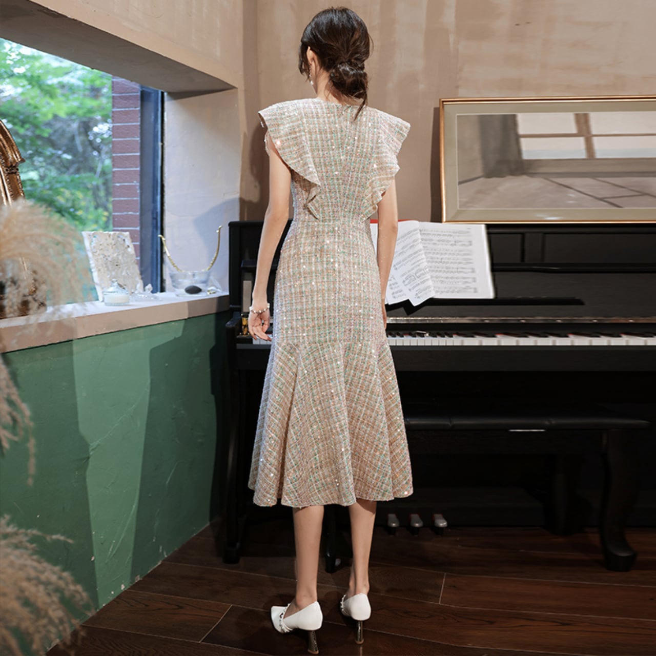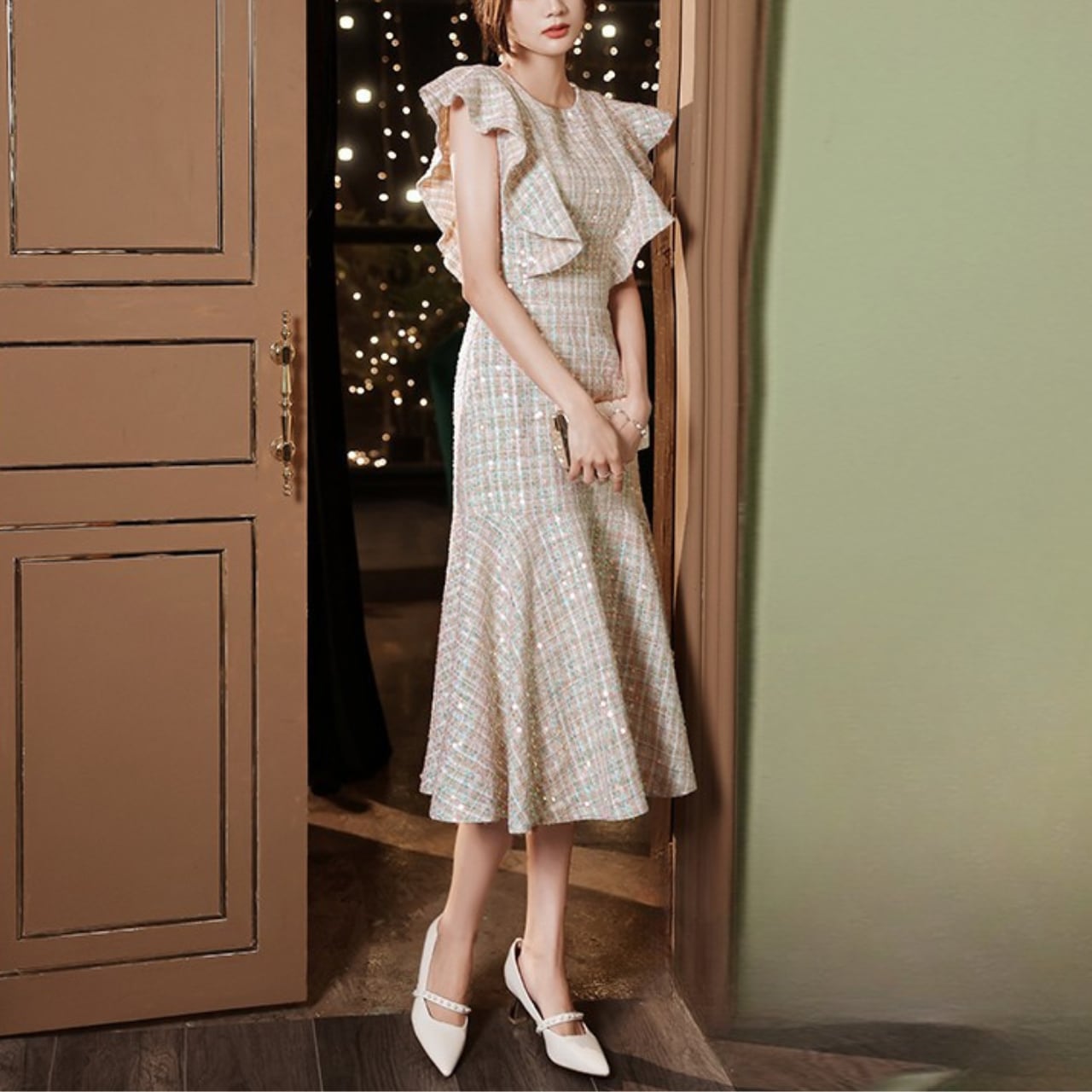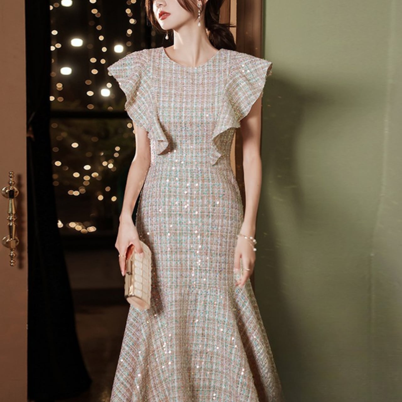 上質なツイード素材に繊細なラメが織り込まれ、光の角度でほのかにきらめくエレガントな一着。立体感のあるフリルスリーブが顔まわりを優しく包み込み、華やかで上品な印象を演出します。ウエストから裾にかけて流れるように広がるフィッシュテールシルエットは、歩くたびに優美な余韻を残します。コートを羽織れば、まるでクリスマスや特別な夜の装いにふさわしいラグジュアリーなムードに。