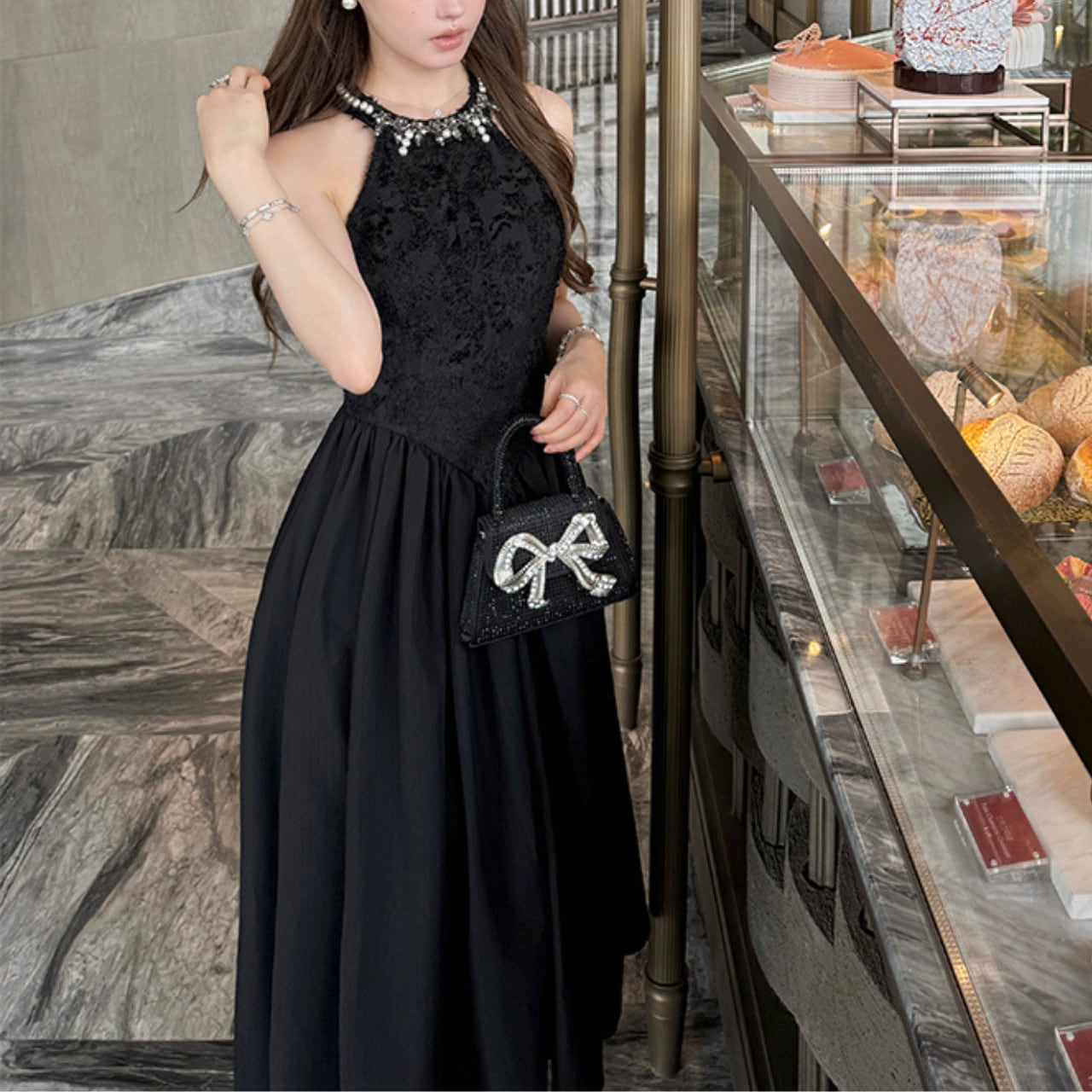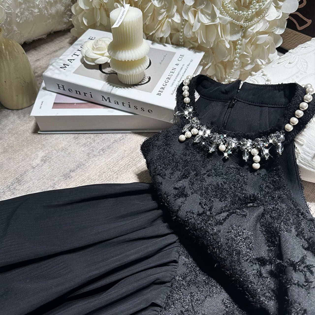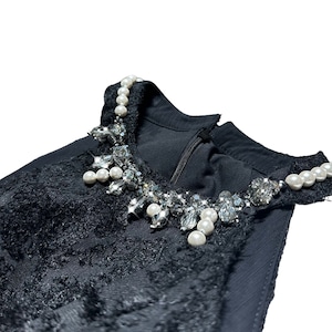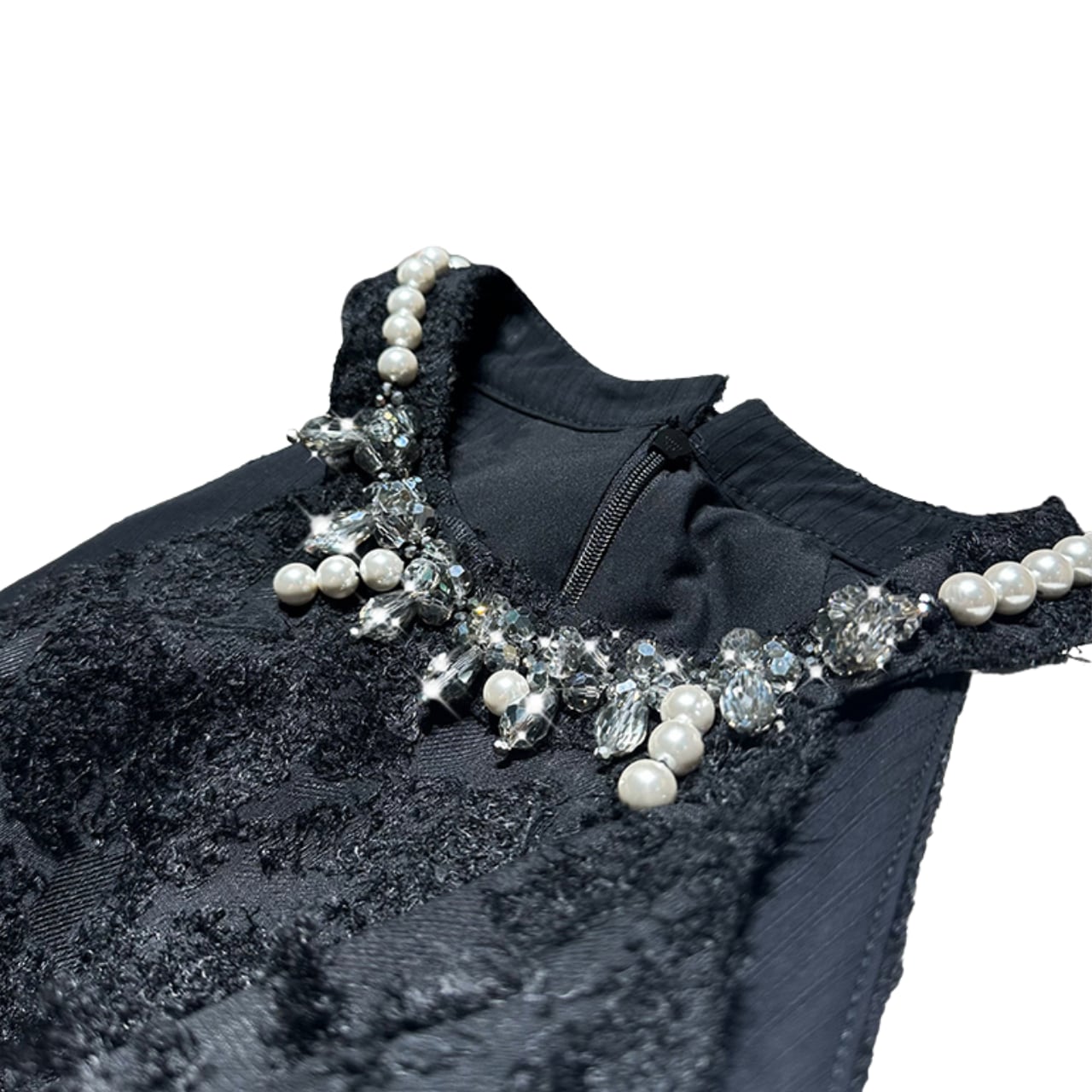 首元にあしらわれたビジューとパールが、顔まわりを華やかに魅せるエレガントドレス。
