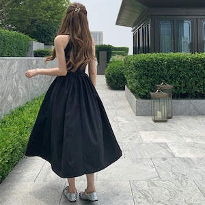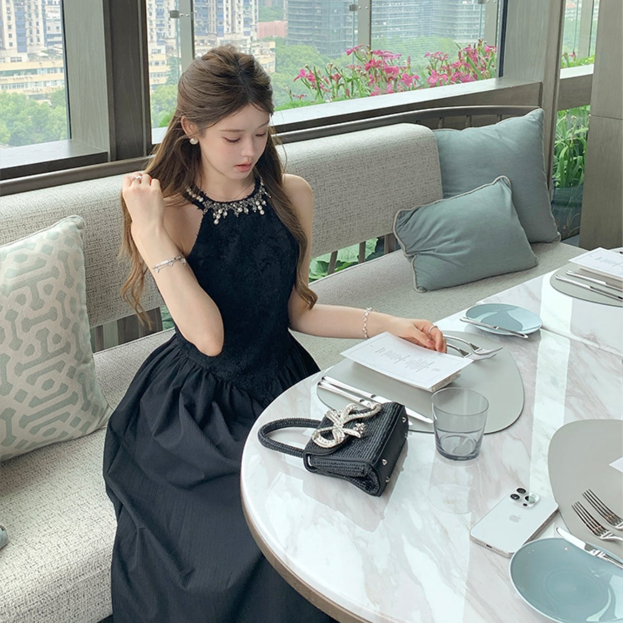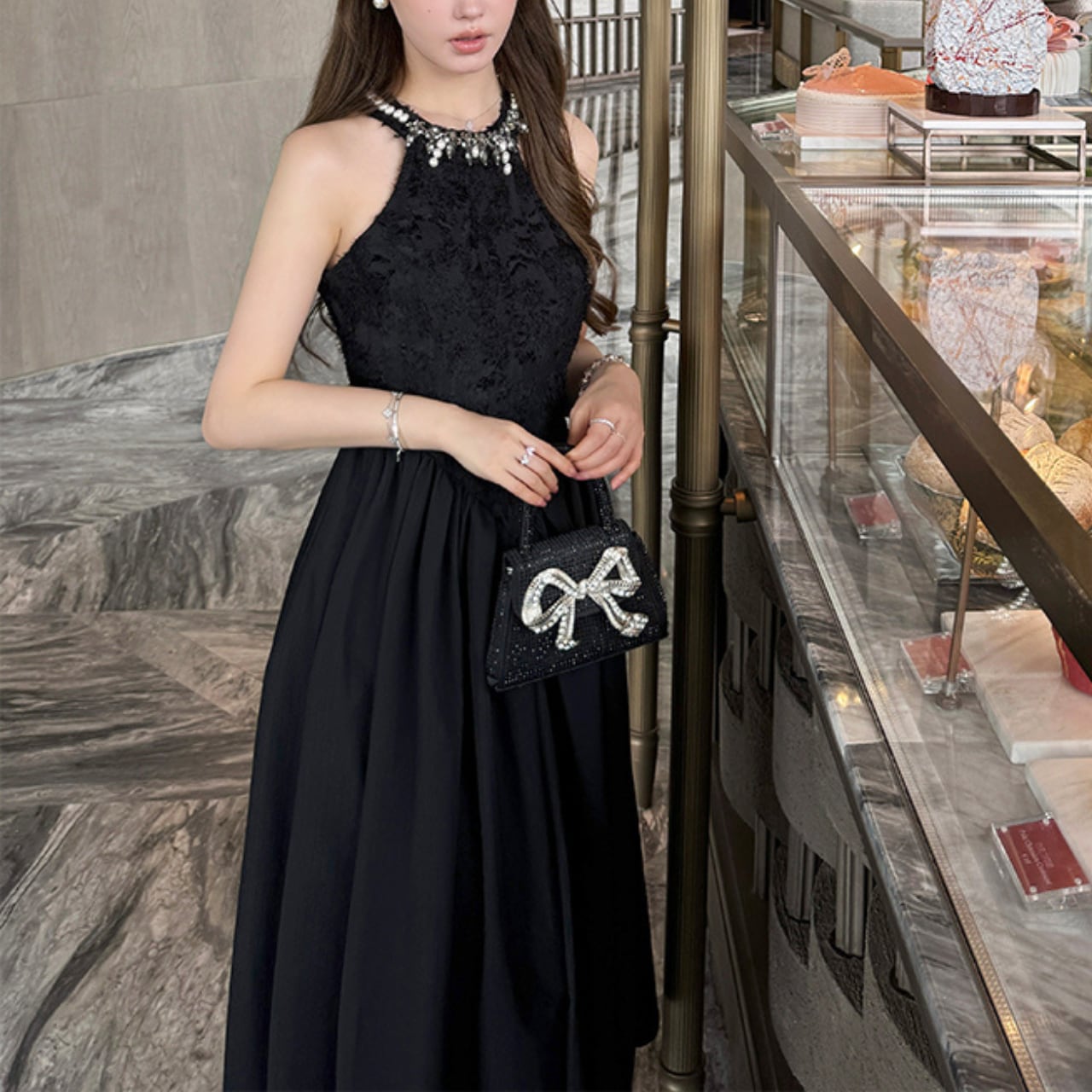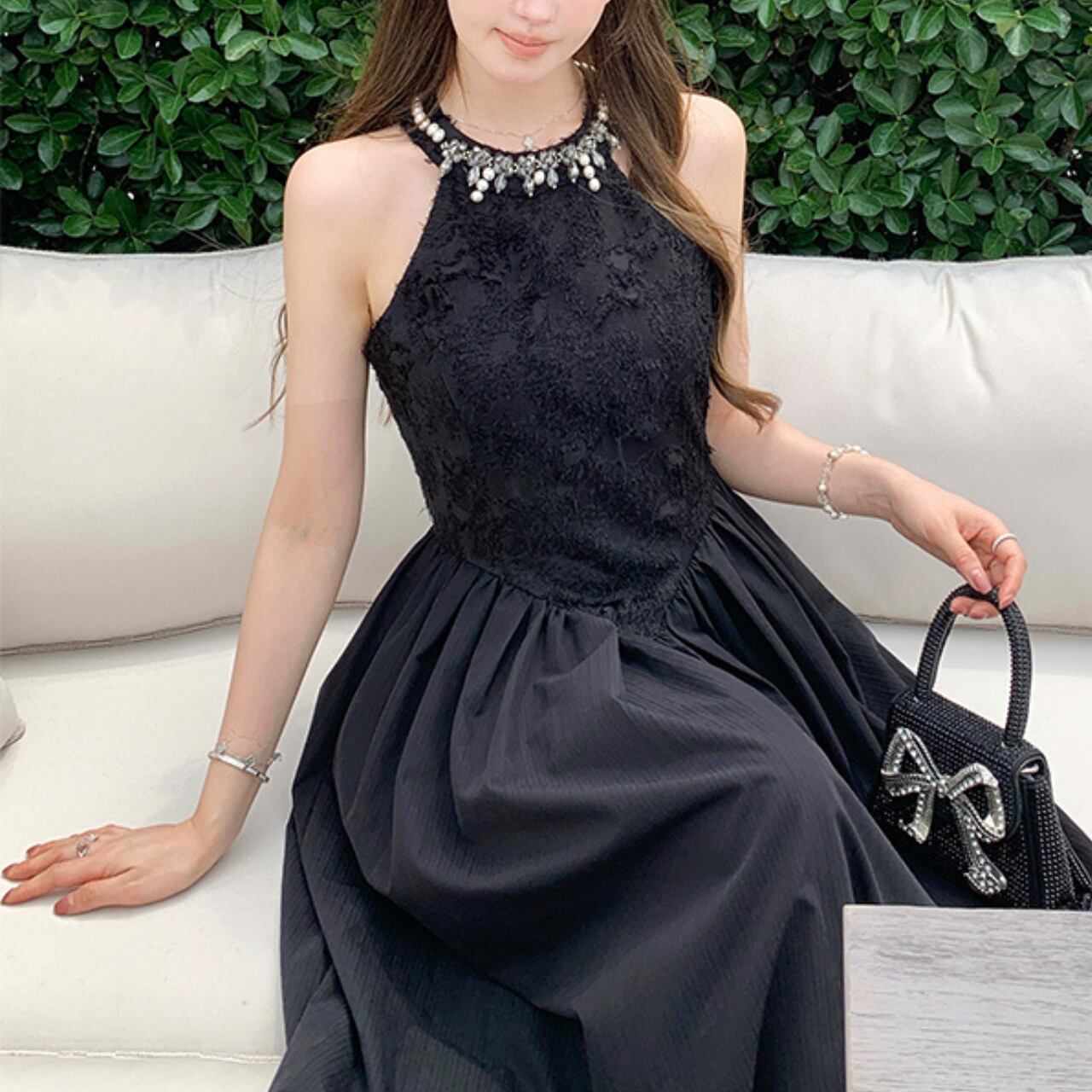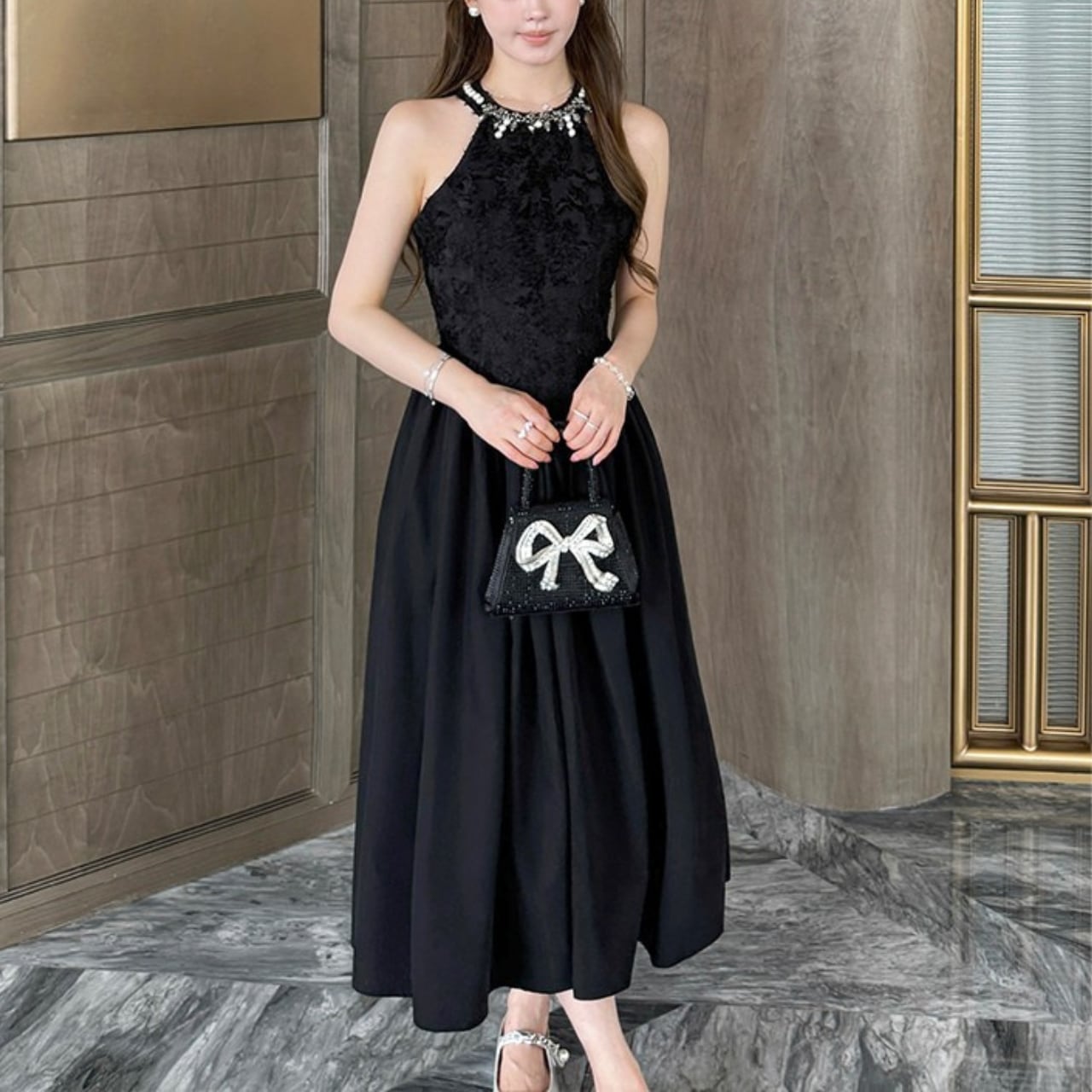 首元にあしらわれたビジューとパールが、顔まわりを華やかに魅せるエレガントドレス。