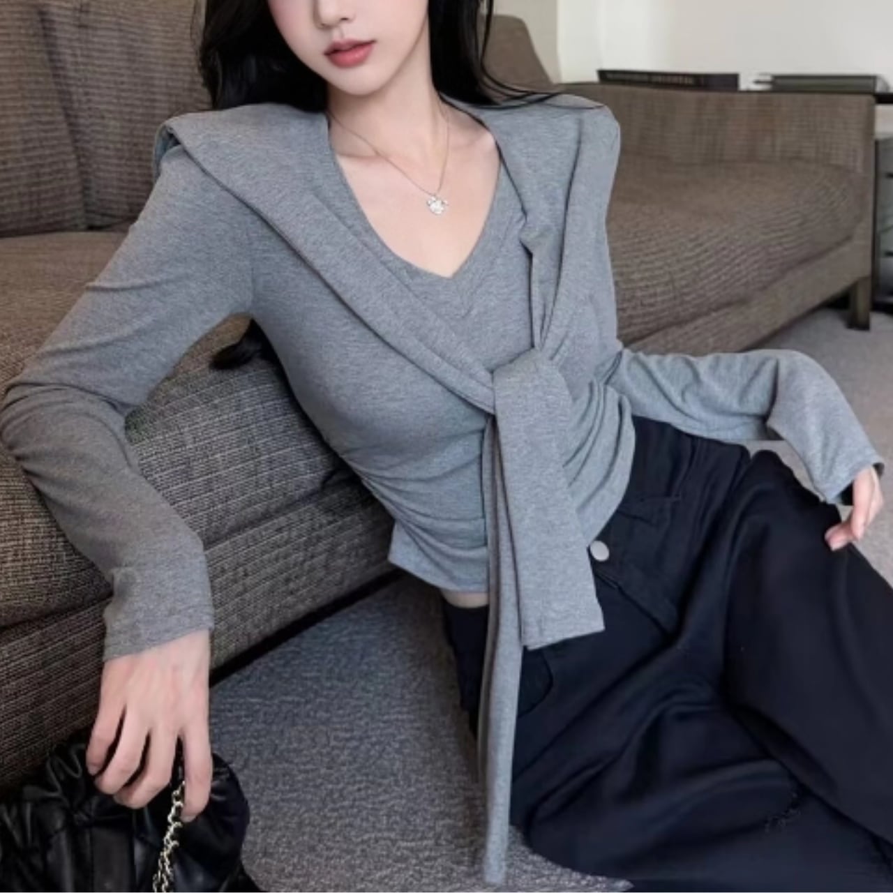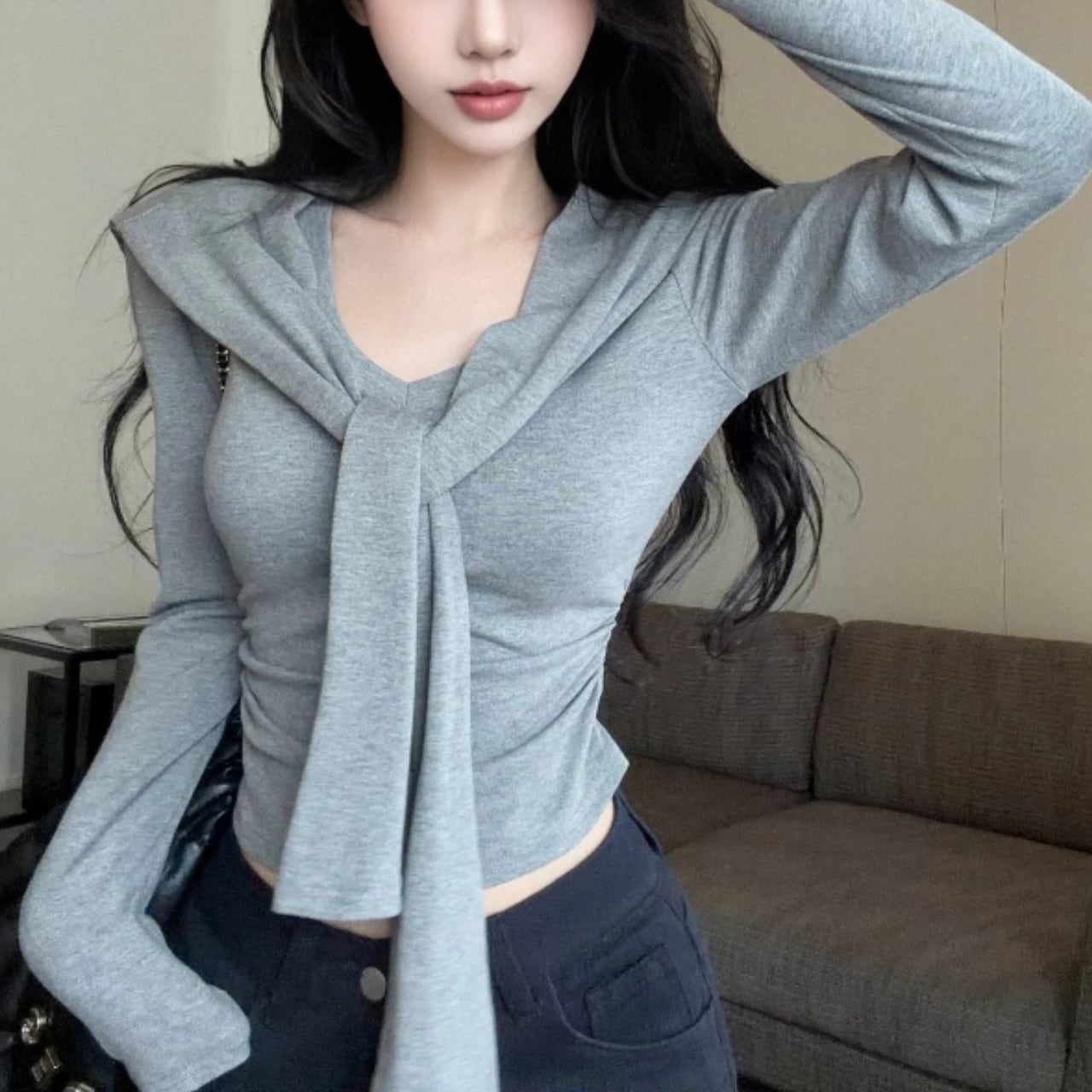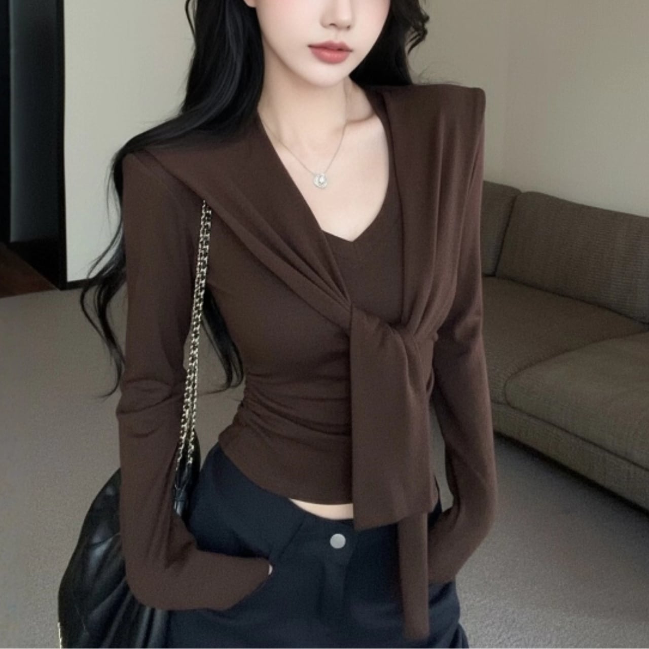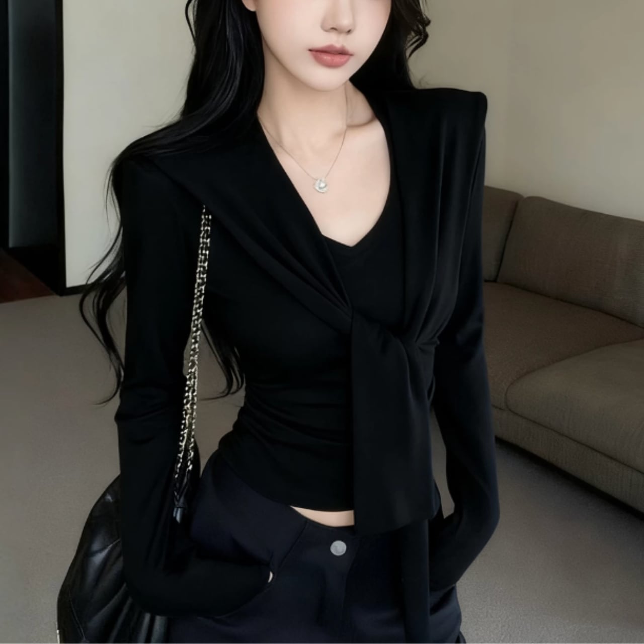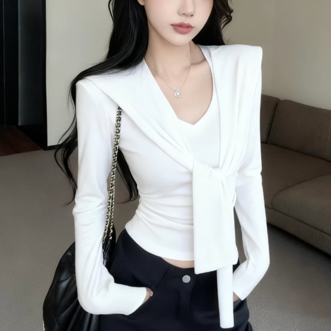 さりげなく結んだように見えるタイドデザインが、上半身をすっきりと見せてくれるスリムトップス。一枚でスタイルが整い、ジャケットやコートのインナーとしても上品にまとまる万能アイテムです。デイリー使いはもちろん、きれいめな印象に仕上げたい日の“頼れる一枚”として活躍します。