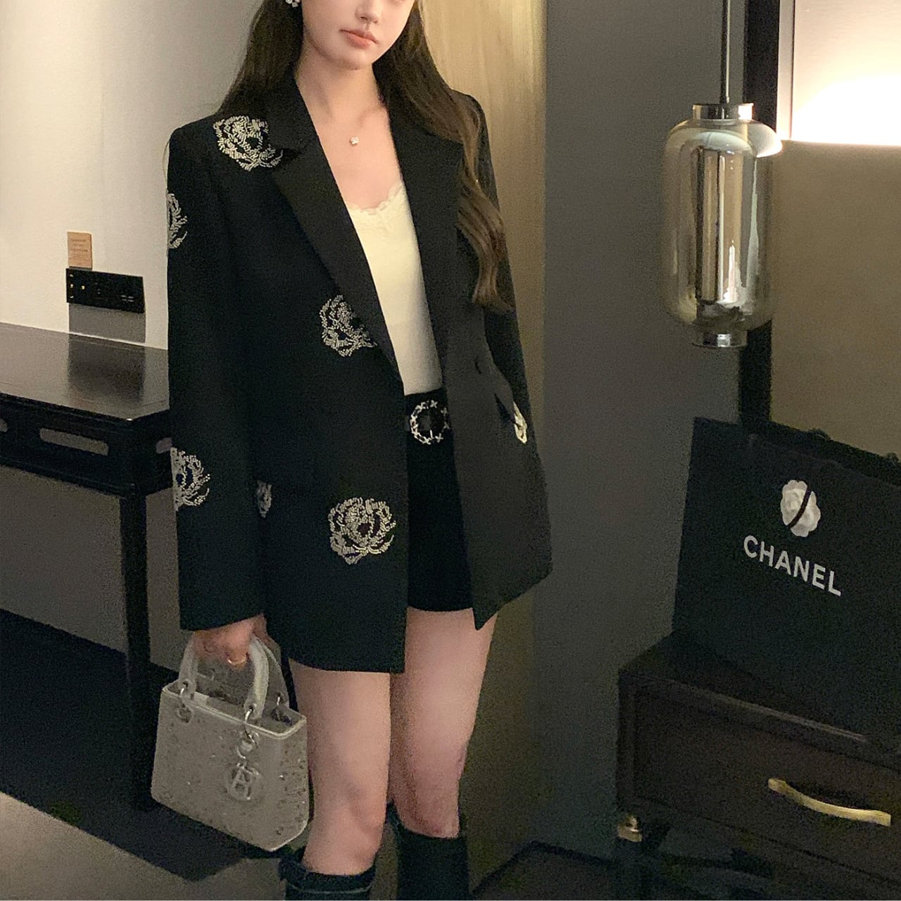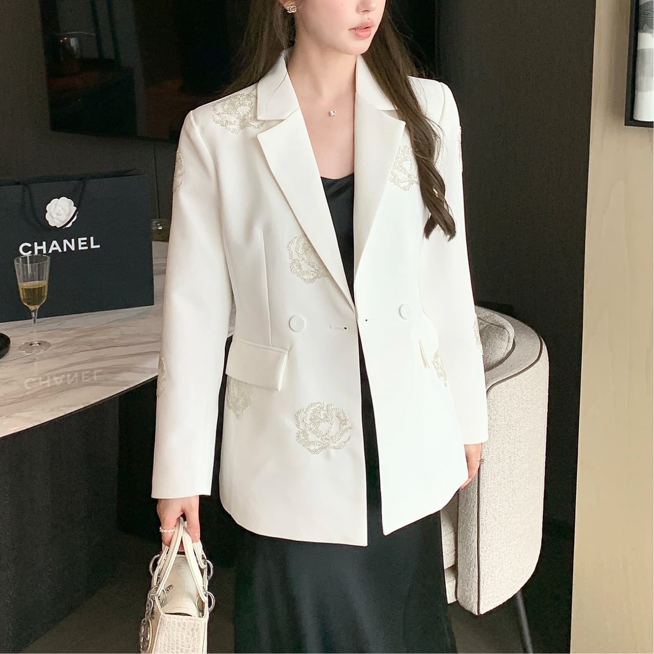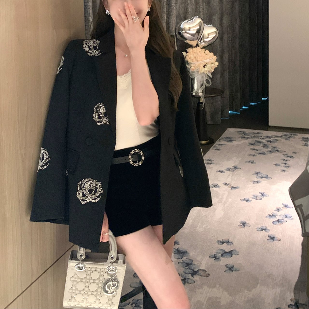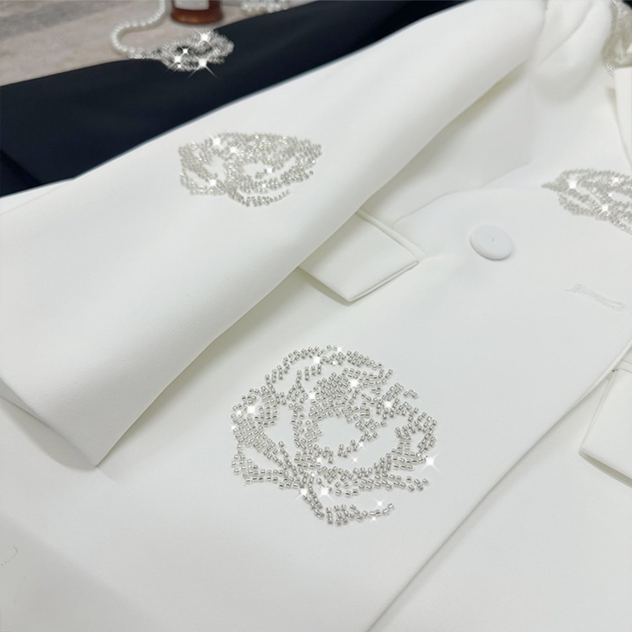 上品なきらめきを添えるカメリアモチーフのビジューが、静かに存在感を放つジャケット。