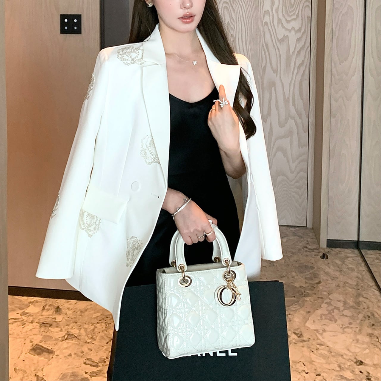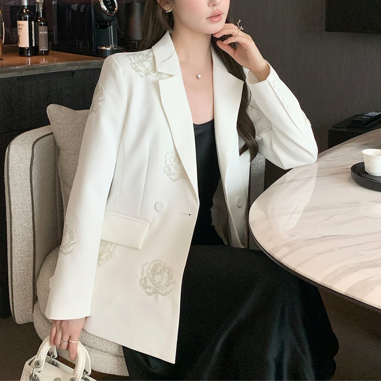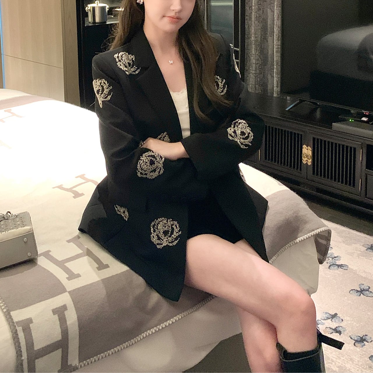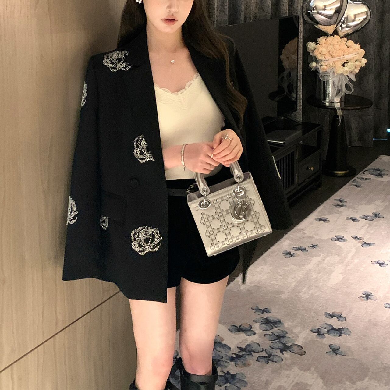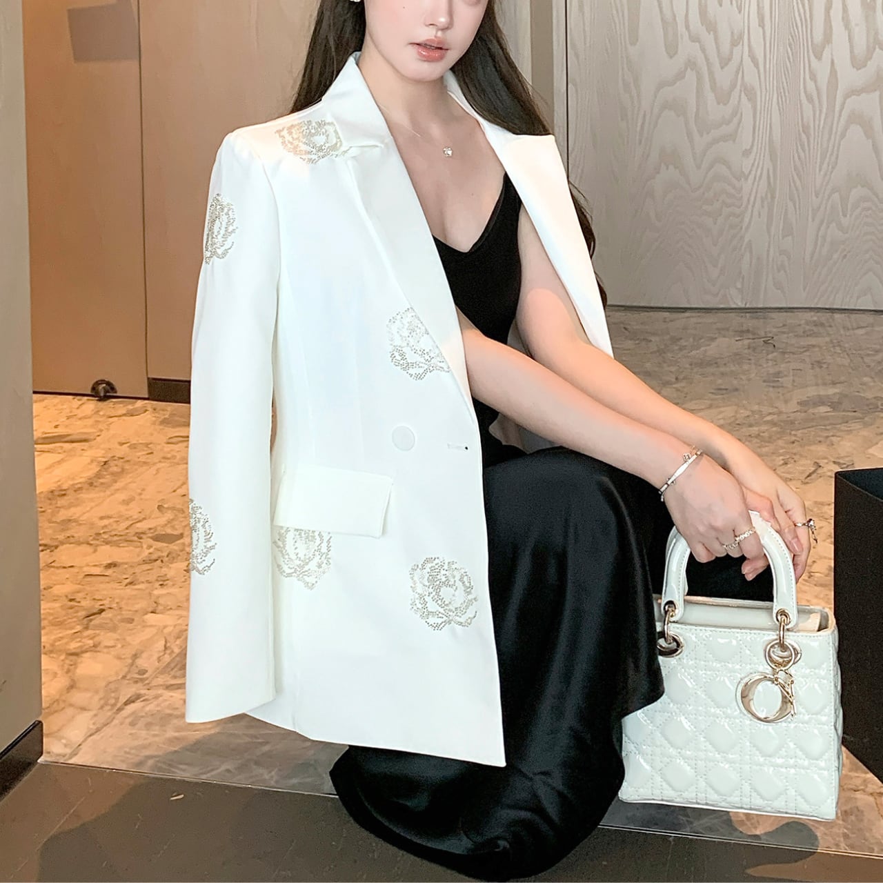 上品なきらめきを添えるカメリアモチーフのビジューが、静かに存在感を放つジャケット。