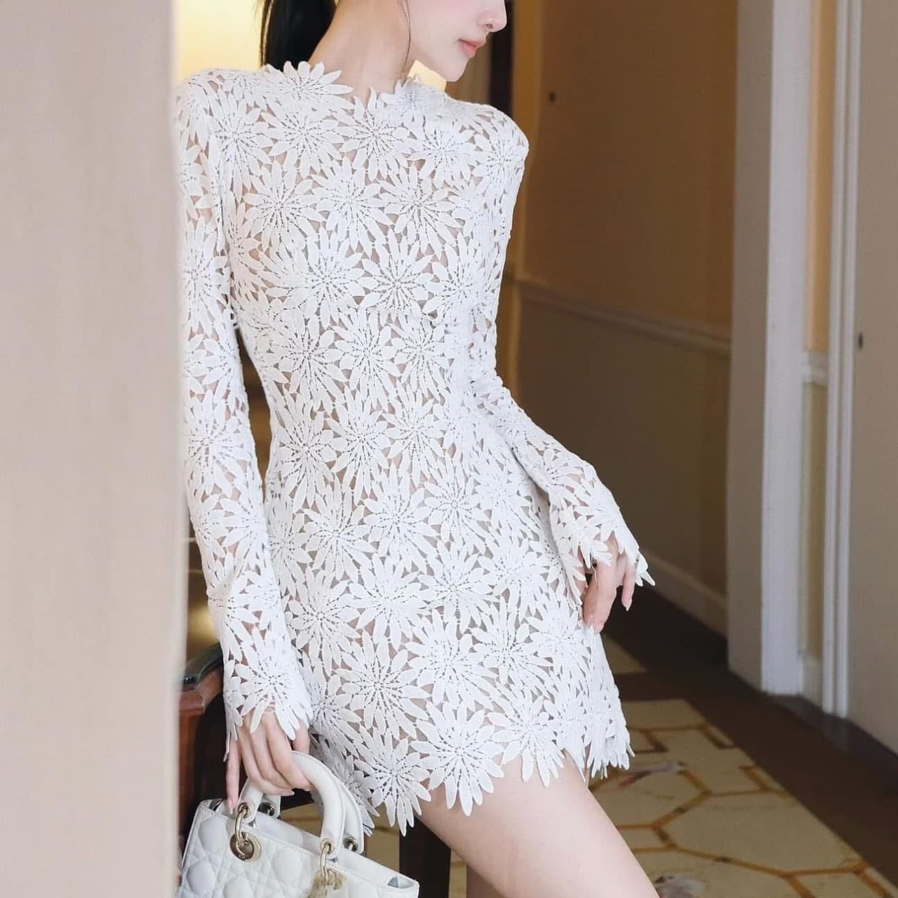 立体感のあるレースが上品な華やかさを添えるミニワンピース。すっきりとしたスリムシルエットで、身体のラインを美しく見せてくれる一枚です。ホワイトのワントーンが清楚でエレガント。特別なお出かけにも映える大人可愛いデザインです。