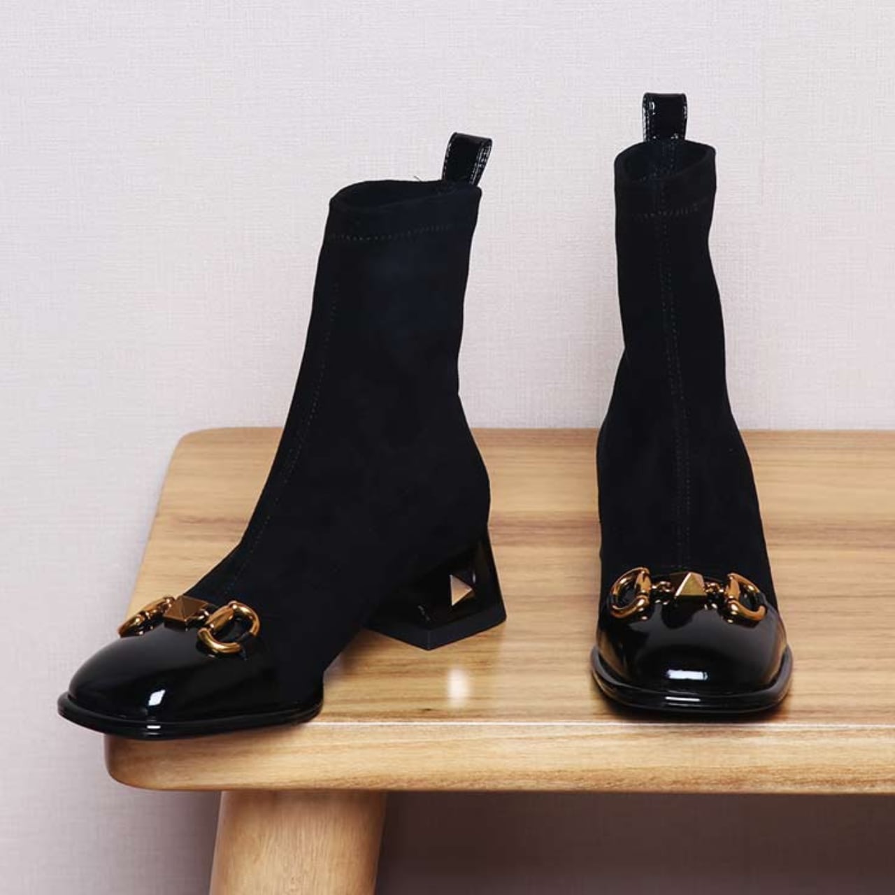 アッパーにはベルベット調素材と伸縮性のある生地を組み合わせ、足首まわりにやさしくフィット。すっきりとしたラインで、脚をきれいに見せてくれます。つま先部分はエナメル調素材を使用し、異素材のコントラストが上品なアクセントに。安定感のある4.5cmチャンキーヒールで、歩きやすさときちんと感を両立しています。