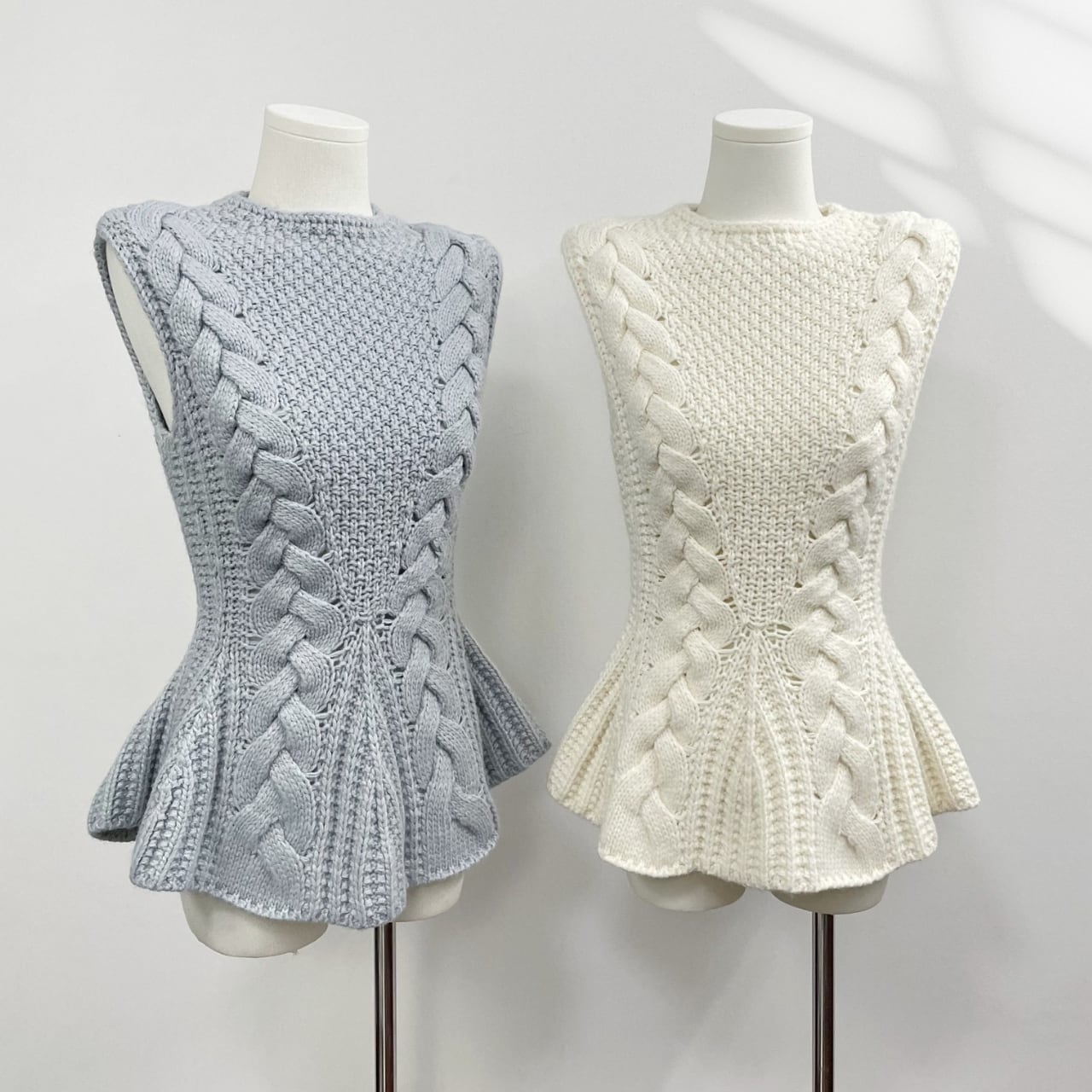 上品な立体感が目を惹く、ケーブル編みデザインのニットベスト。ウエスト位置から自然に広がるペプラムシルエットが、さっと着るだけでスタイルアップを叶えてくれます。もこもこニットやインナーを重ねてもバランスが取りやすく、季節の変わり目から長く活躍する一枚です。