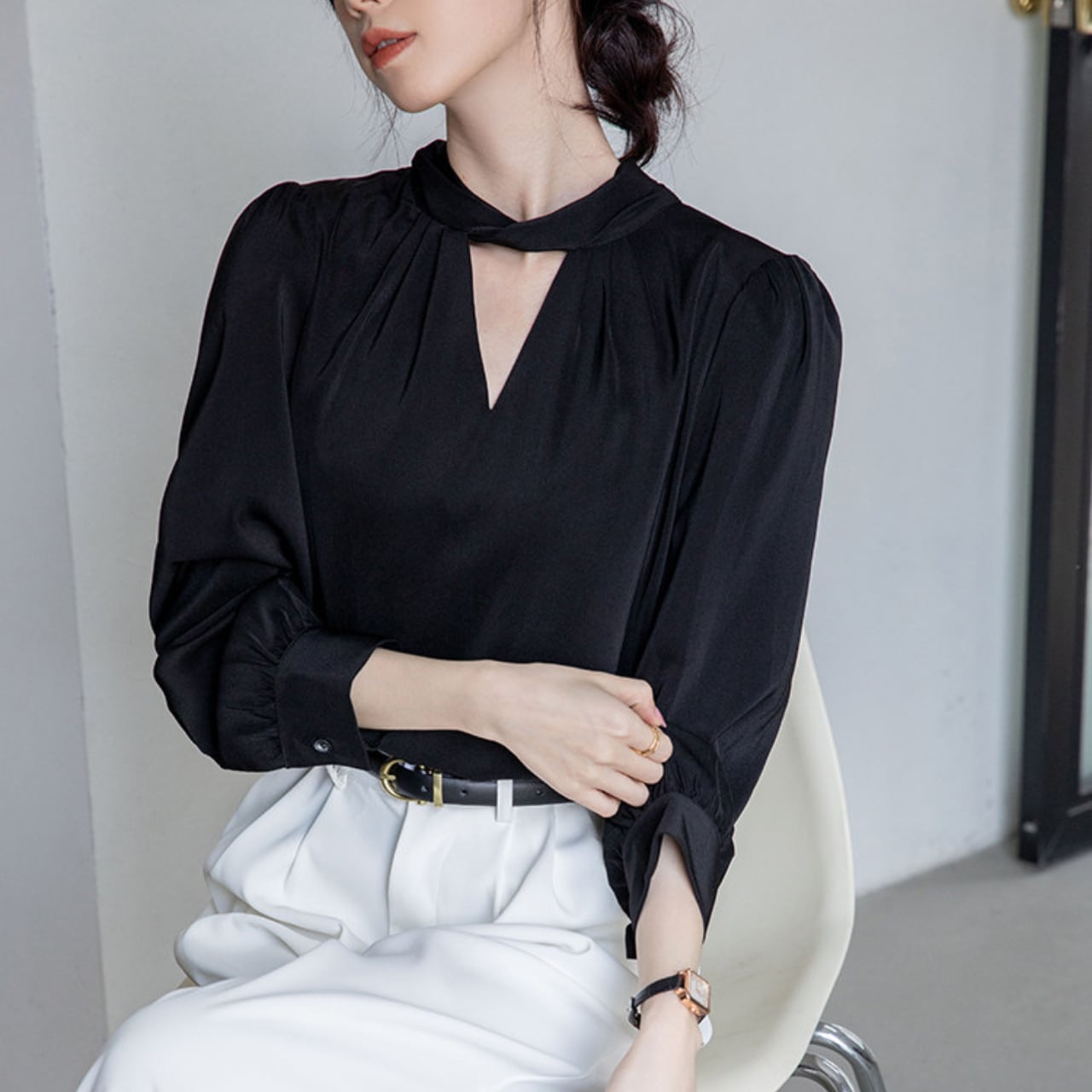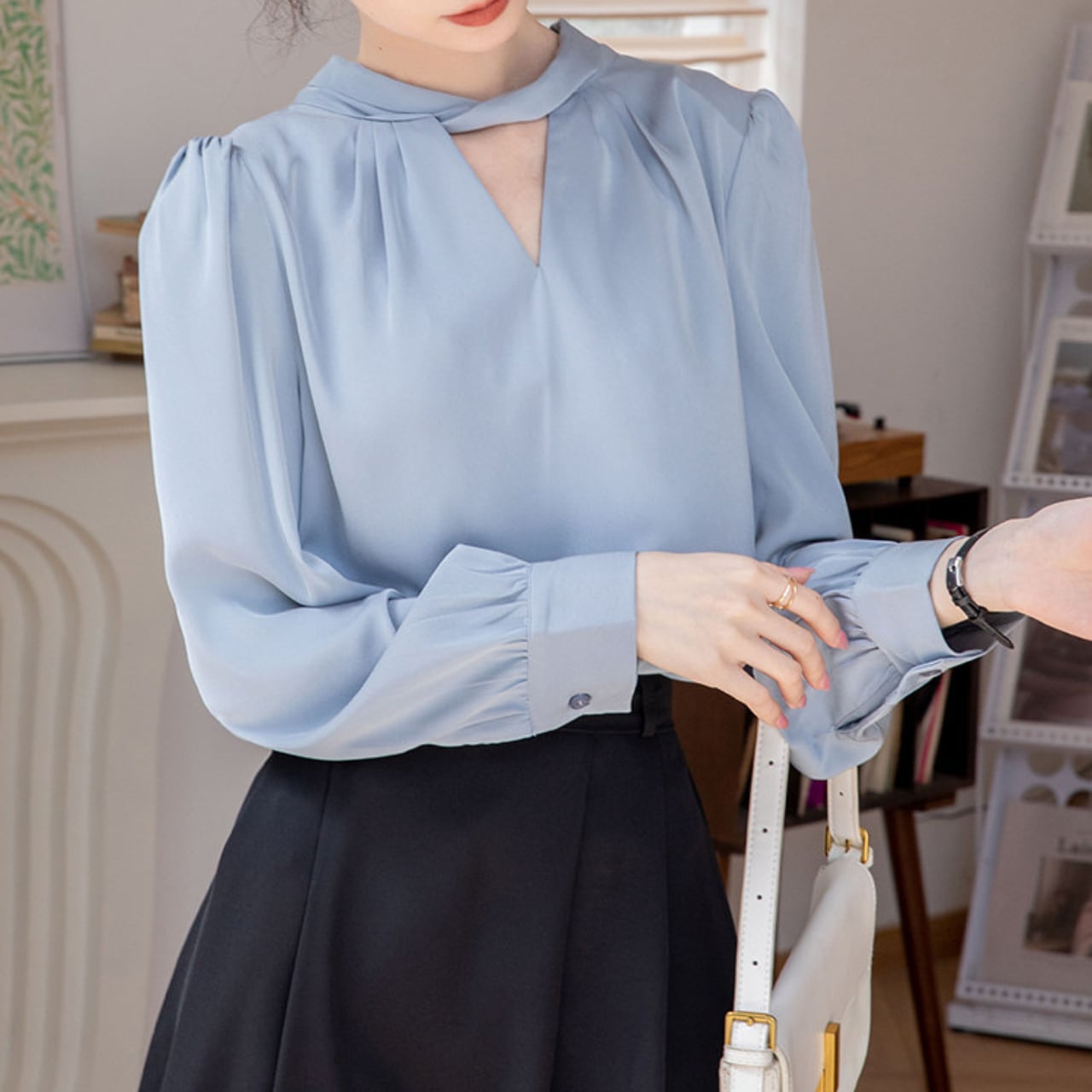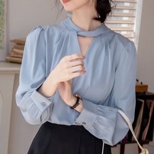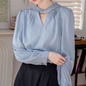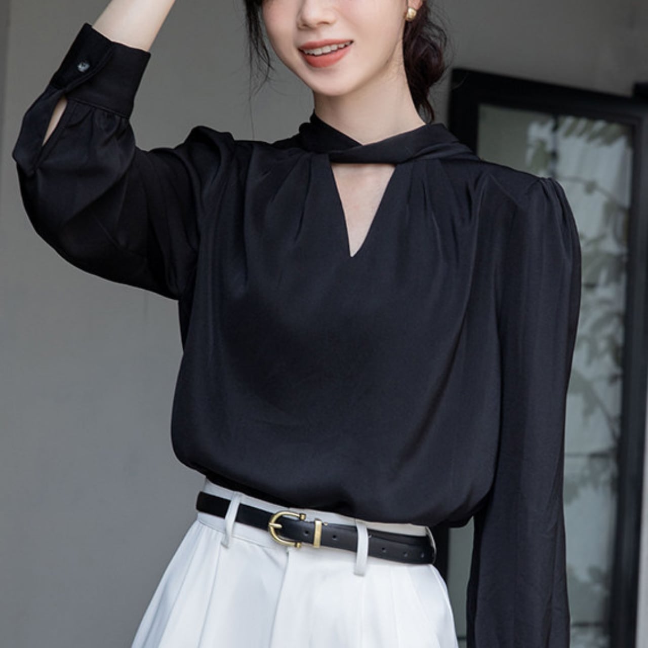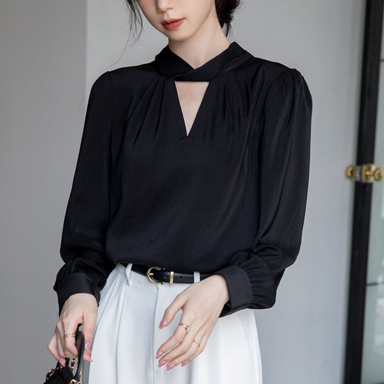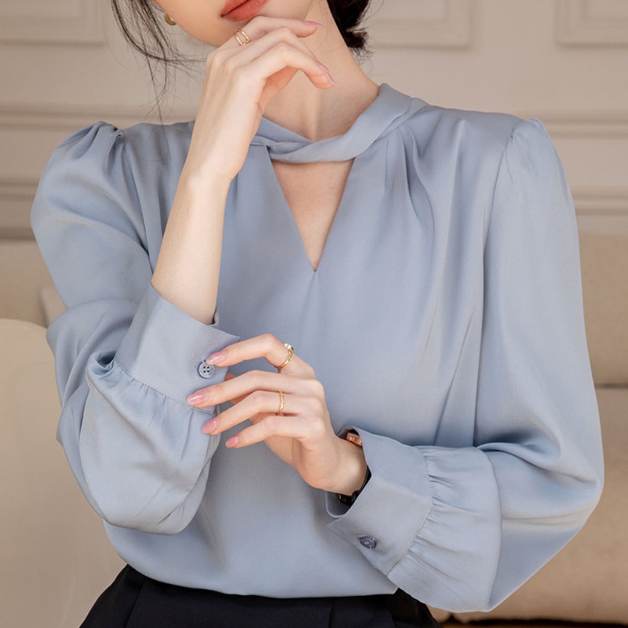 首元にさりげない抜け感をつくるネックカットデザインが印象的な、エレガントブラウス。