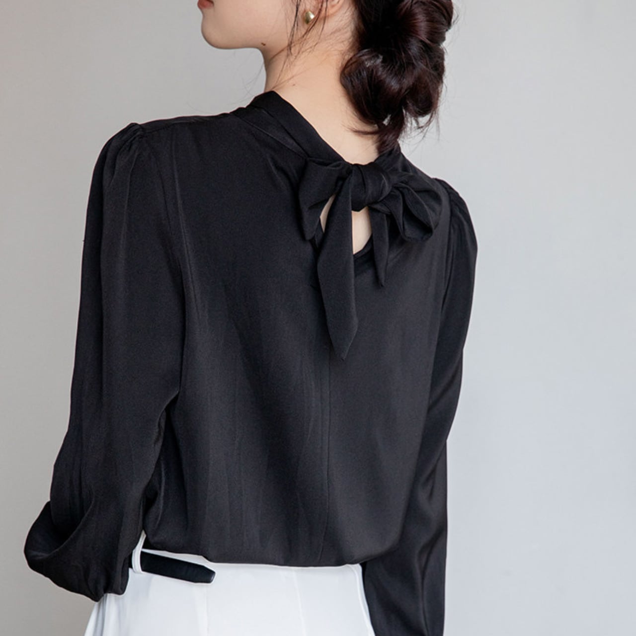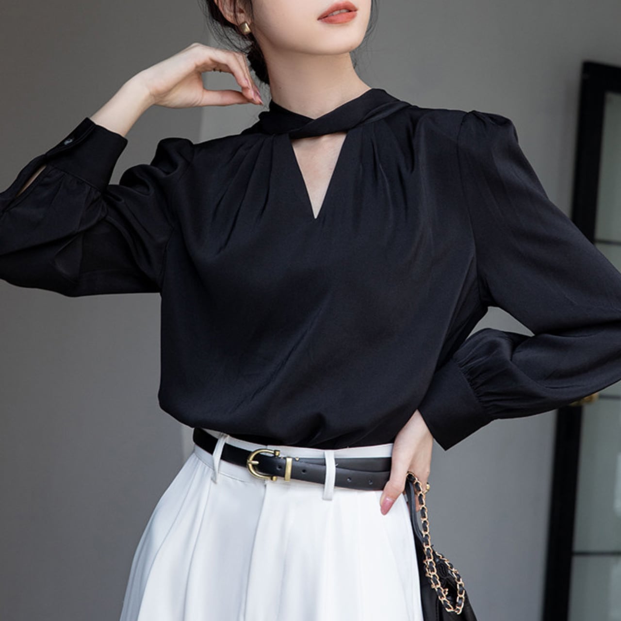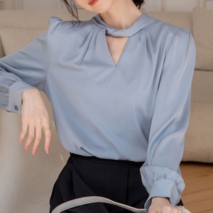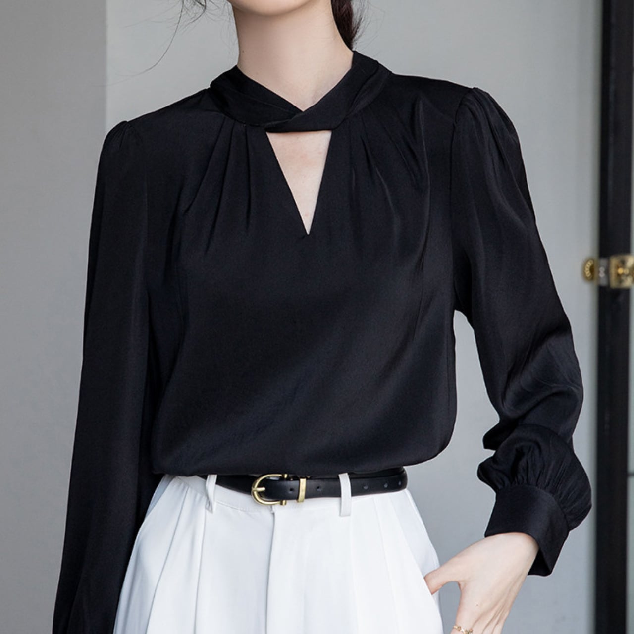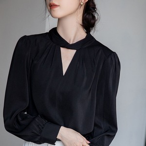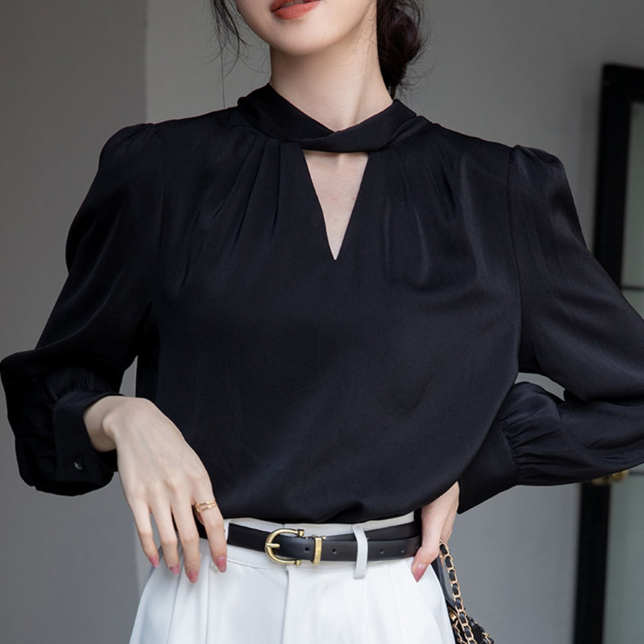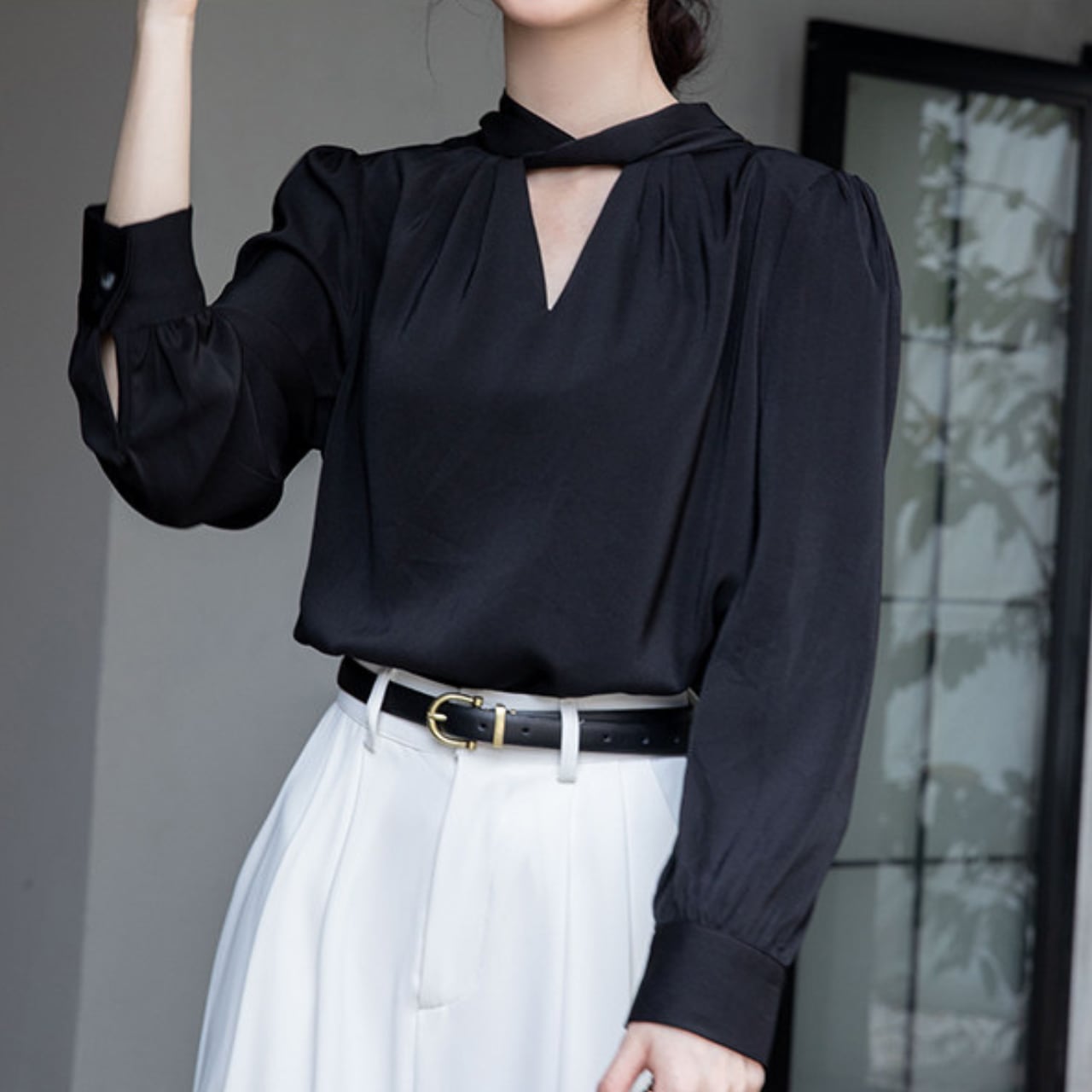 首元にさりげない抜け感をつくるネックカットデザインが印象的な、エレガントブラウス。