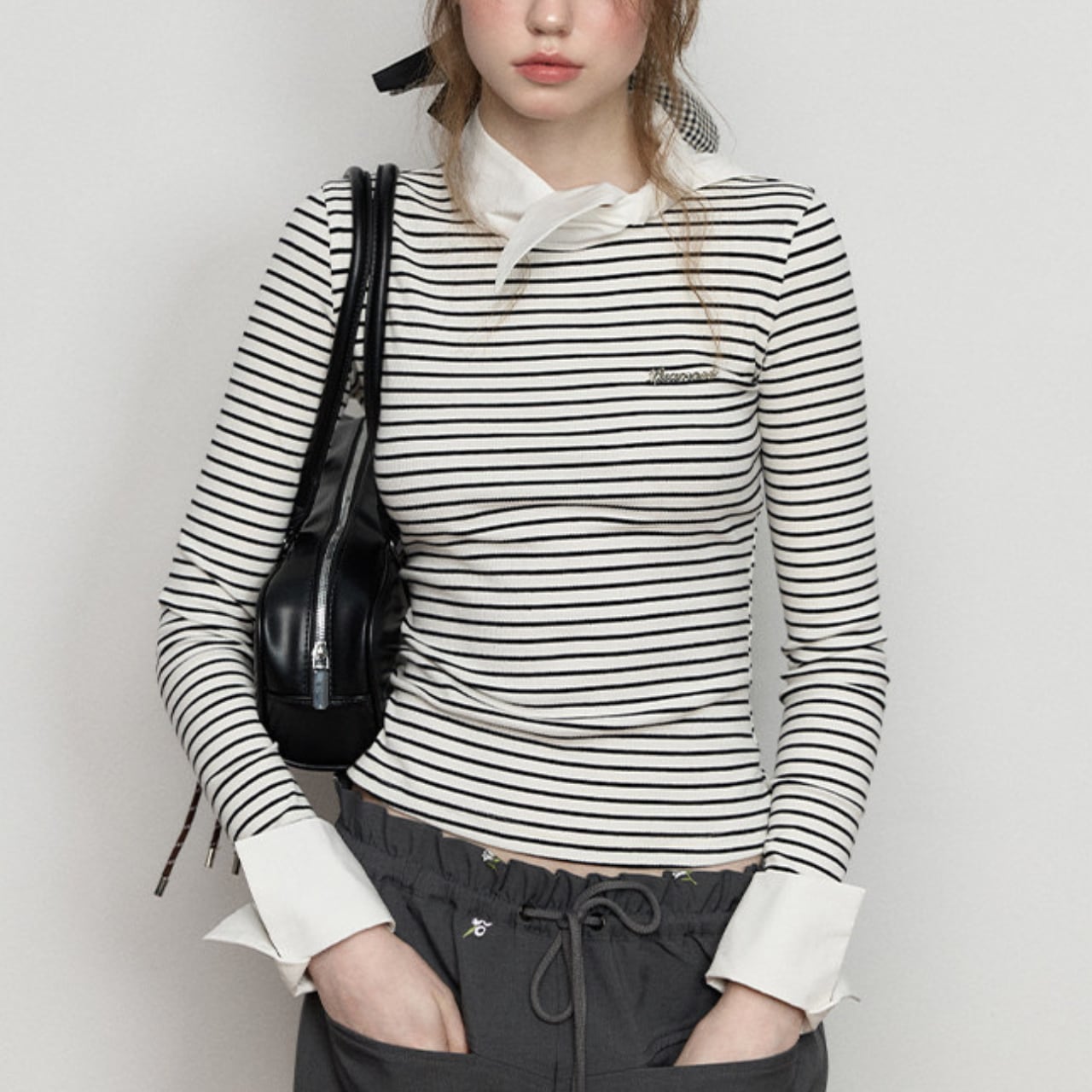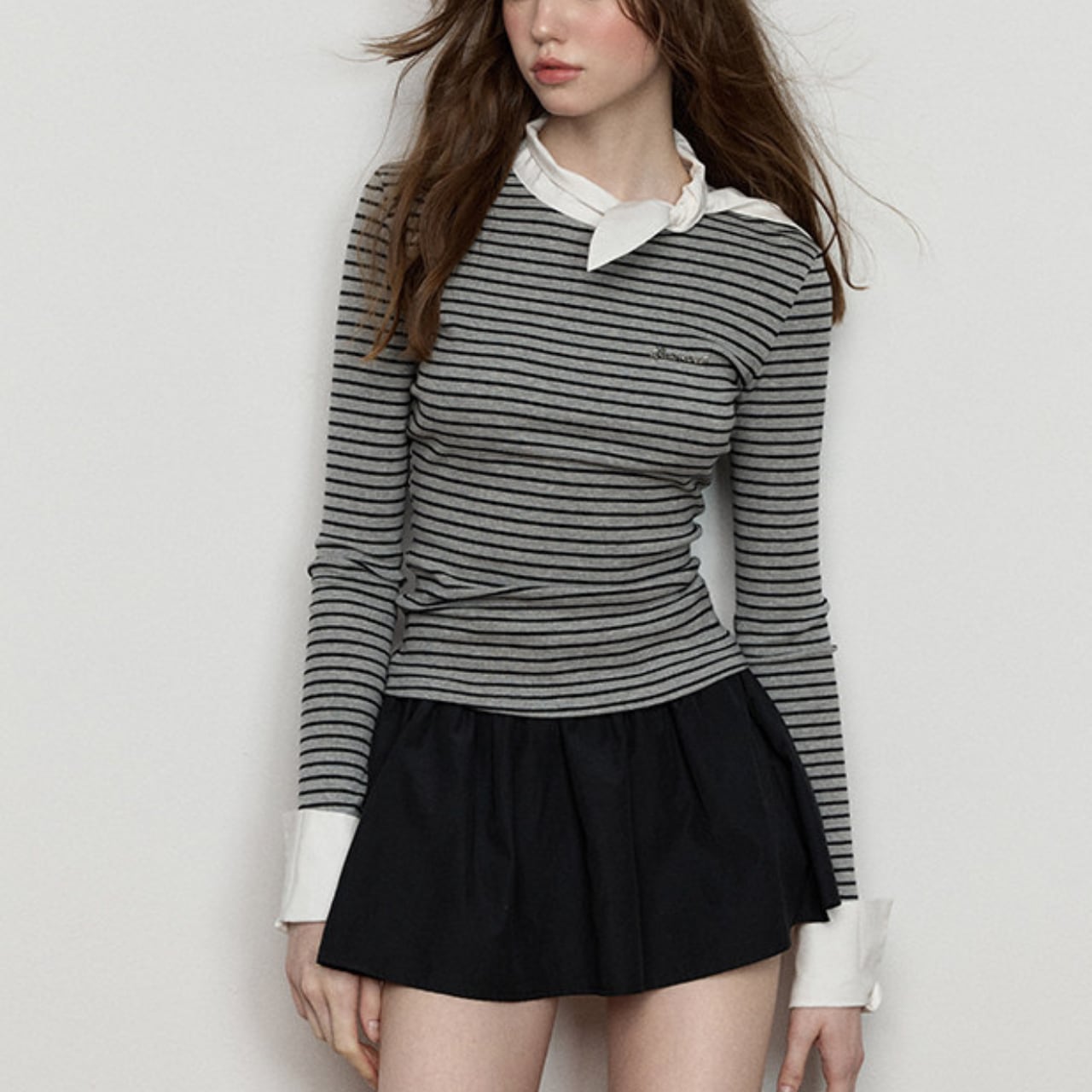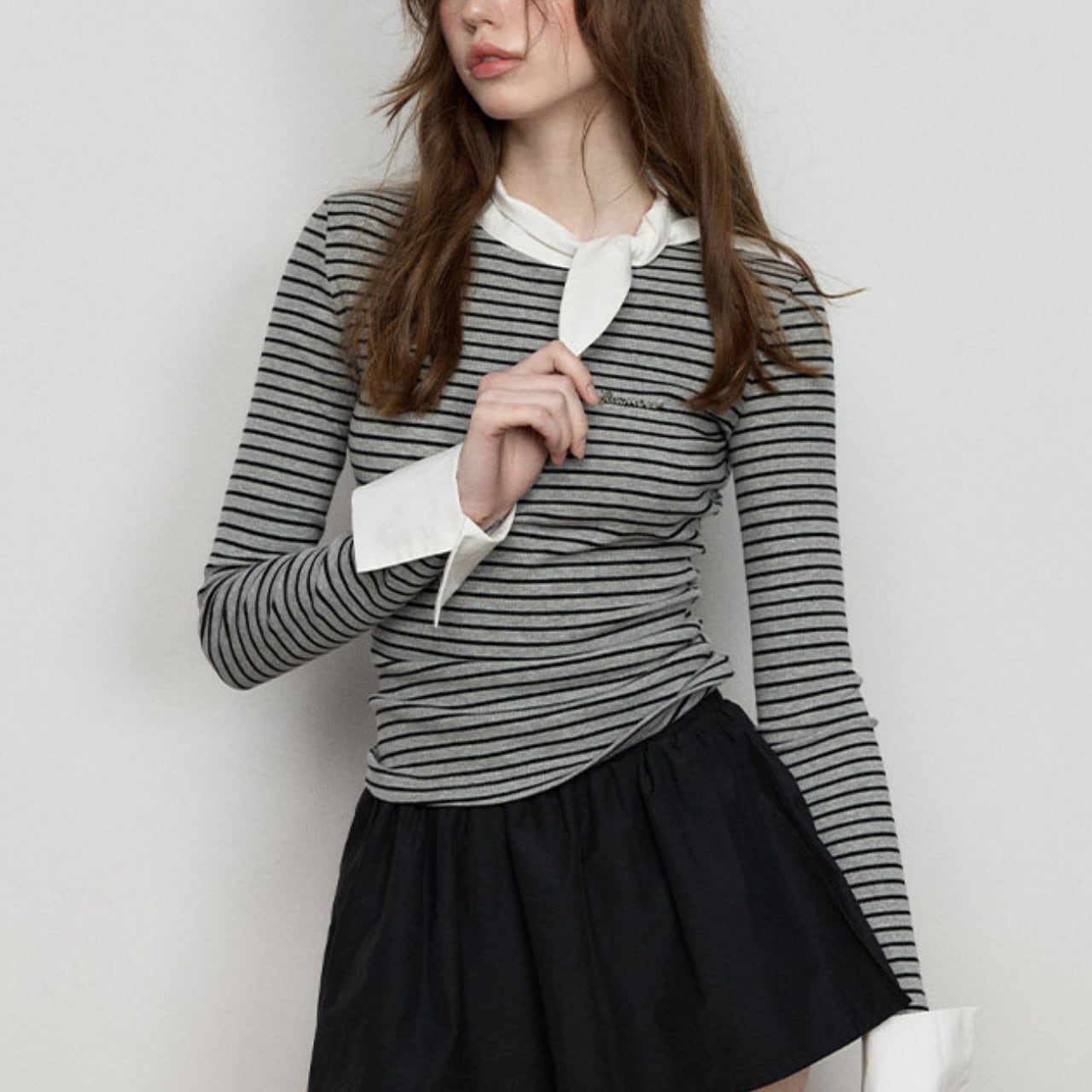 首元で結ぶスカーフディテールを添えた一枚。
