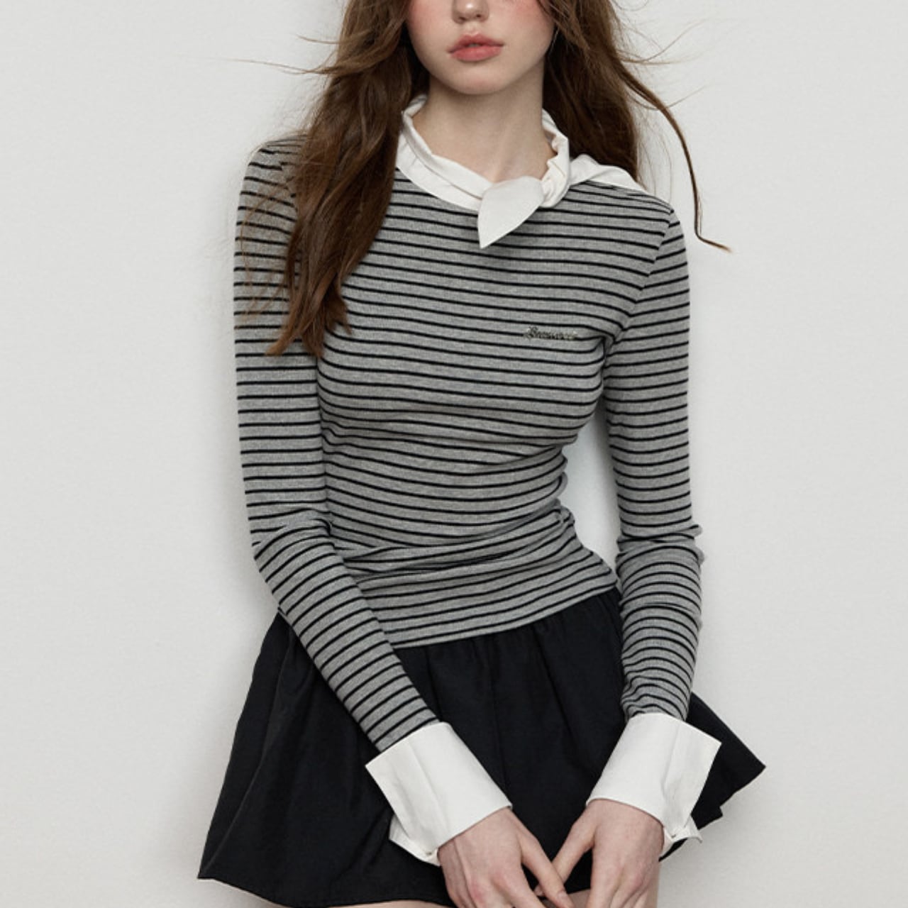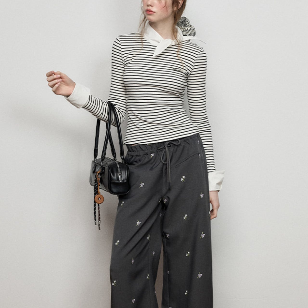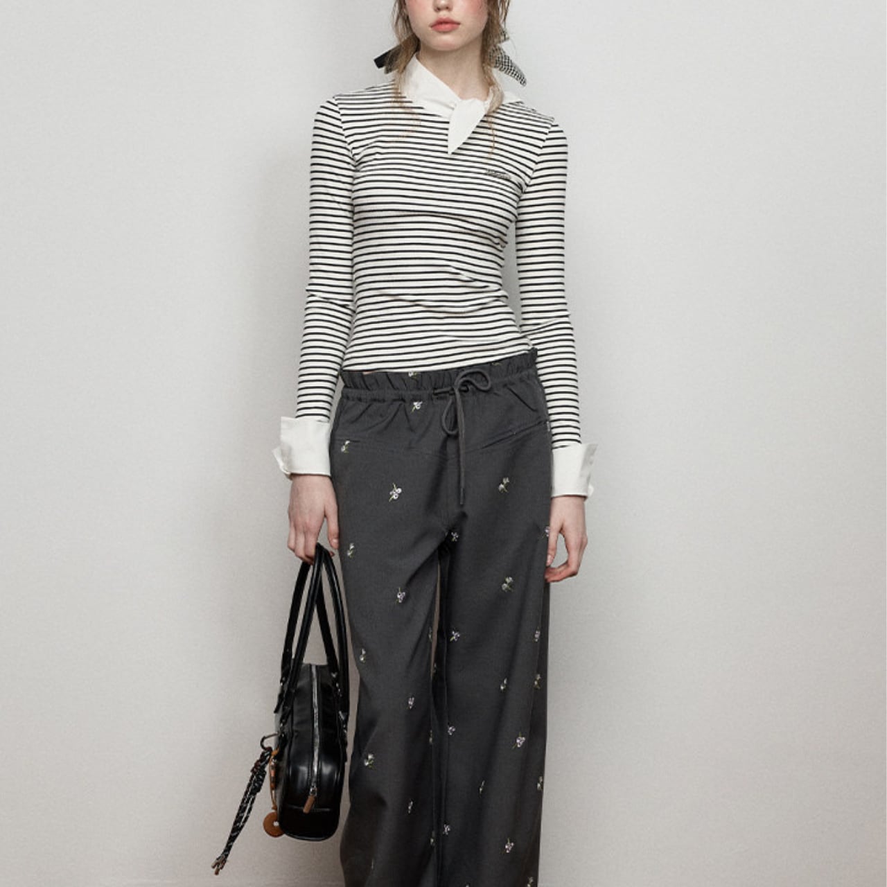 首元で結ぶスカーフディテールを添えた一枚。