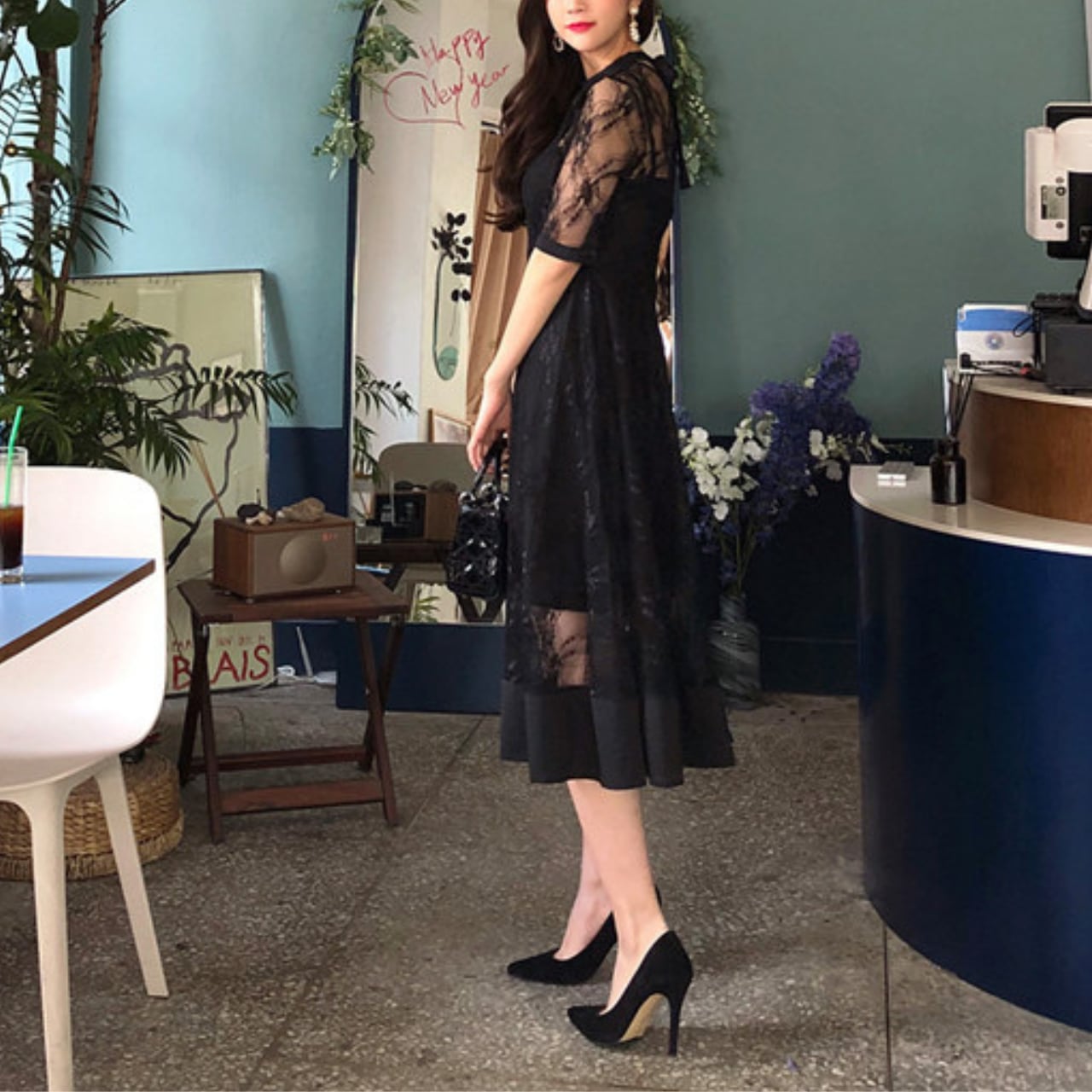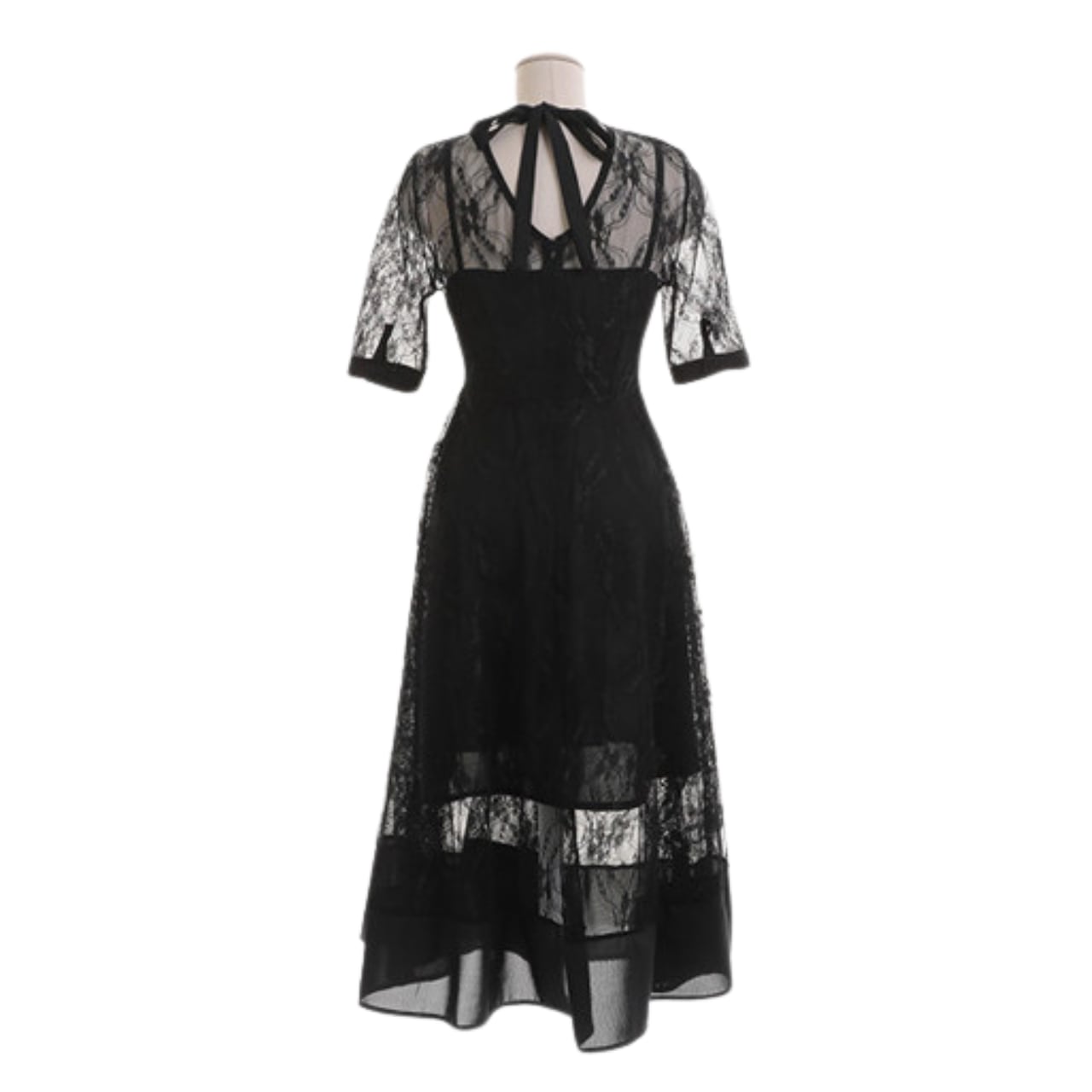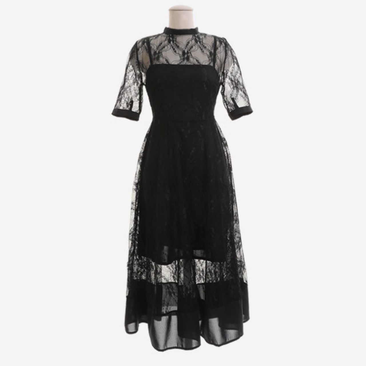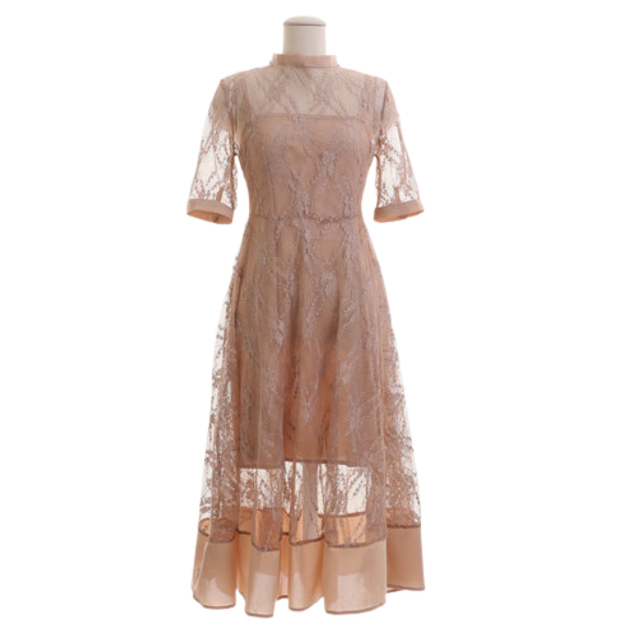 繊細なレースと、すっきりとしたシルエットが印象的なミディ丈ドレス。