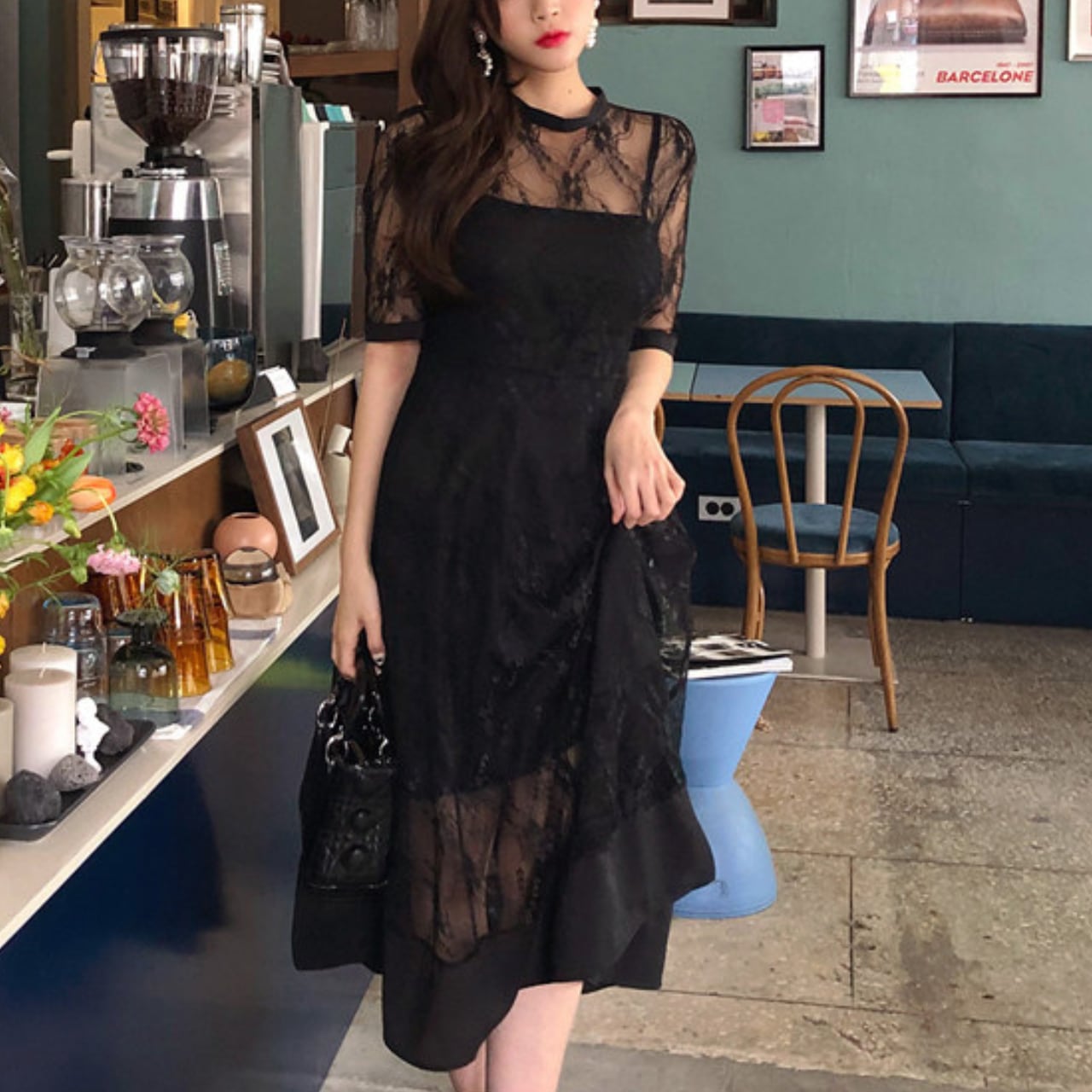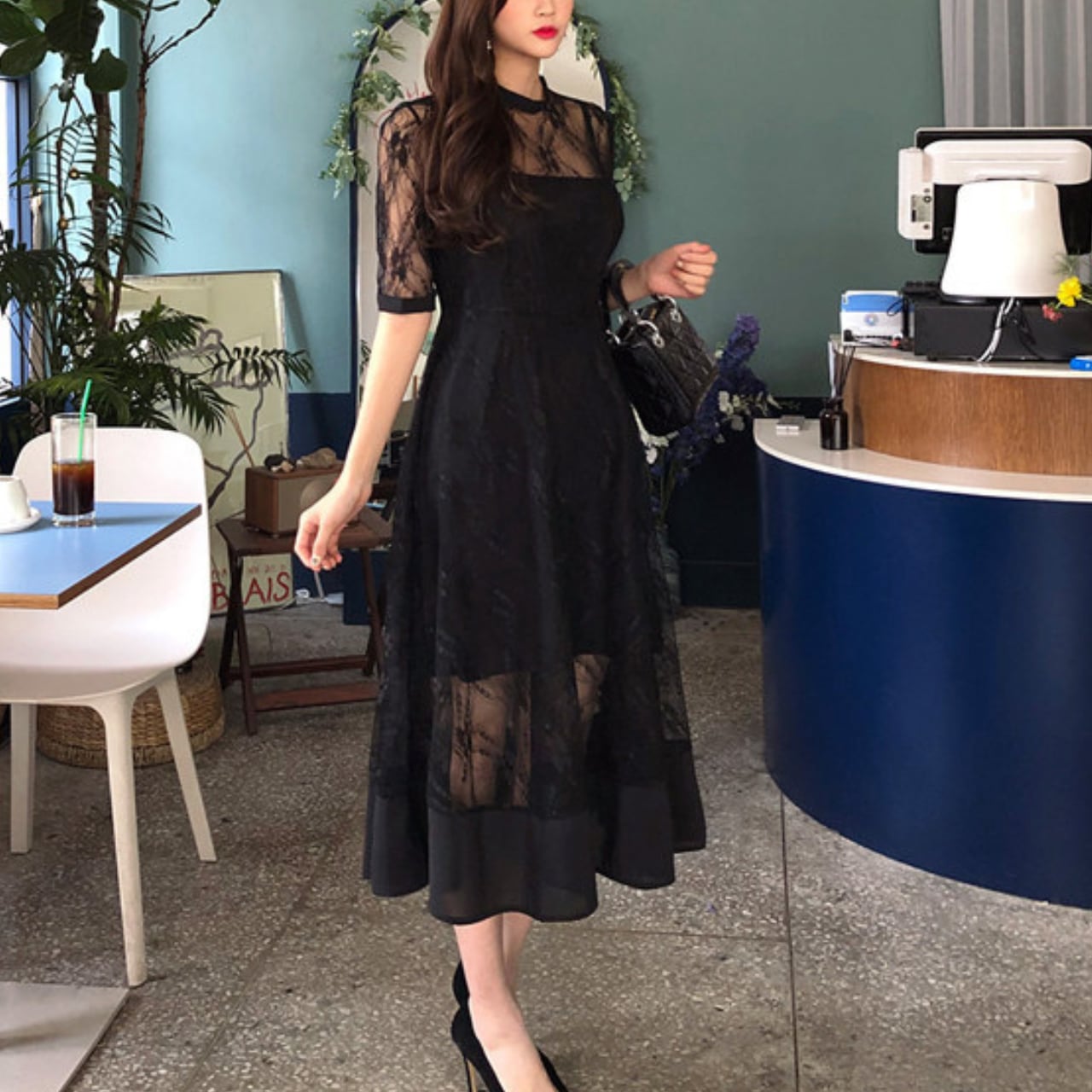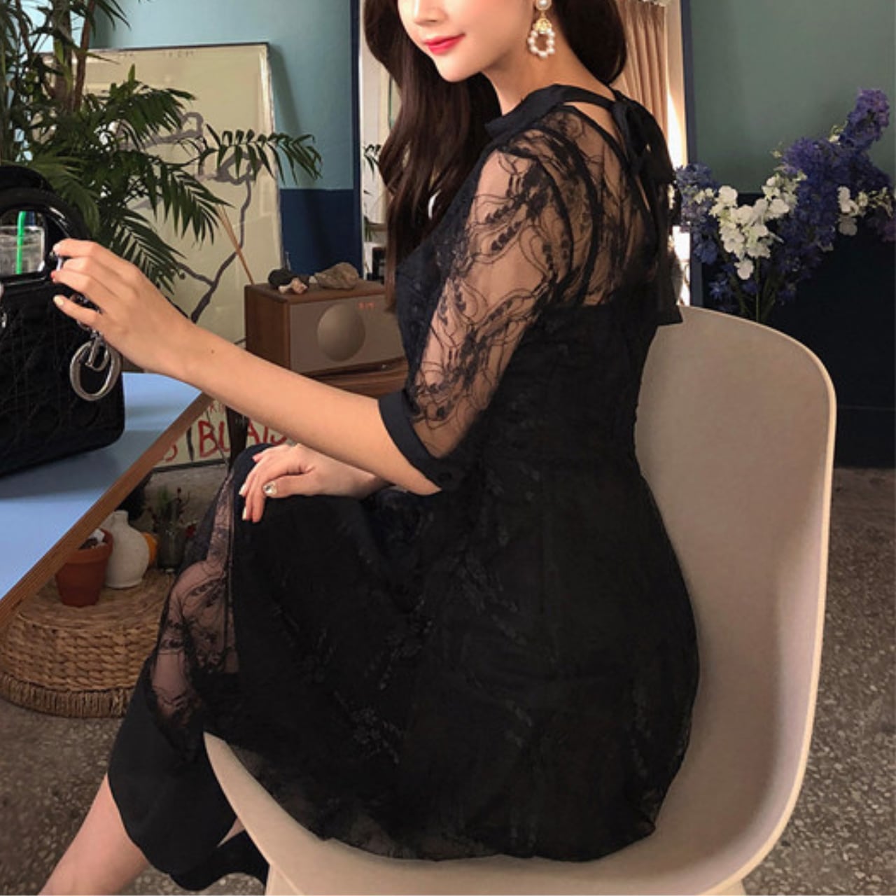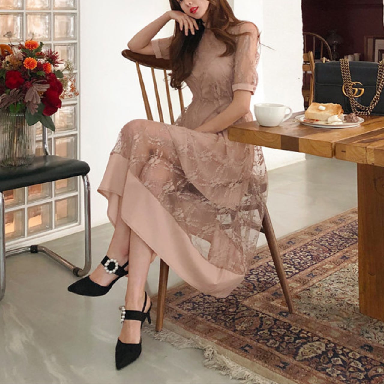 繊細なレースと、すっきりとしたシルエットが印象的なミディ丈ドレス。