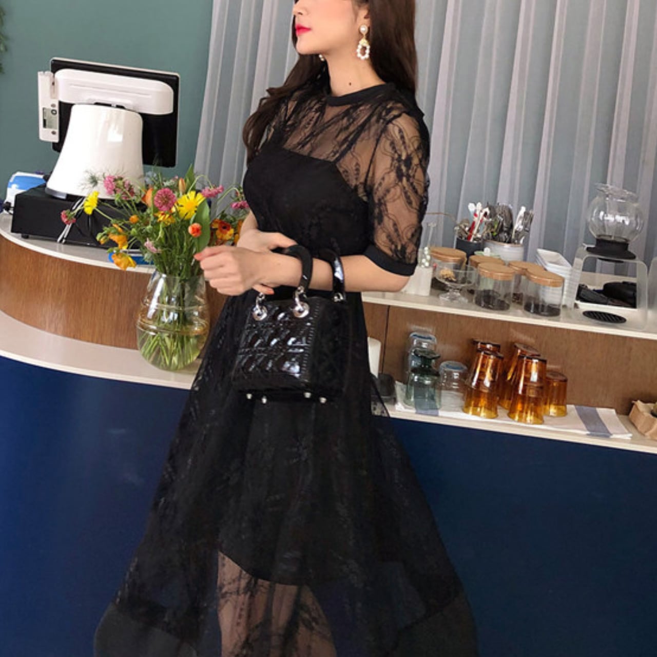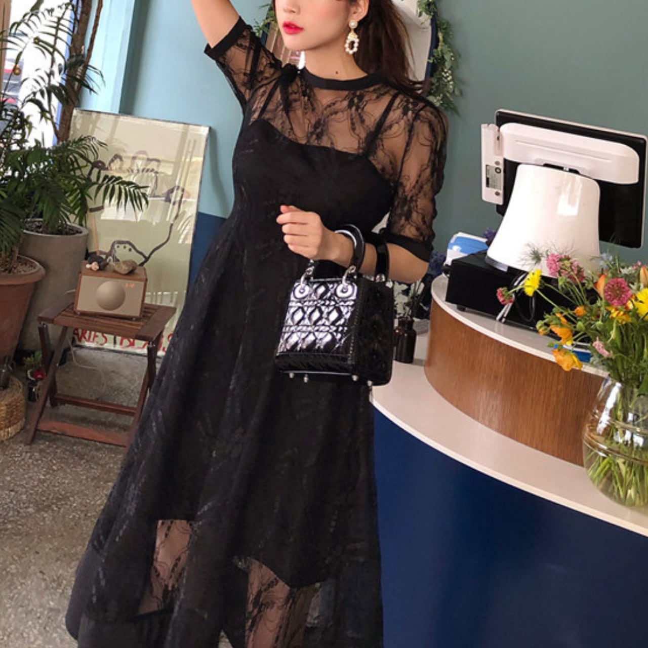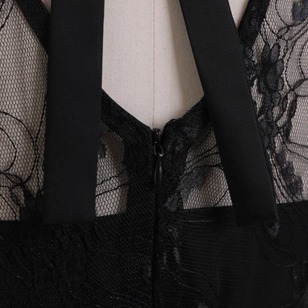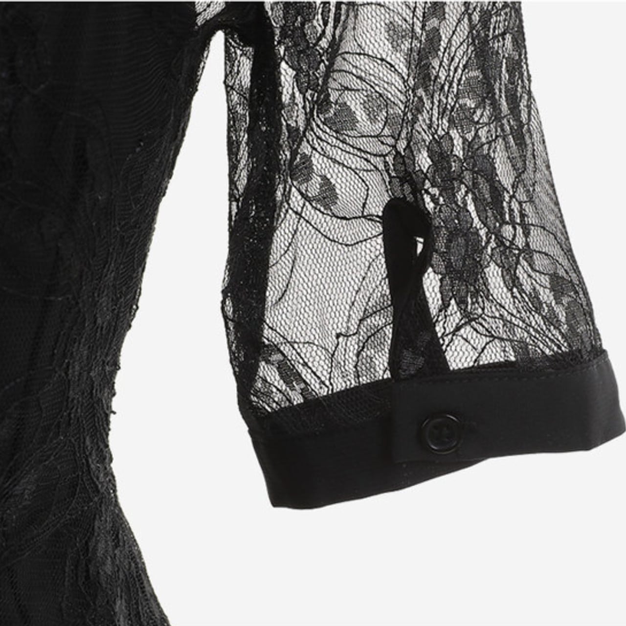 繊細なレースと、すっきりとしたシルエットが印象的なミディ丈ドレス。
