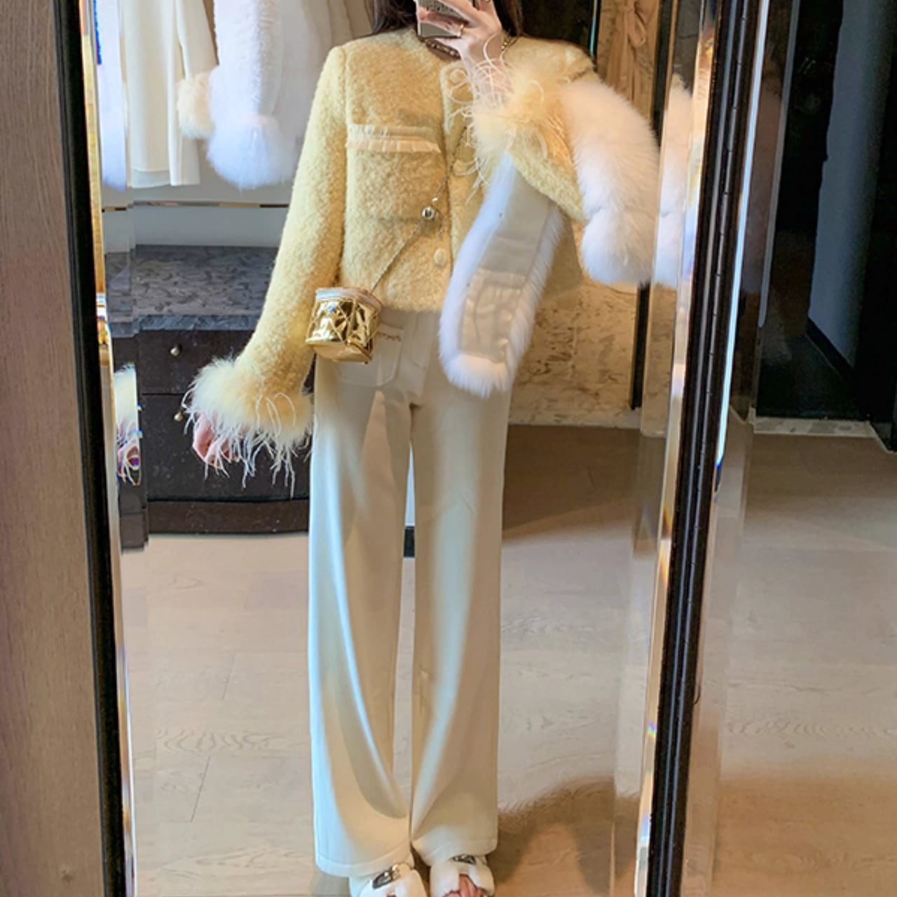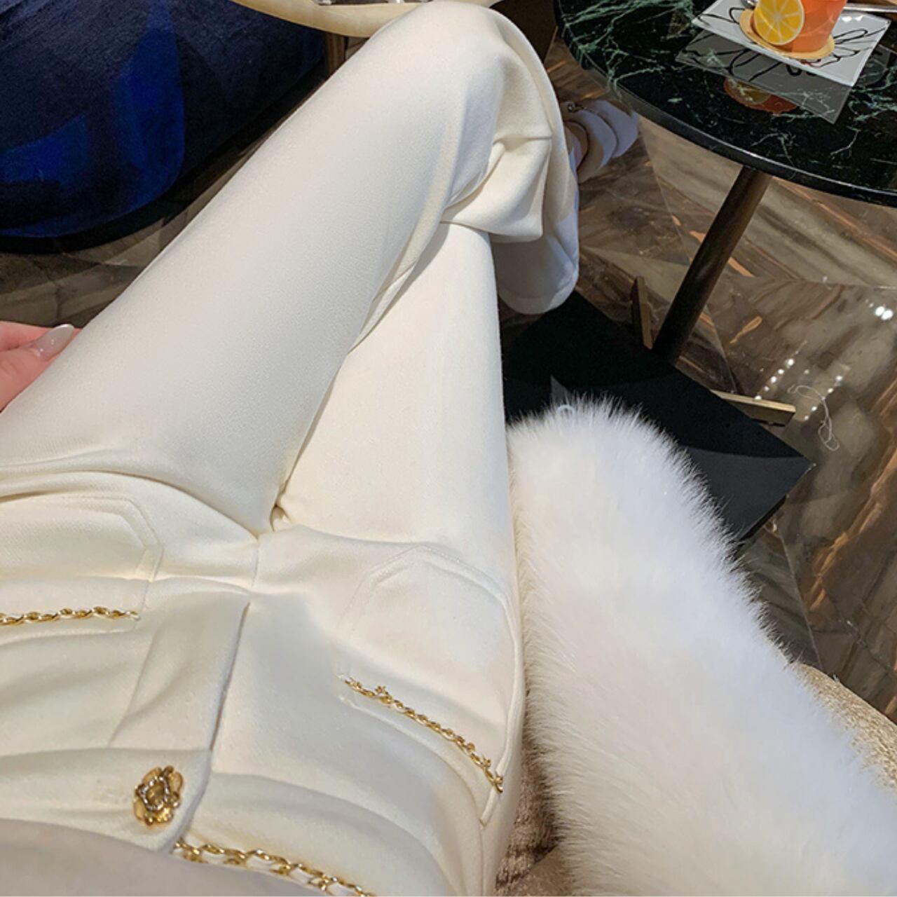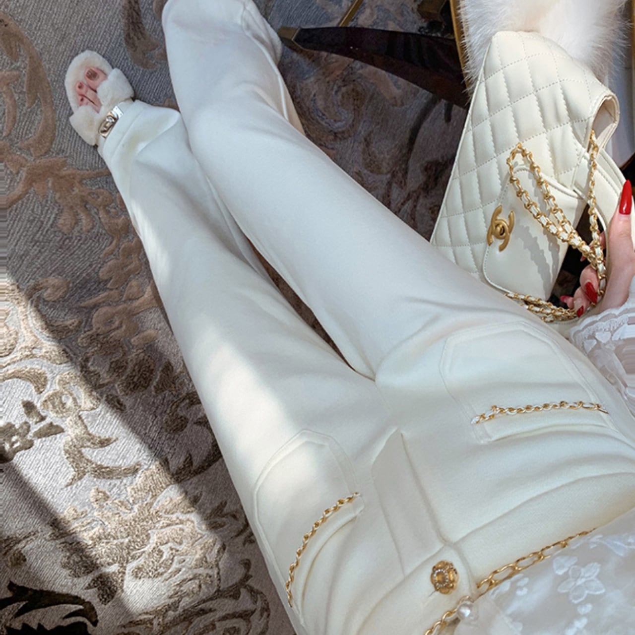 ハイウエスト設計で脚のラインを美しく見せ、きちんと感と女性らしさを両立したシルエットに。オフホワイトの優しい色合いが、冬のコーデをエレガントに引き立てます。