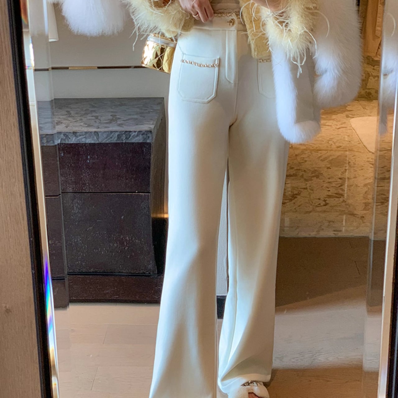 ゴールドチェーンのディテールが華やかさを添える、上品なフレアパンツ。