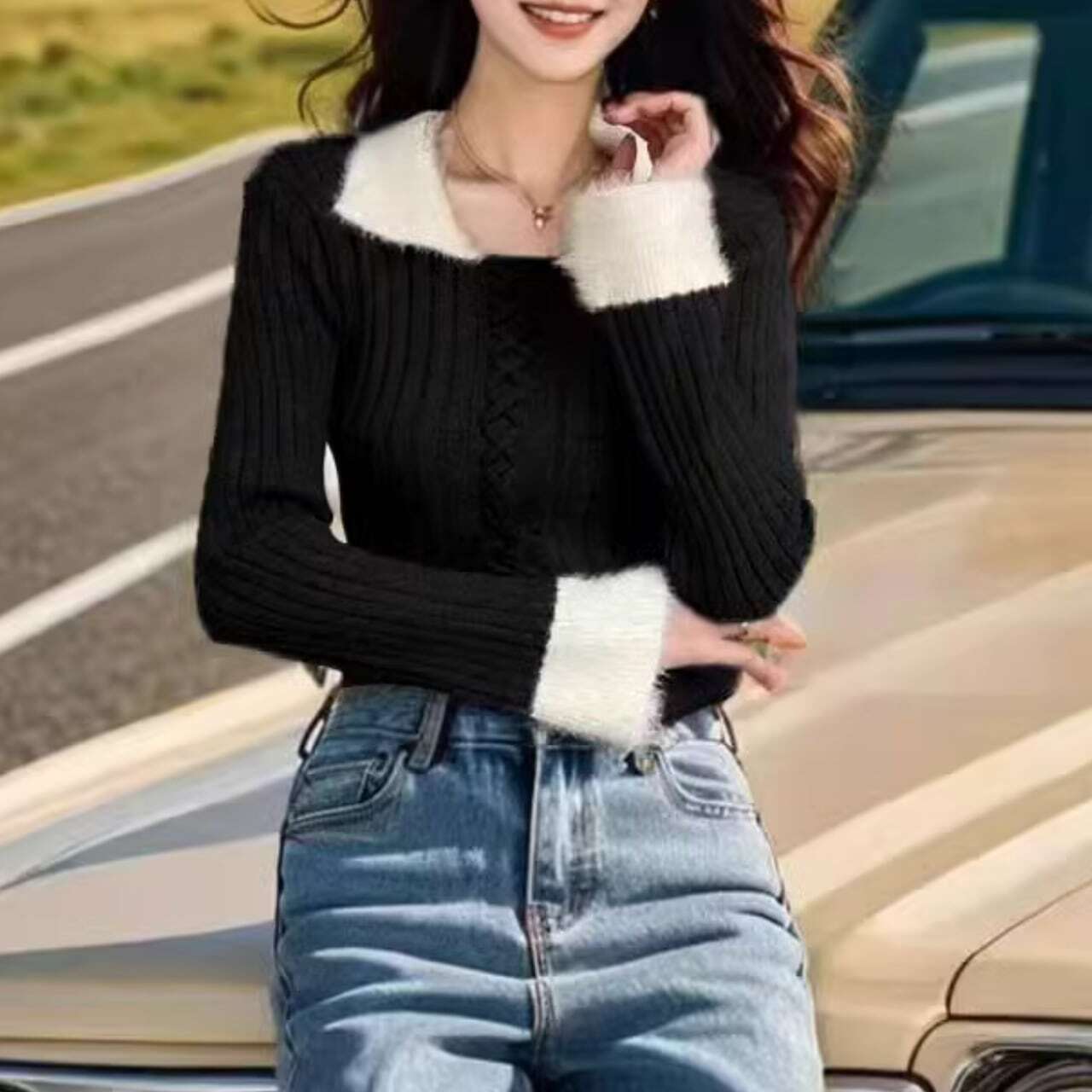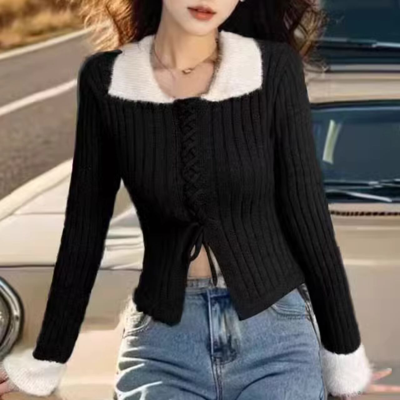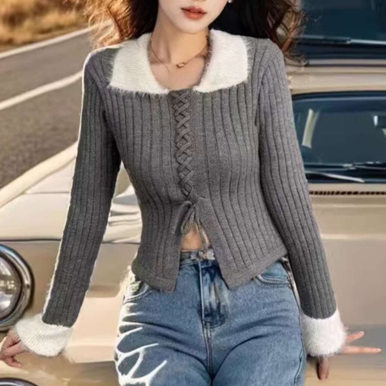 すっきりとしたシルエットに、襟元と袖口のふわふわのアクセントが甘さを添えます。