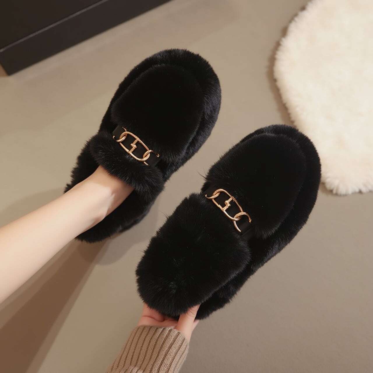 贅沢なフェイクファーとゴールドチェーンが上品なアクセント。ふんわり柔らかな履き心地と厚底デザインで、さりげなくスタイルアップを叶えます。カジュアルにもきれいめにも馴染む、大人の洗練スタイルにぴったりの一足です。