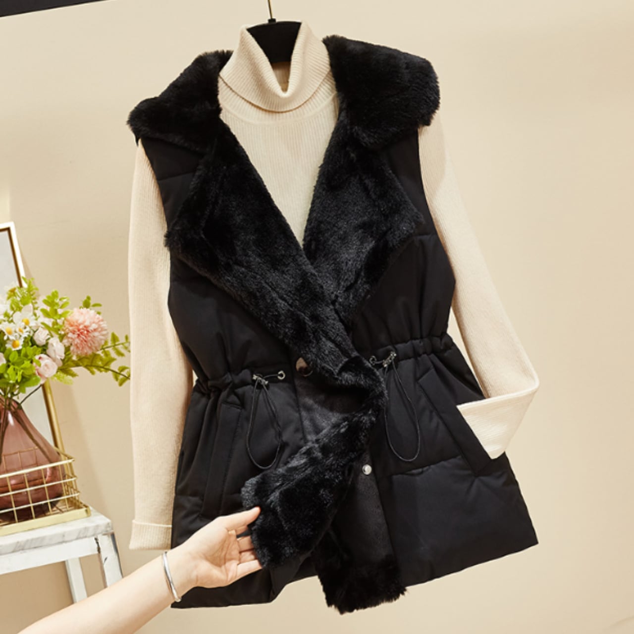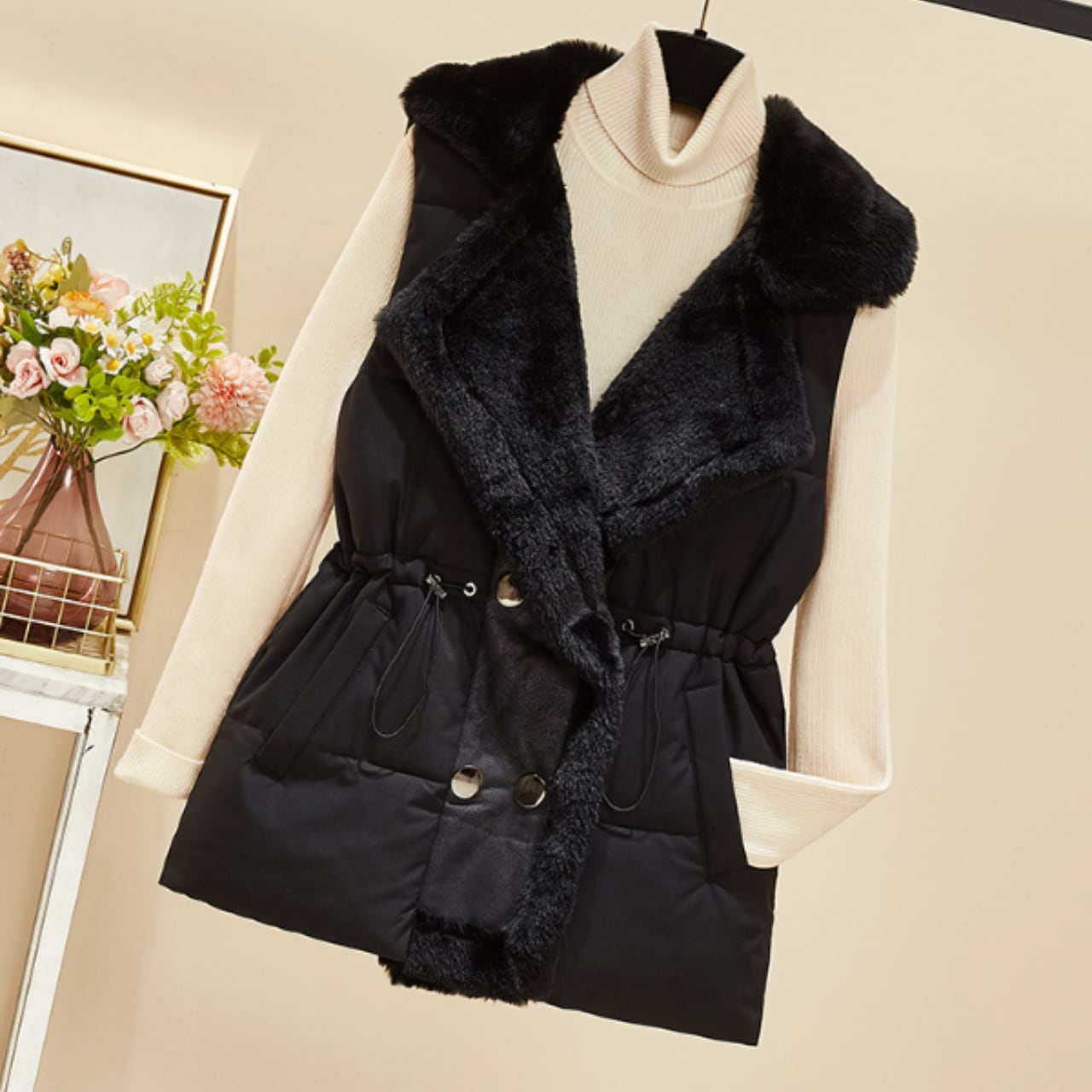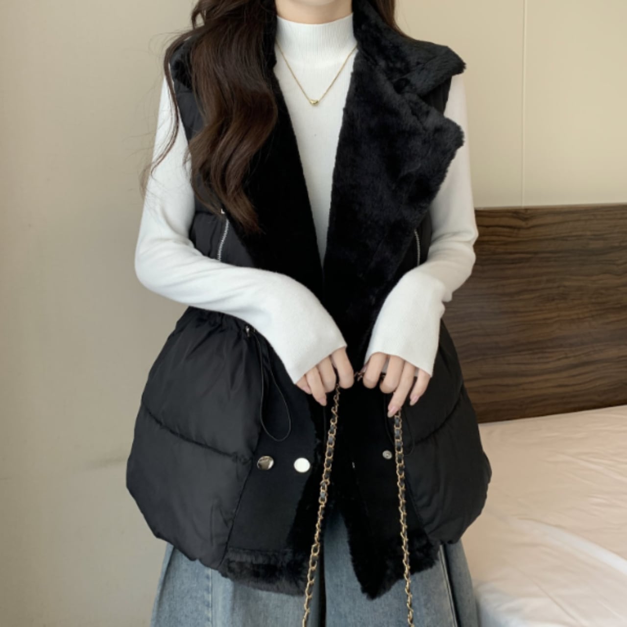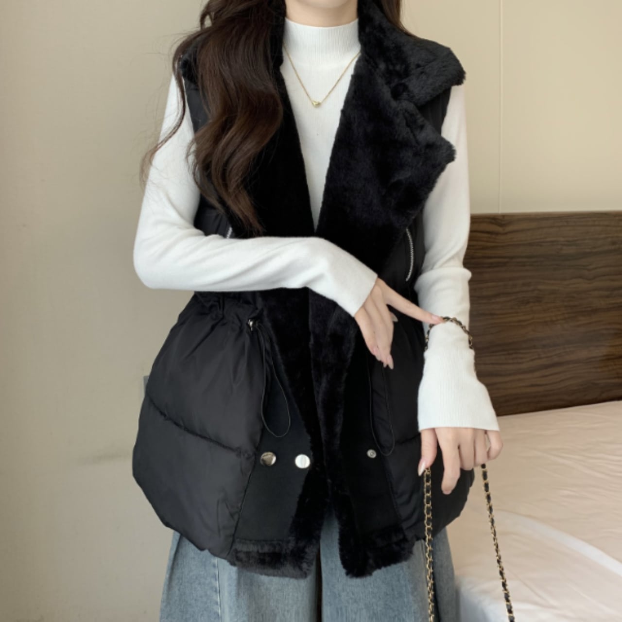 ふんわりとしたフェイクファーのショールカラーが上品な印象を与えるベスト。