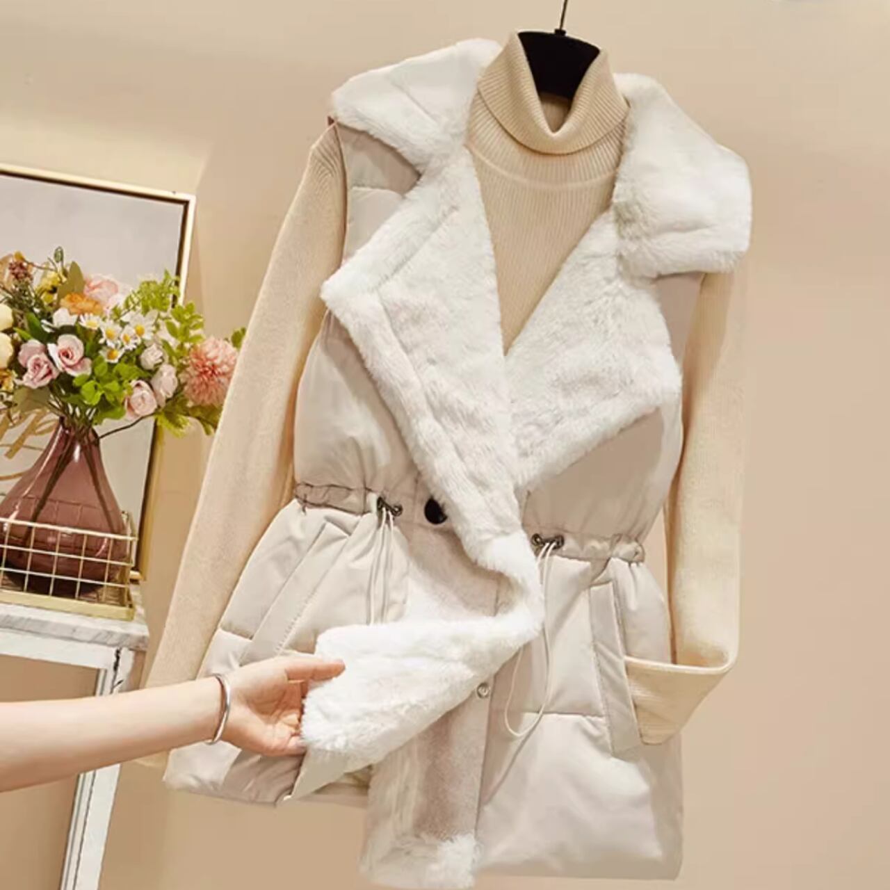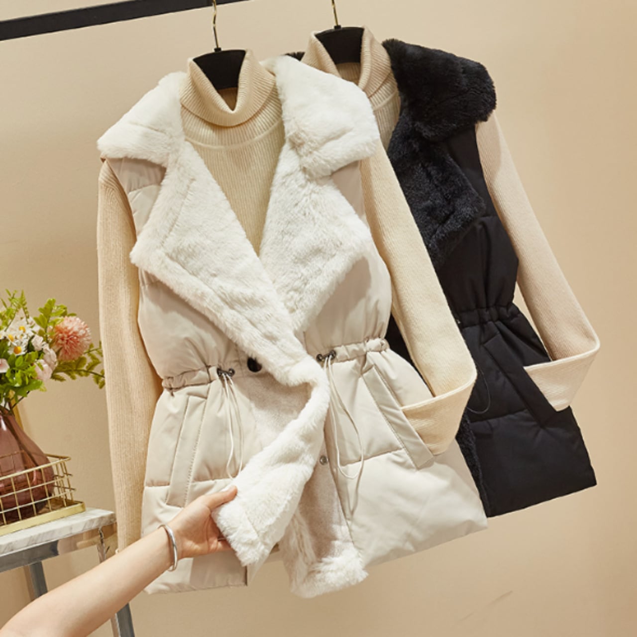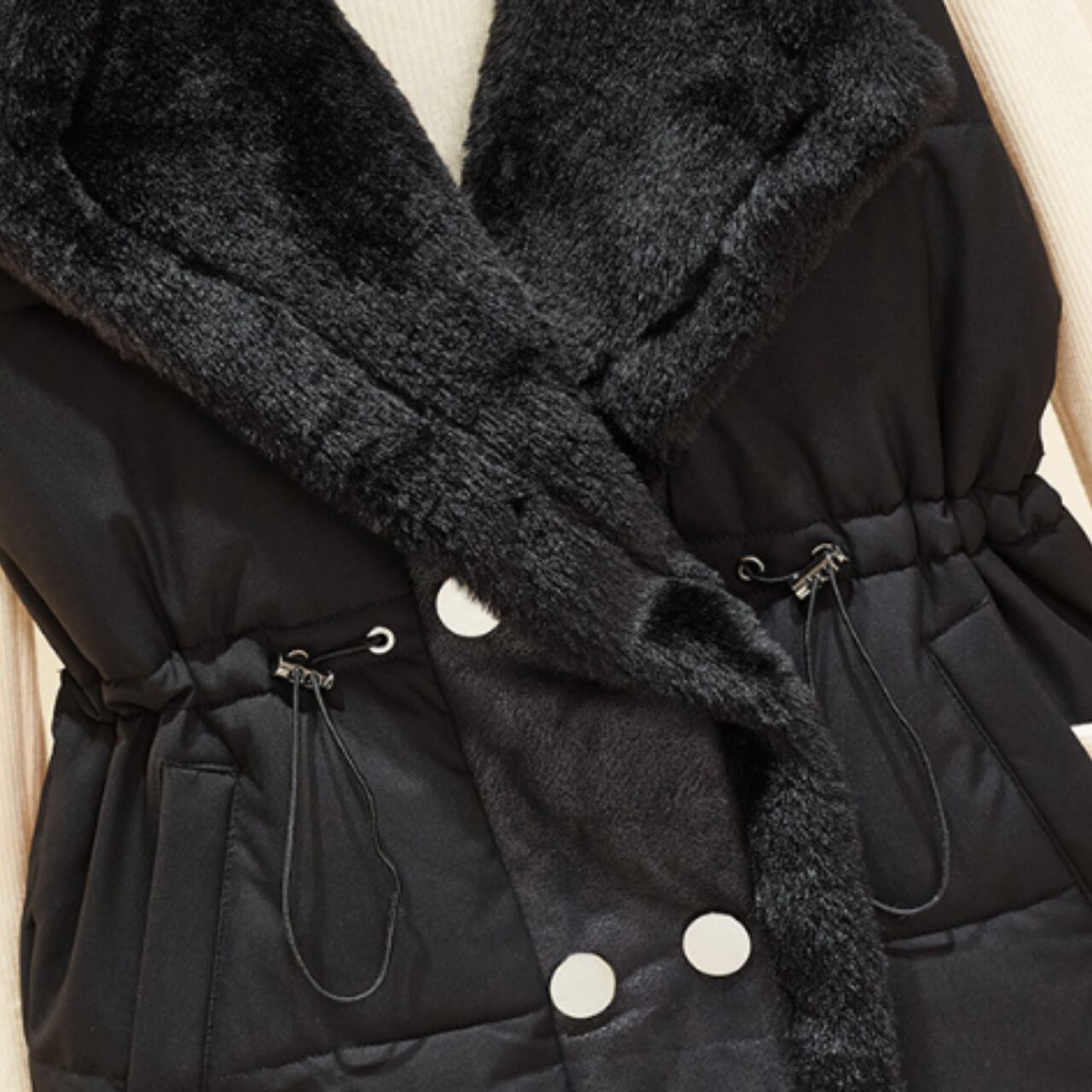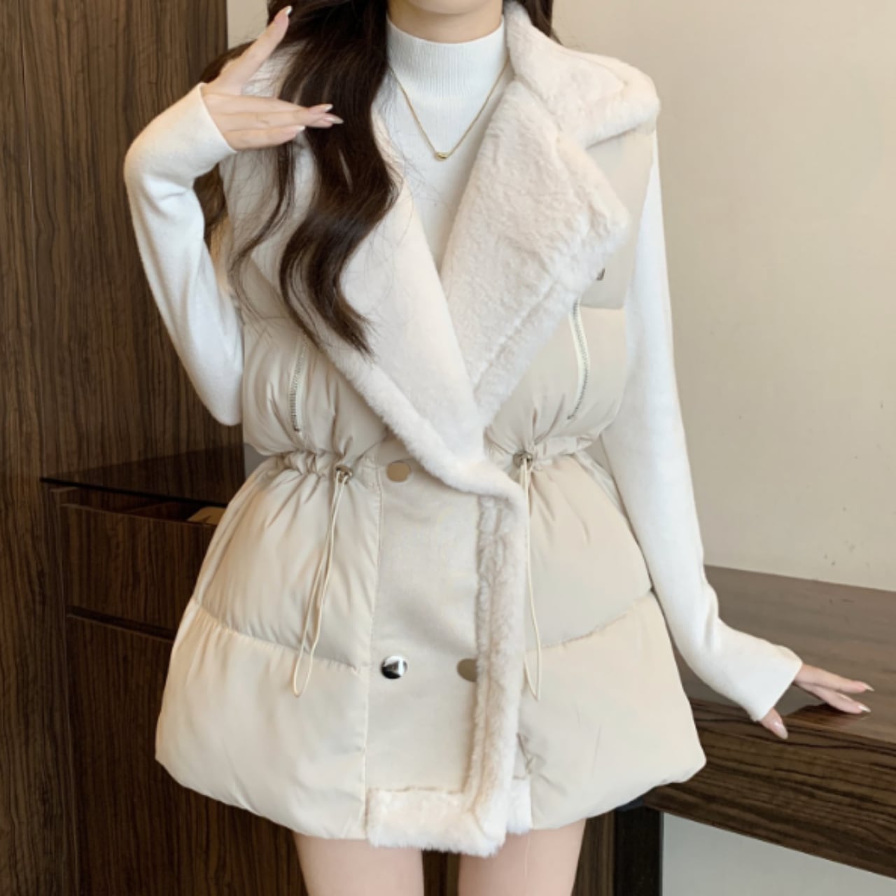 ふんわりとしたフェイクファーのショールカラーが上品な印象を与えるベスト。