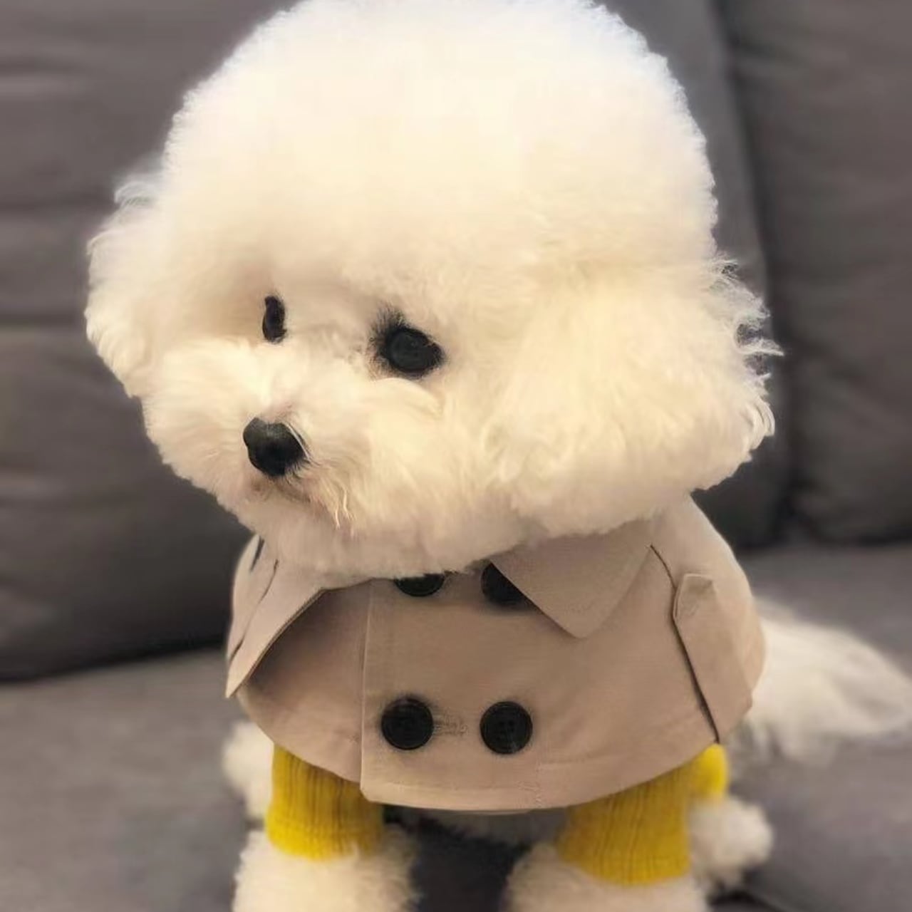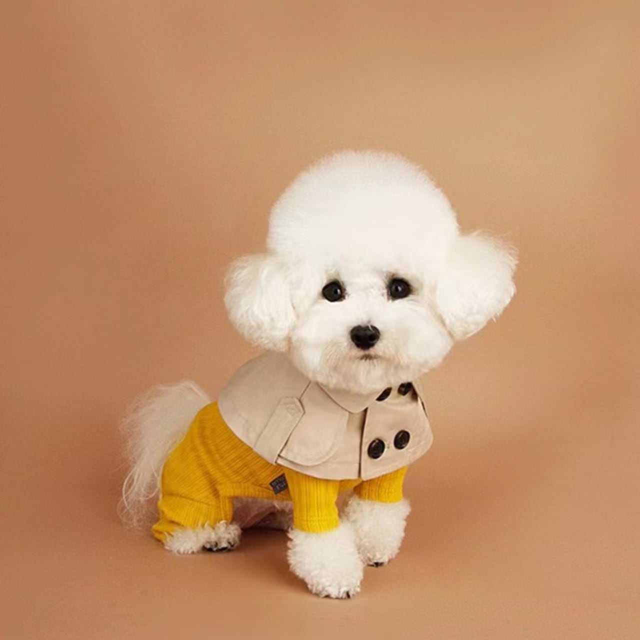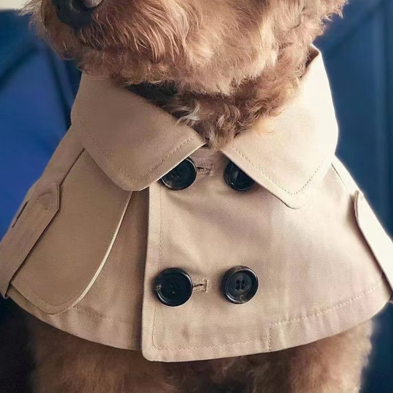 クラシカルなトレンチコート風デザインが魅力。フロントのダブルボタンと上品なベージュカラーが、愛犬の装いをエレガントに格上げします。軽やかな着心地で動きやすく、普段のお散歩はもちろん、特別なお出かけや写真撮影にもぴったり。シンプルながら洗練されたデザインで、季節を問わずおしゃれを楽しめる一着です。