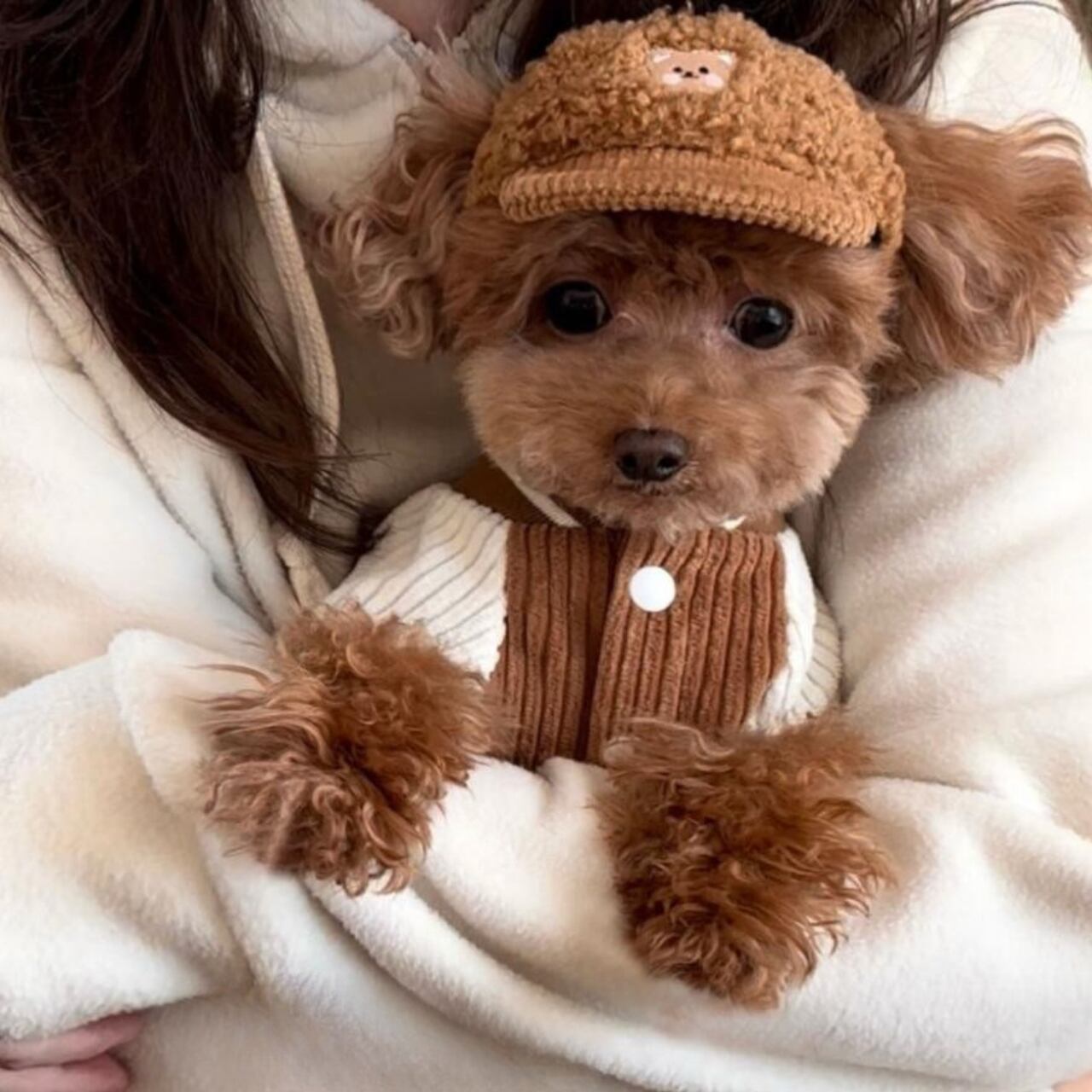 カジュアルさの中に上品さをプラスした、ジャケット風の犬用ニットウェア。