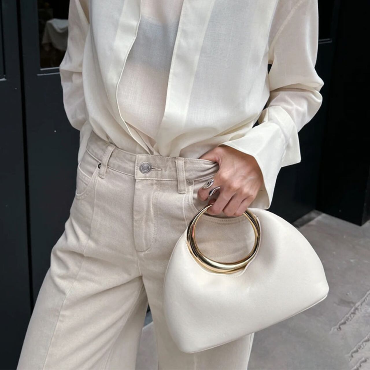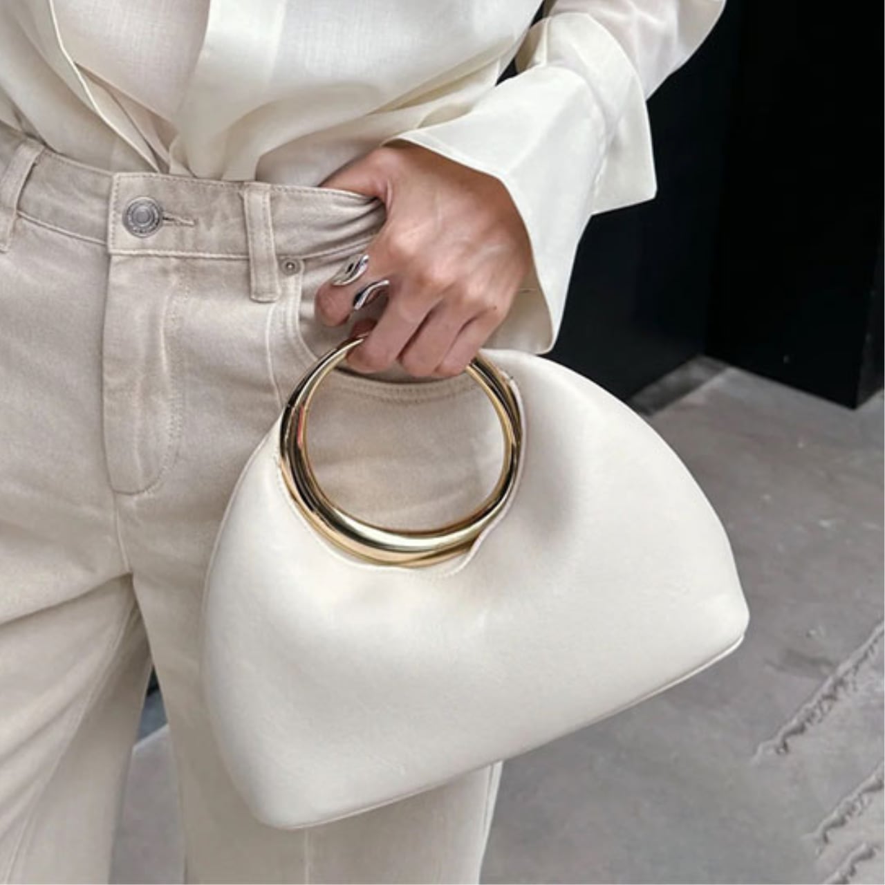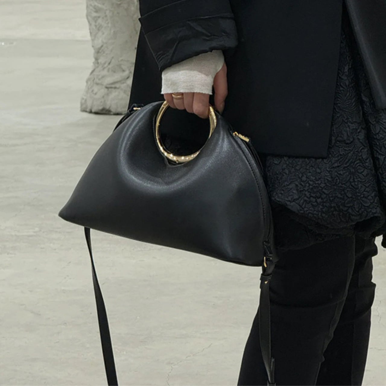 上品なシェル型フォルムに、存在感のあるゴールドのリングハンドルをあしらったハンドバッグ。