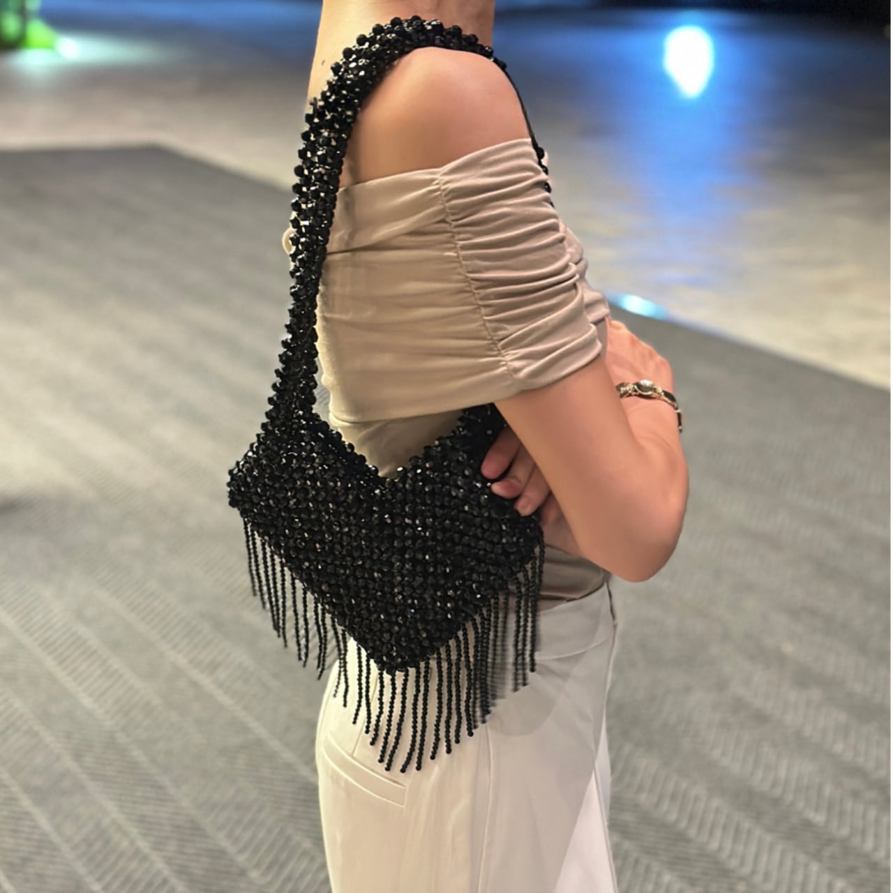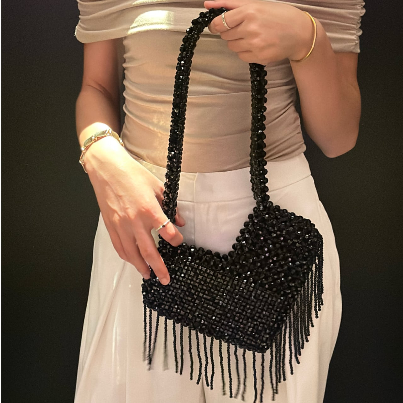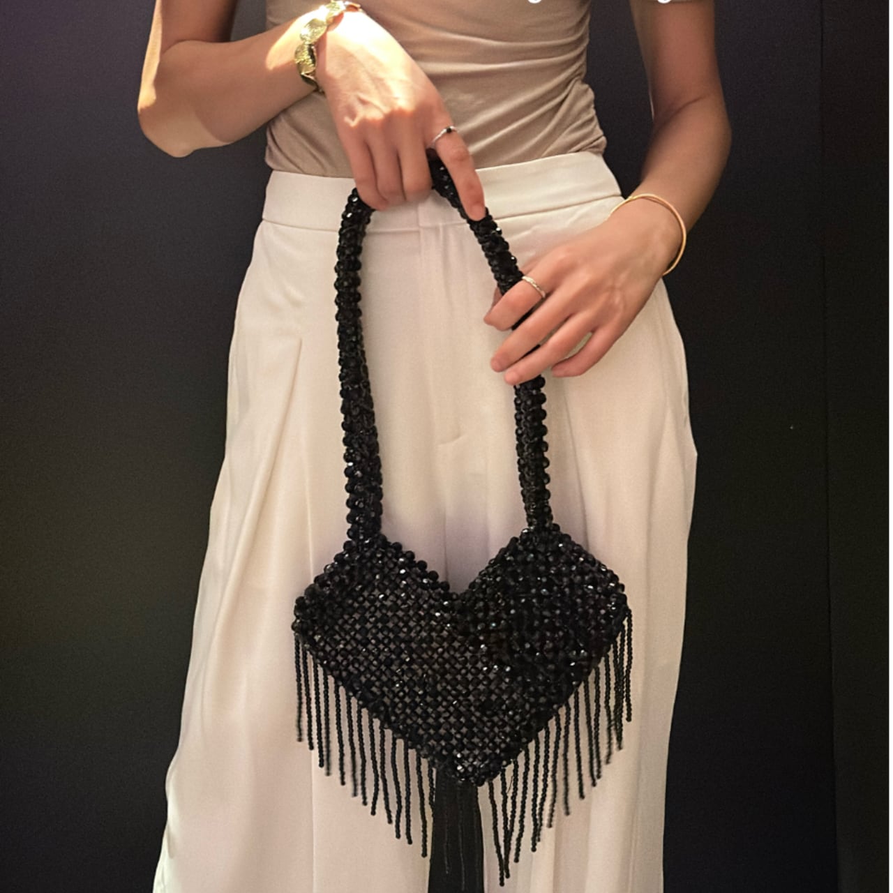 キラキラと輝くビジューをぎゅっと詰め込んだ、ハートシルエットのフリンジバッグ。