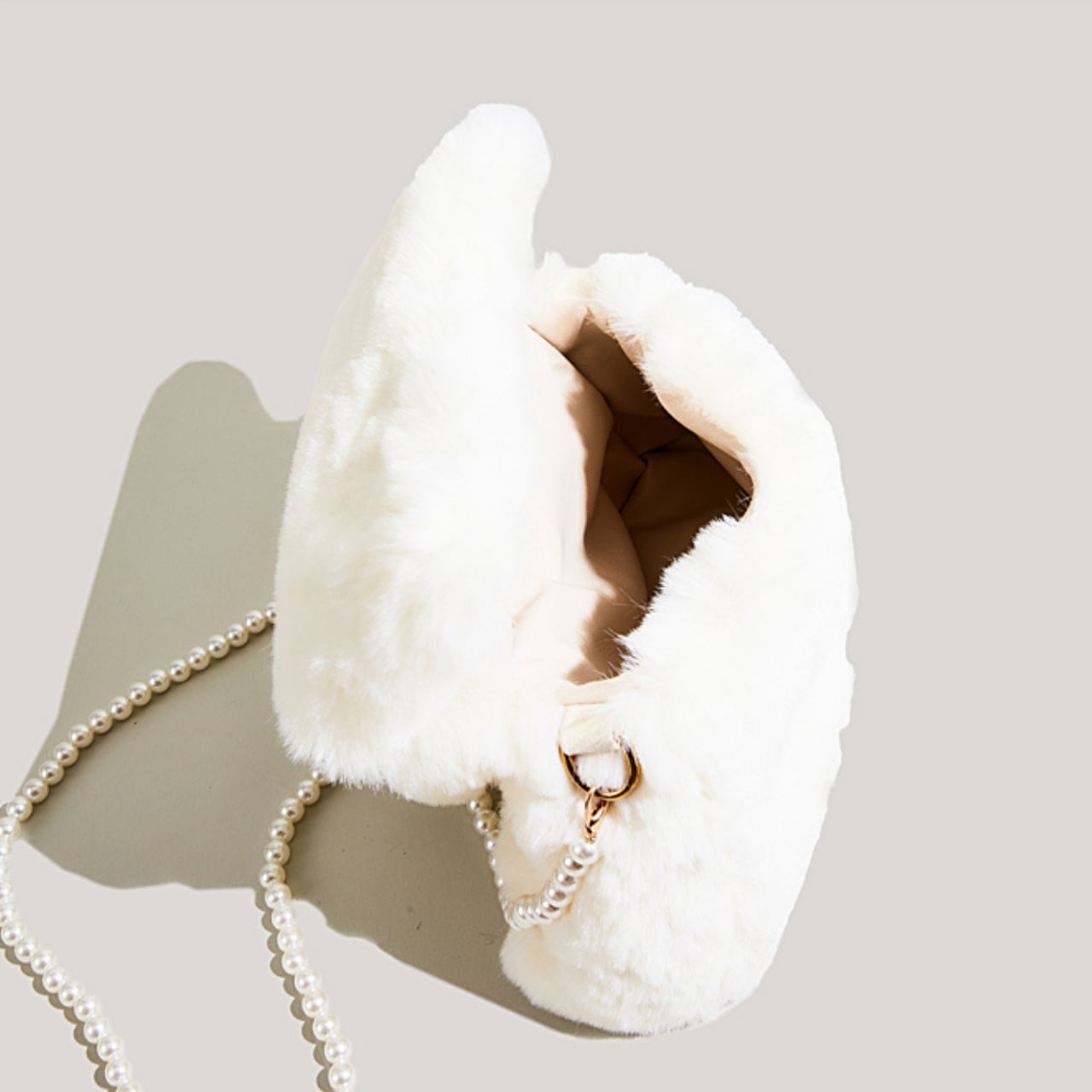 ふわふわのフェイクファー素材に、上品なパールチェーンを組み合わせたミニバッグ。