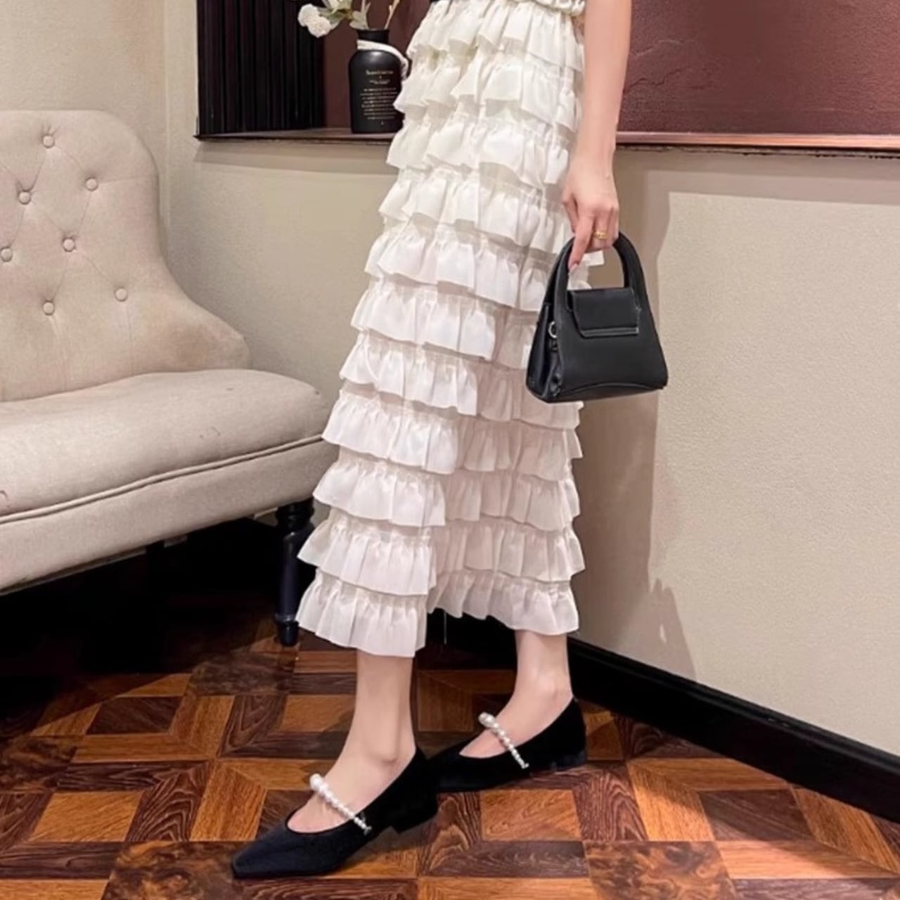 上品で洗練された印象を与える、パールストラップ付きのフラットパンプス。一粒一粒のパールがさりげなく輝き、コーディネートに華やぎをプラス。軽やかで柔らかな履き心地が魅力で、特別な日にも日常にも寄り添う一足です。