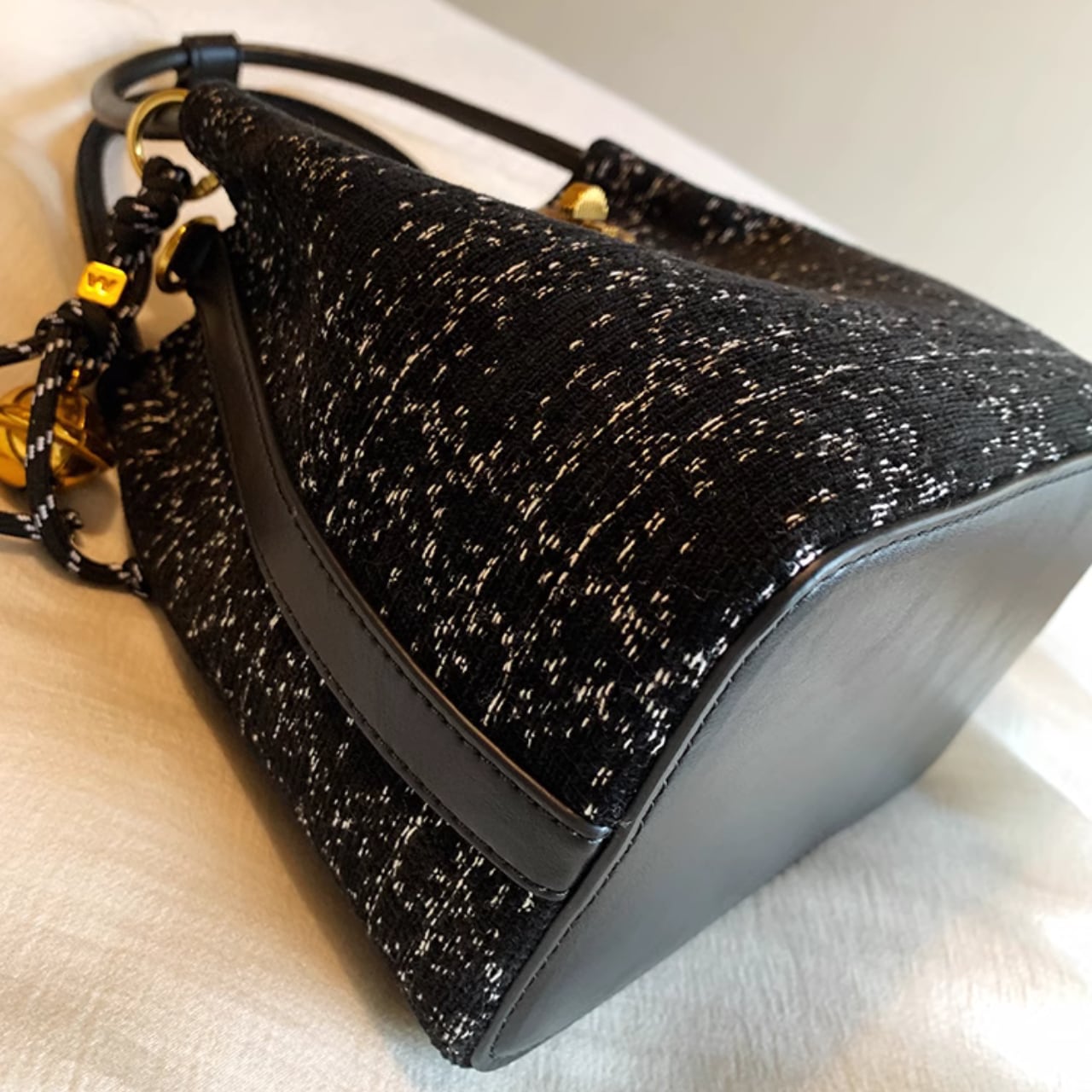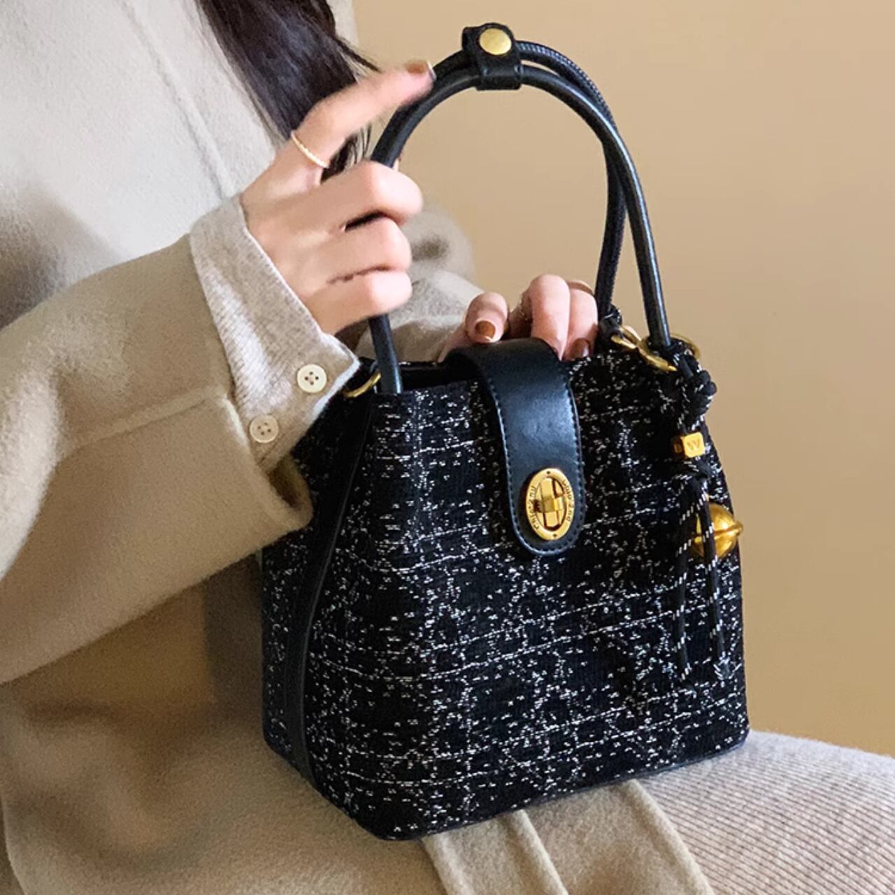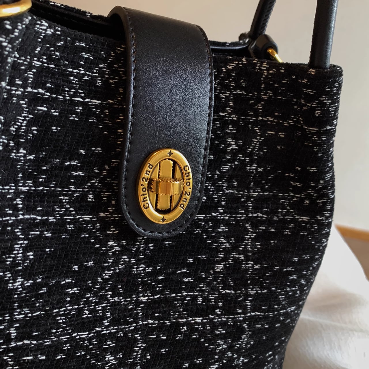 ツイード素材の上品な風合いと、ゴールドのアクセントが目を引くエレガントなミニバッグ。