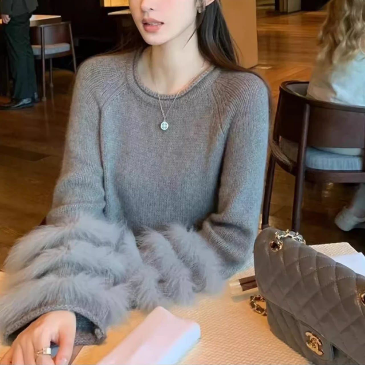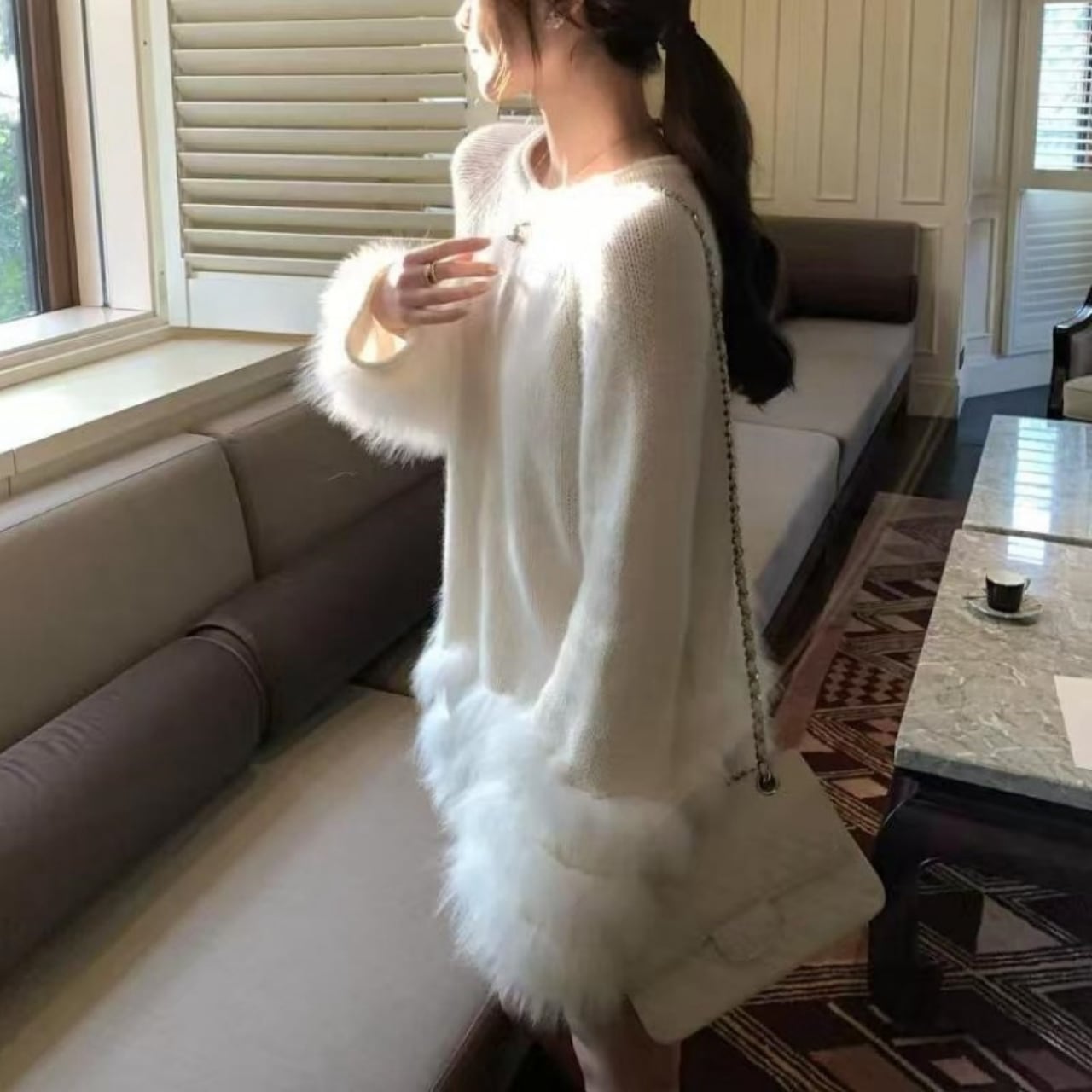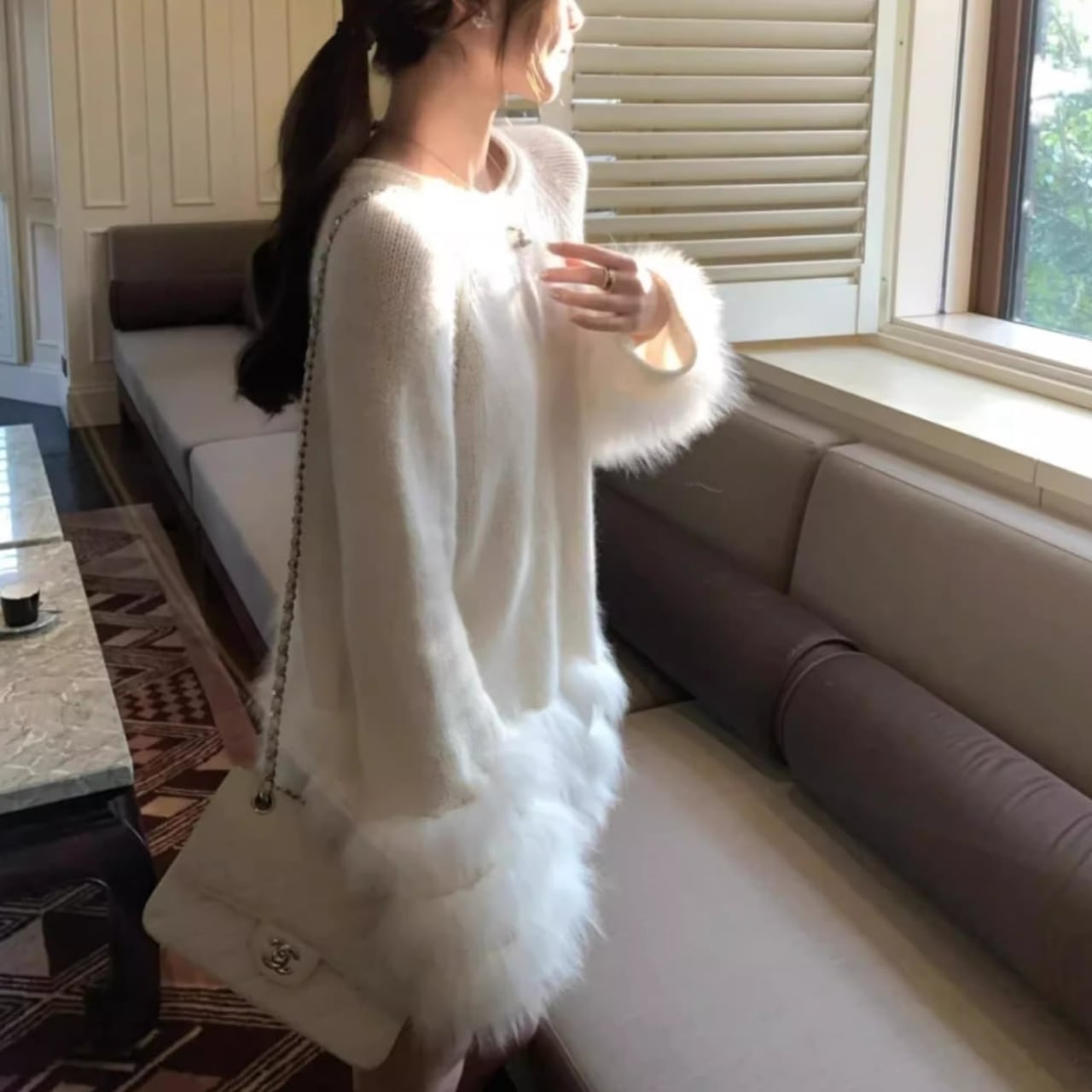 柔らかなニット素材がふんわりと身体を包み込み、女性らしい優しい雰囲気を演出します。